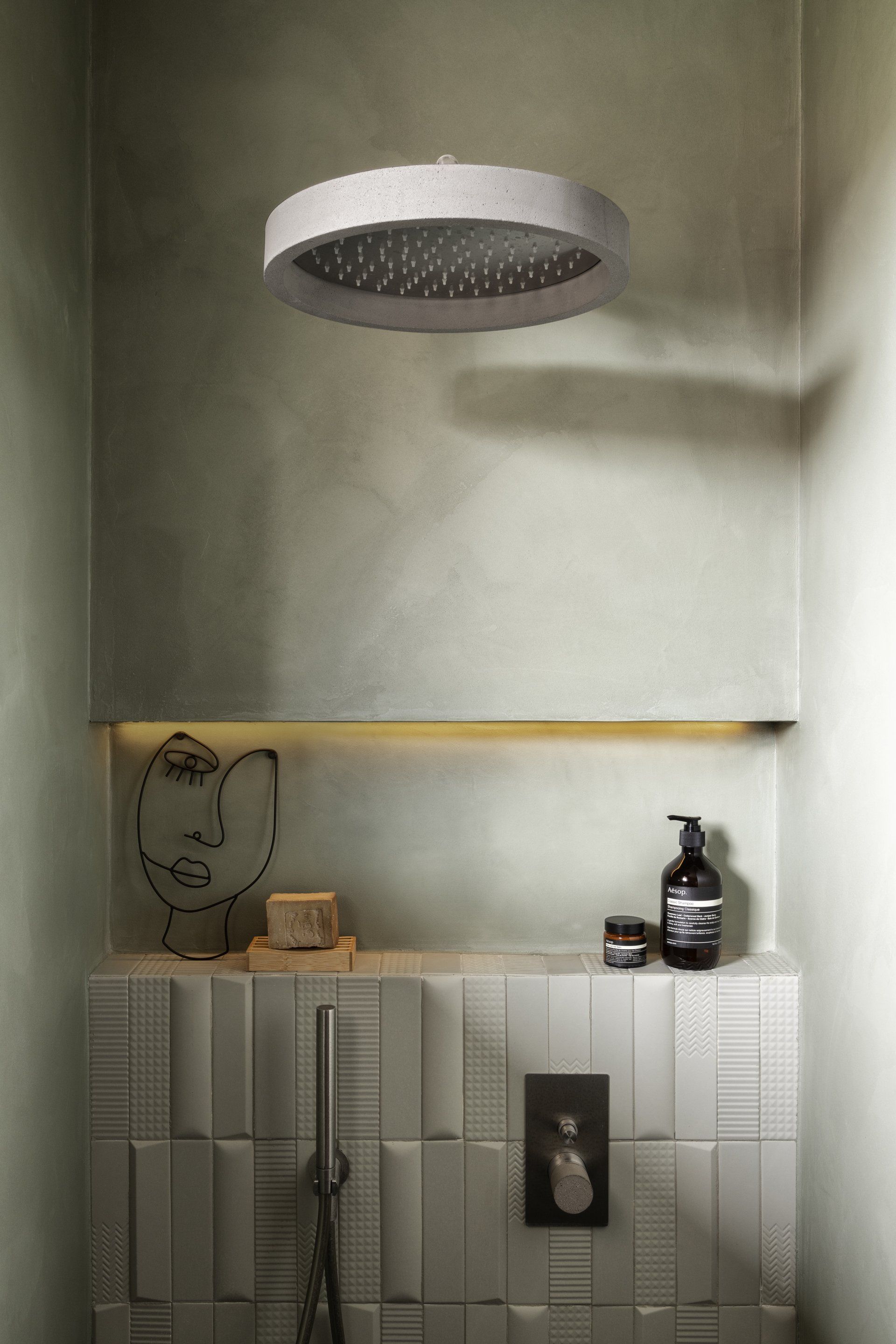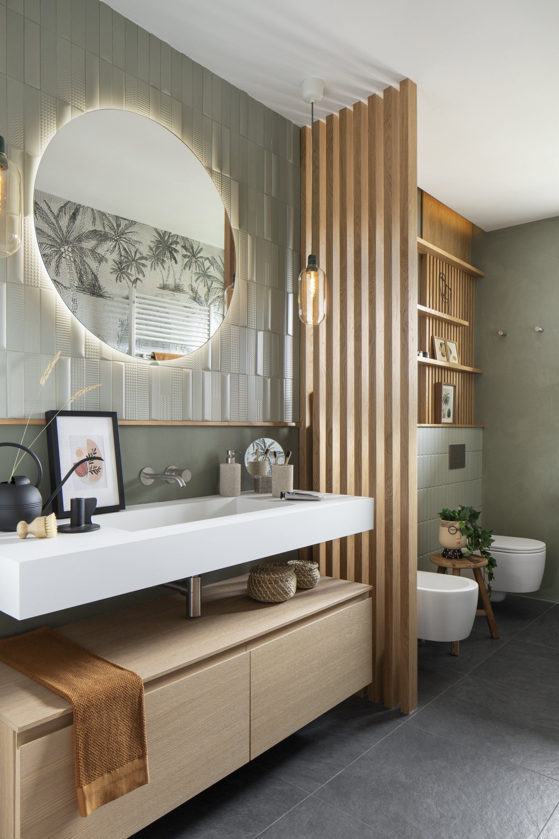 Materials, colours and textures have been chosen to help the reconnection with nature. The use of sage green infuses a feeling of balance and regeneration, associated with natural oak wood and the wallpaper "Exotic dream" by Londonart that reminds of pristine places. The design choice was to enhance the long walls of this bathroom in which one is reflected in the other. The left side holds the large fenix and oak washbasin, separated from the sanitary area through the oak divider. This wall was imagined as a sort of chessboard, where the two-dimensional enamel was associated with the three-dimensional tiles "Biscuit" from 41zero42, creating vertical and horizontal sections through the use of wood. The large circular mirror reflects the fiberglass wallpaper that occupies the entire front wall. The walk-in shower, designed as a real relaxation space, occupies the entire bottom of the room for a comfortable and pleasant use.