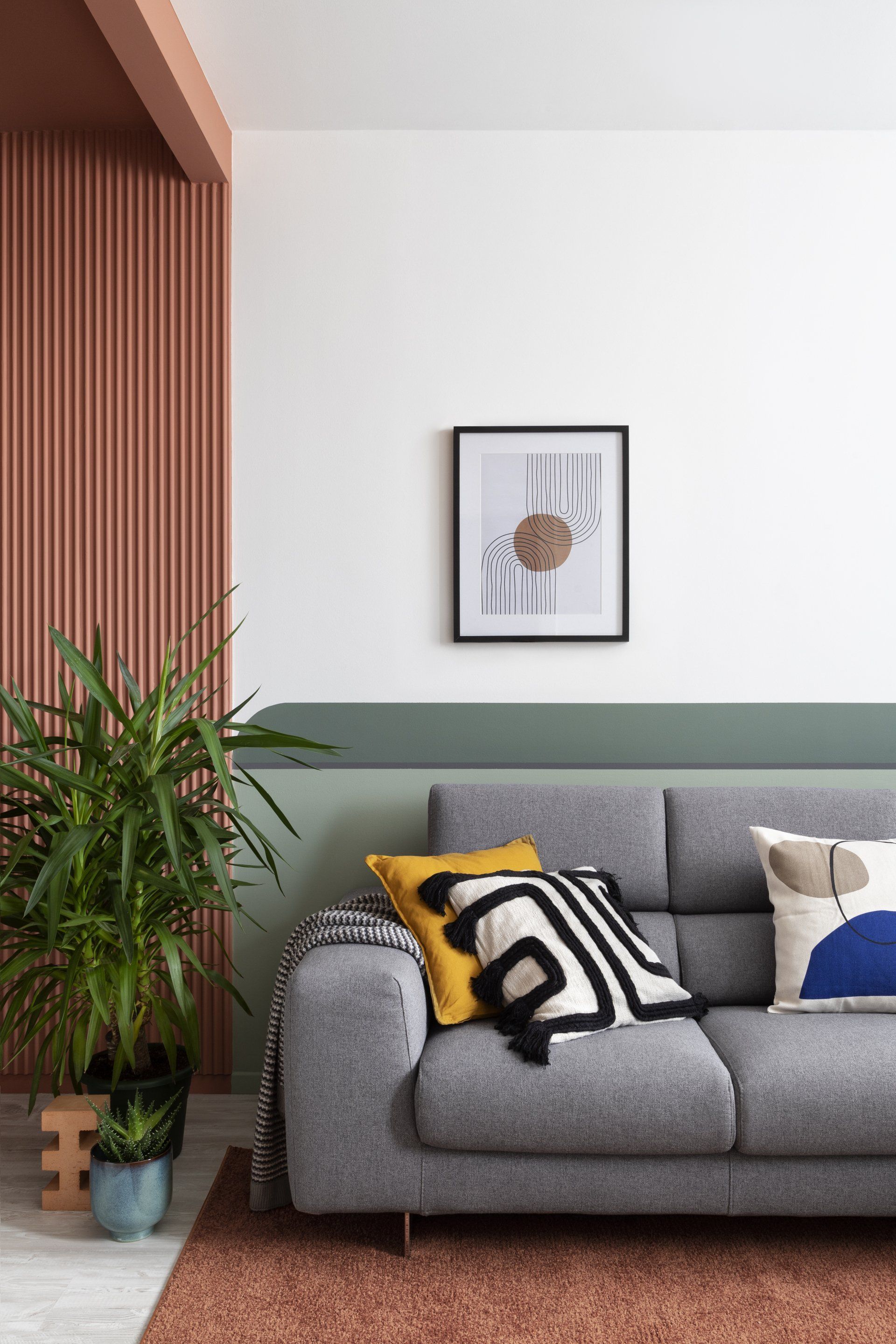 The pine green of the living room, used in two shades, expresses regeneration and rebirth, urging us to breathe more deeply and instilling trust and security. It favours blood pressure reduction by stimulating the pituitary gland, which is ideal for the living area! The palette also includes the white colour, which acts as a neutral canvas and contributes to lighten the environment by providing balance and serenity.