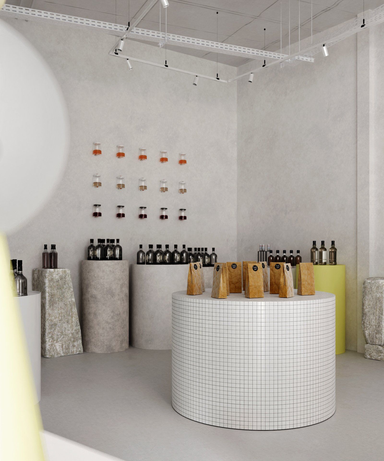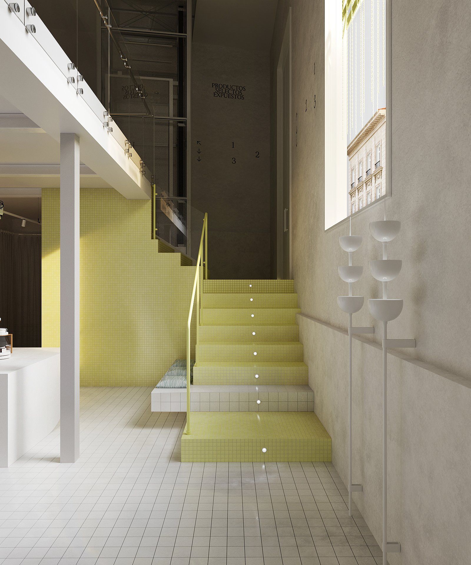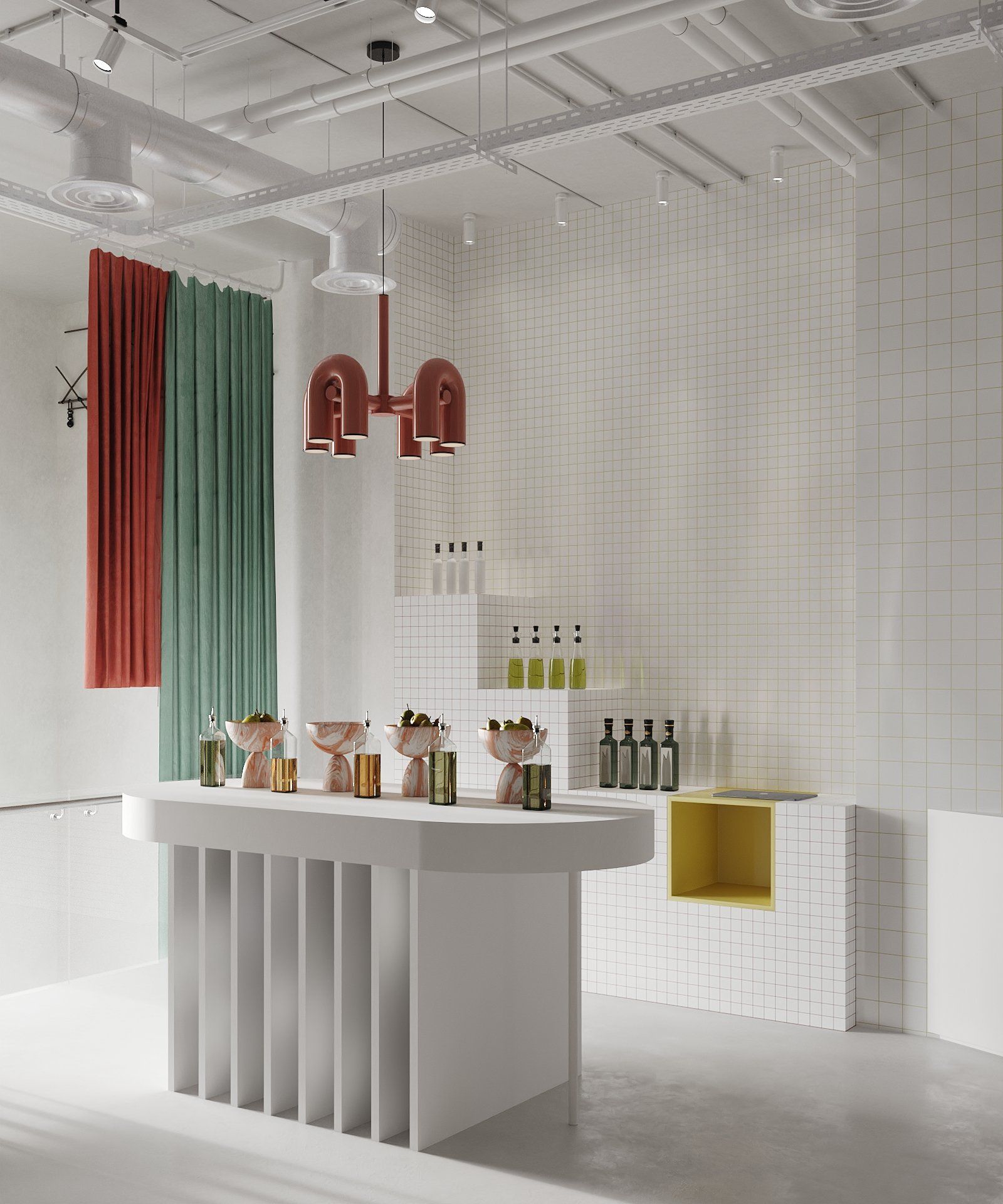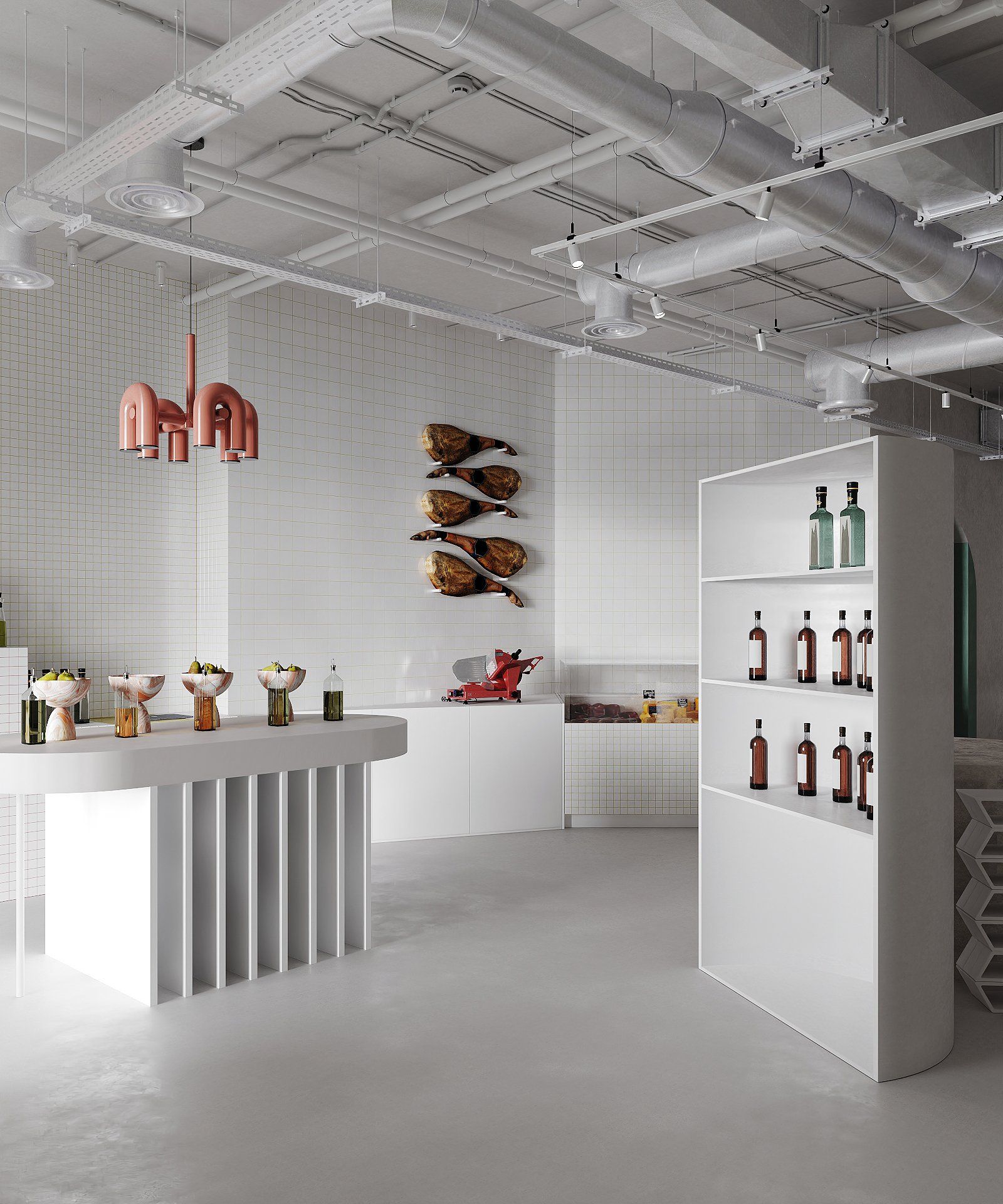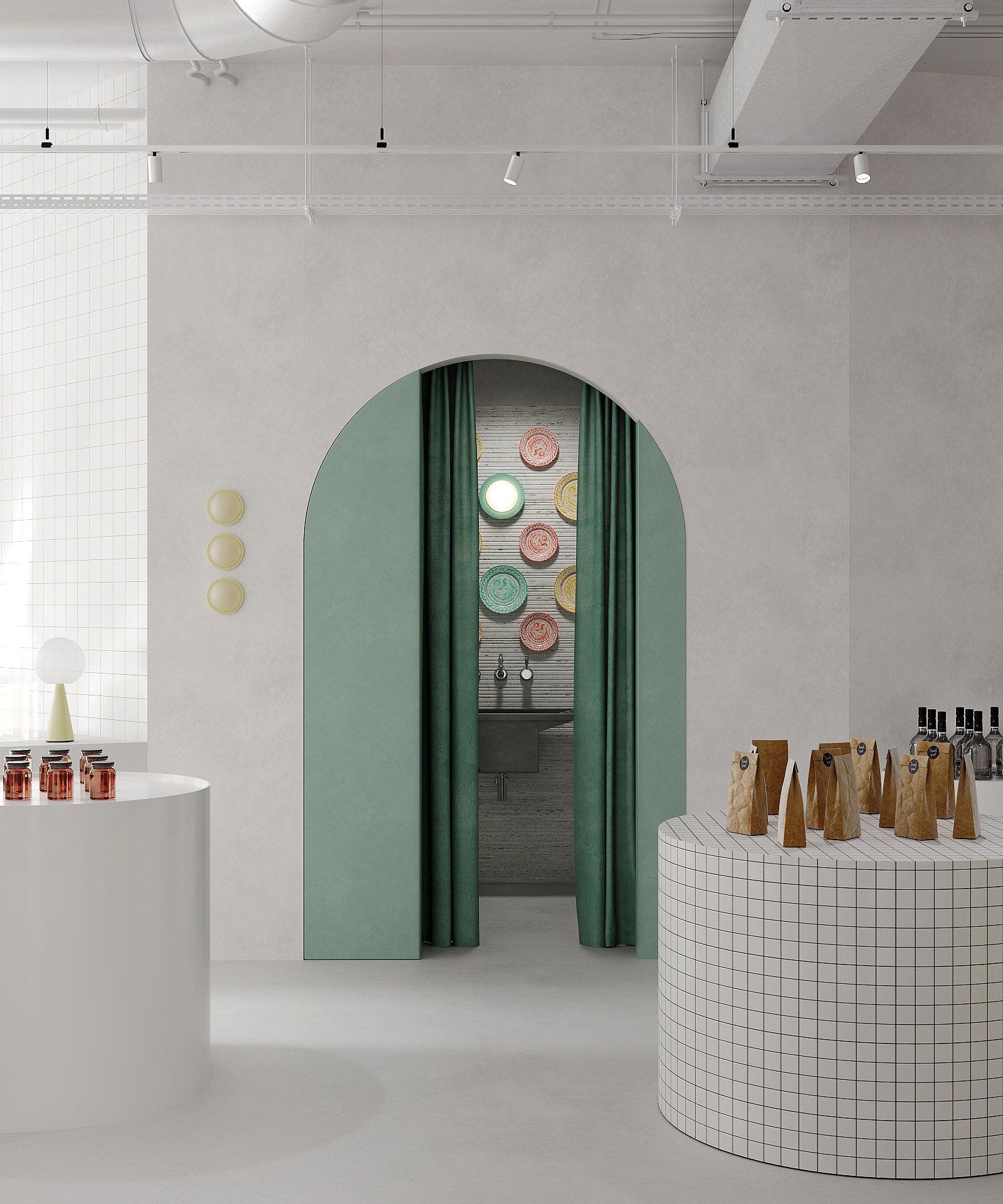 Altelier is a space dedicated to the sale of select products. The product is colorful and its packaging has different formats. These features were taken into account for the final design. Food is the star of the store. The finishes of the interior architecture orbit around these spotlights, being neutral and respectful in a soft color palette composed of washed white, yellow and blue-green tones.