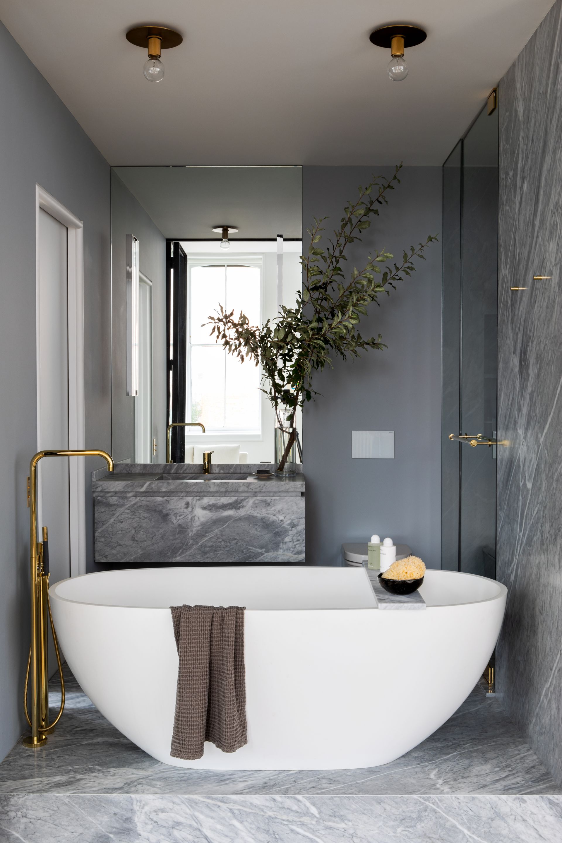 Another mirrored set of doors opens into a kitchen where matte figurative marble and patinated brass millwork play off of the loft’s new wide-plank oak floors. Behind a sliding partition off the entryway, a second bathroom is enveloped in veined marble with accents of bright metallics.
