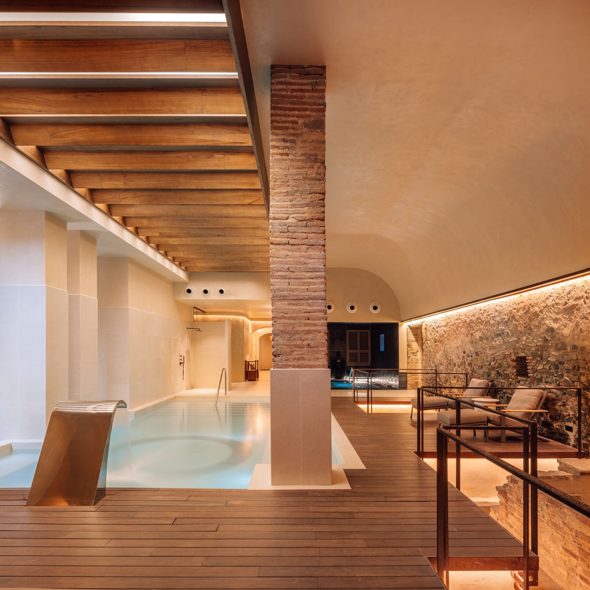 The Spa is an intimate experience where smooth and warm materials adorn the space. During the excavation in the spa, ruins from the 18th century were discovered so the general intervention was to respect the history and create a contemporary dialogue that kept the context protected yet met the needs for a warm and serene refuge. A duality between old and new.