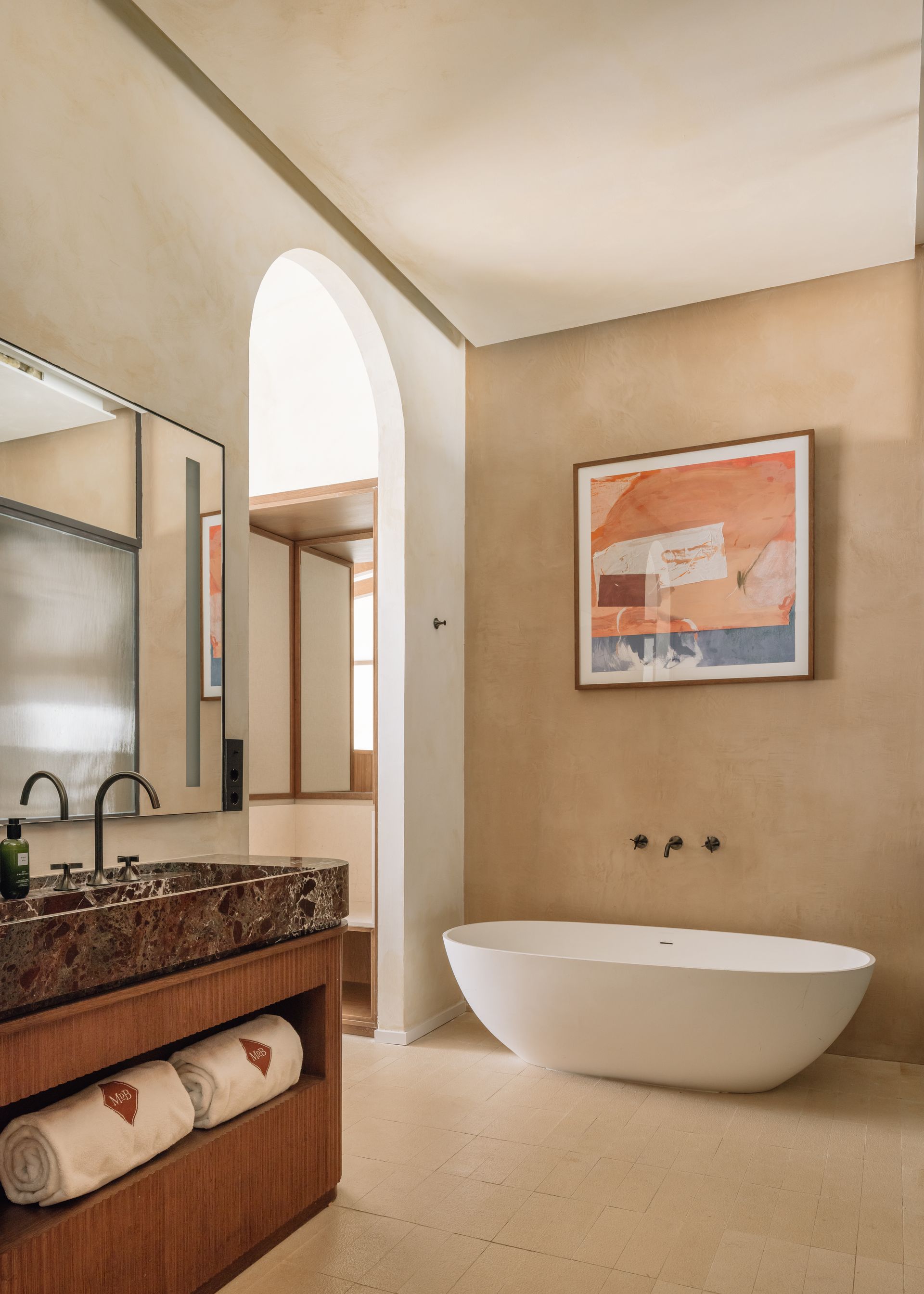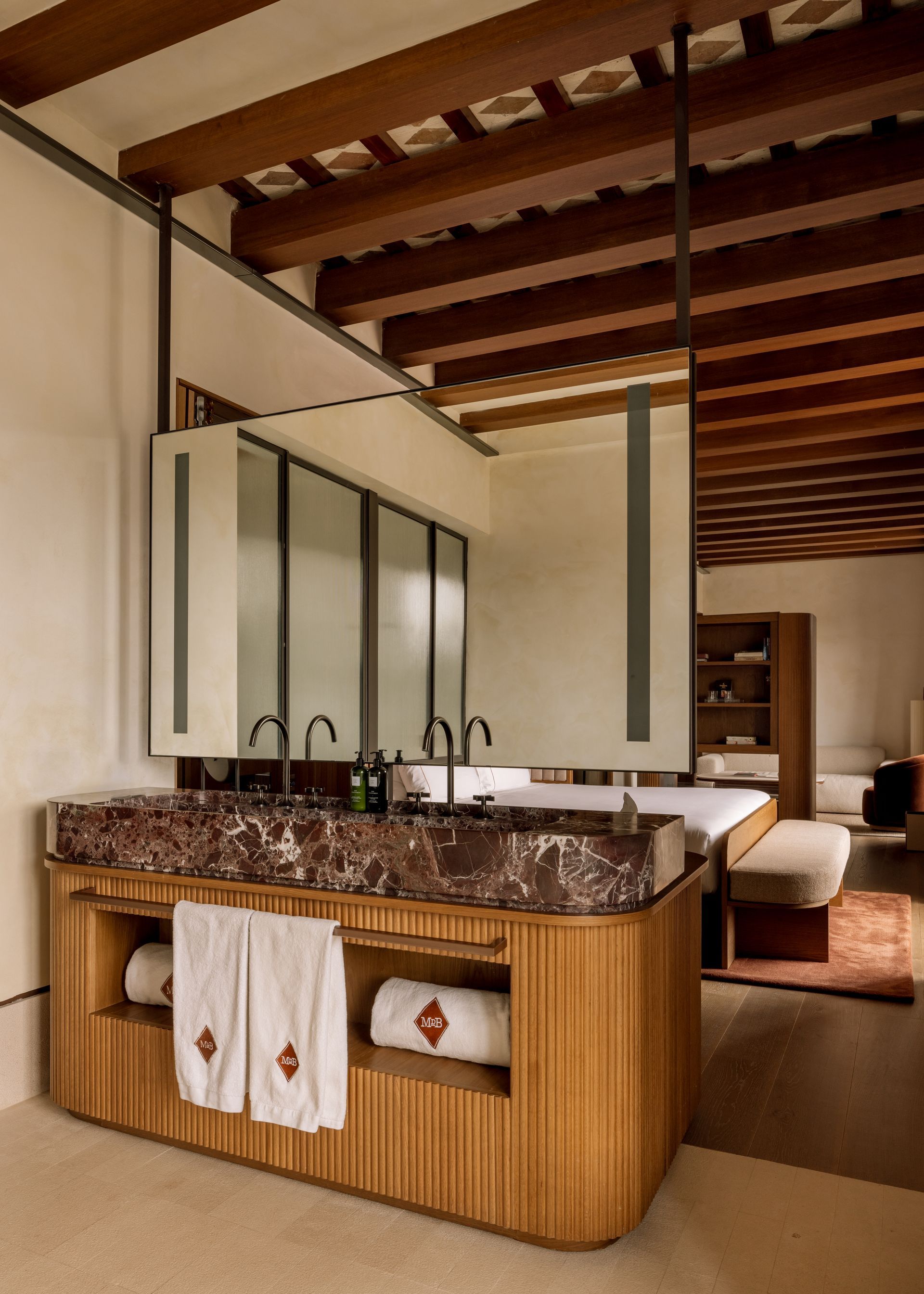 The hotel’s rooms are designed as tranquil sanctuaries where serenity and sophistication converge. A curated palette of noble materials—including oak wood, stucco, stone, and red marble—establishes rich yet harmonious tones, enhancing the sense of warmth and timelessness. The recurring use of arches as room dividers adds continuity, while the open-concept bathrooms break with traditional layouts, offering guests uninterrupted views of the surrounding landscape.