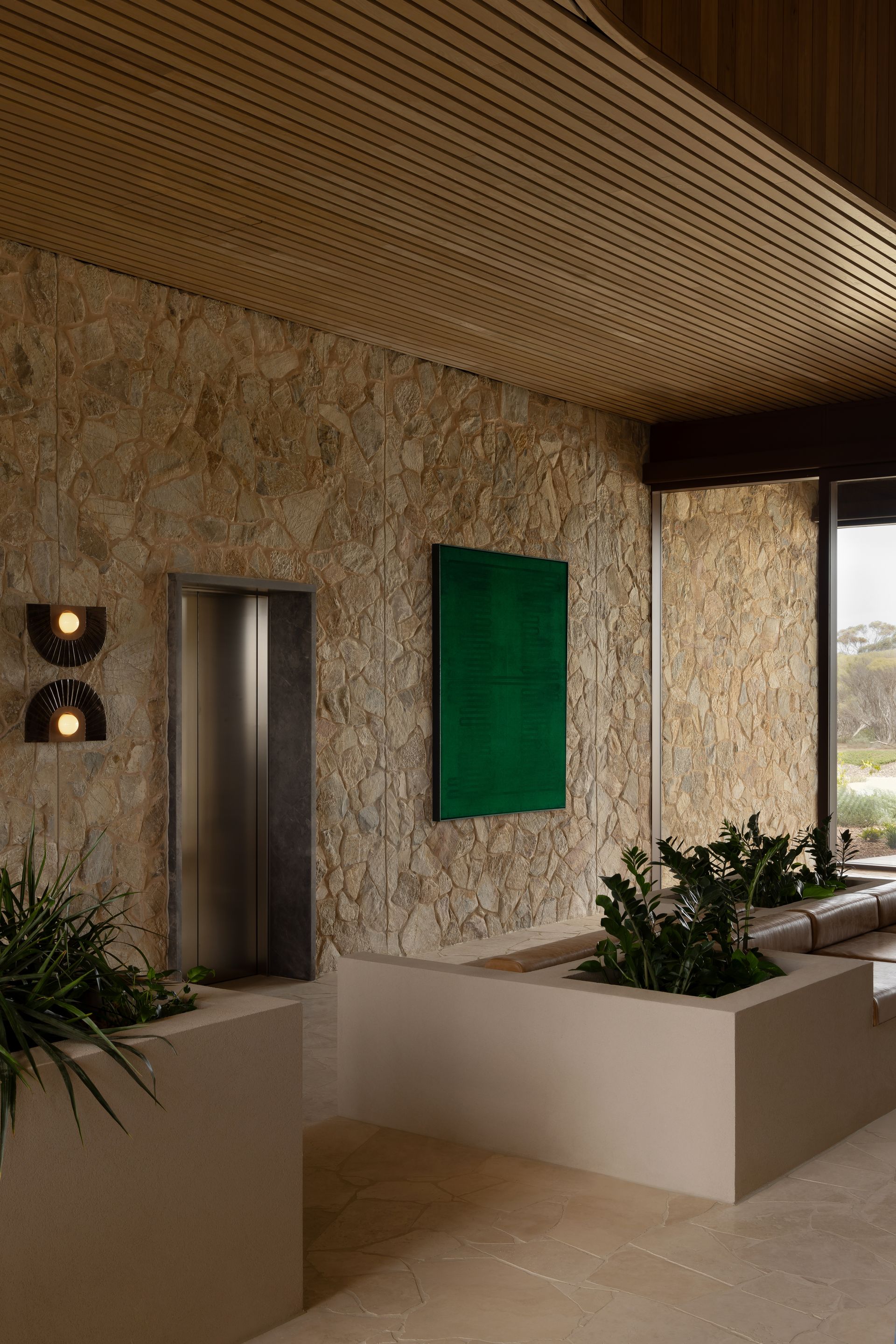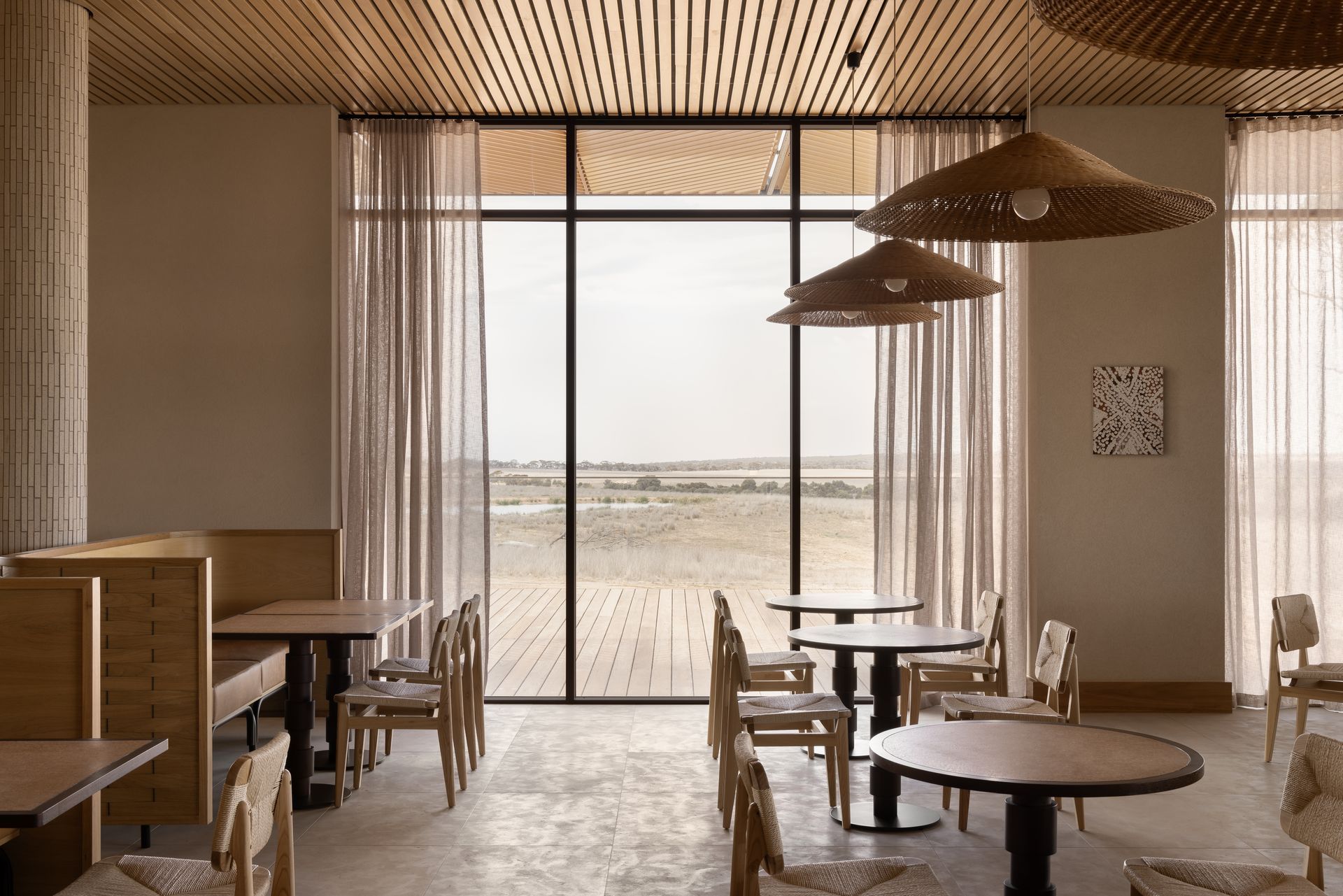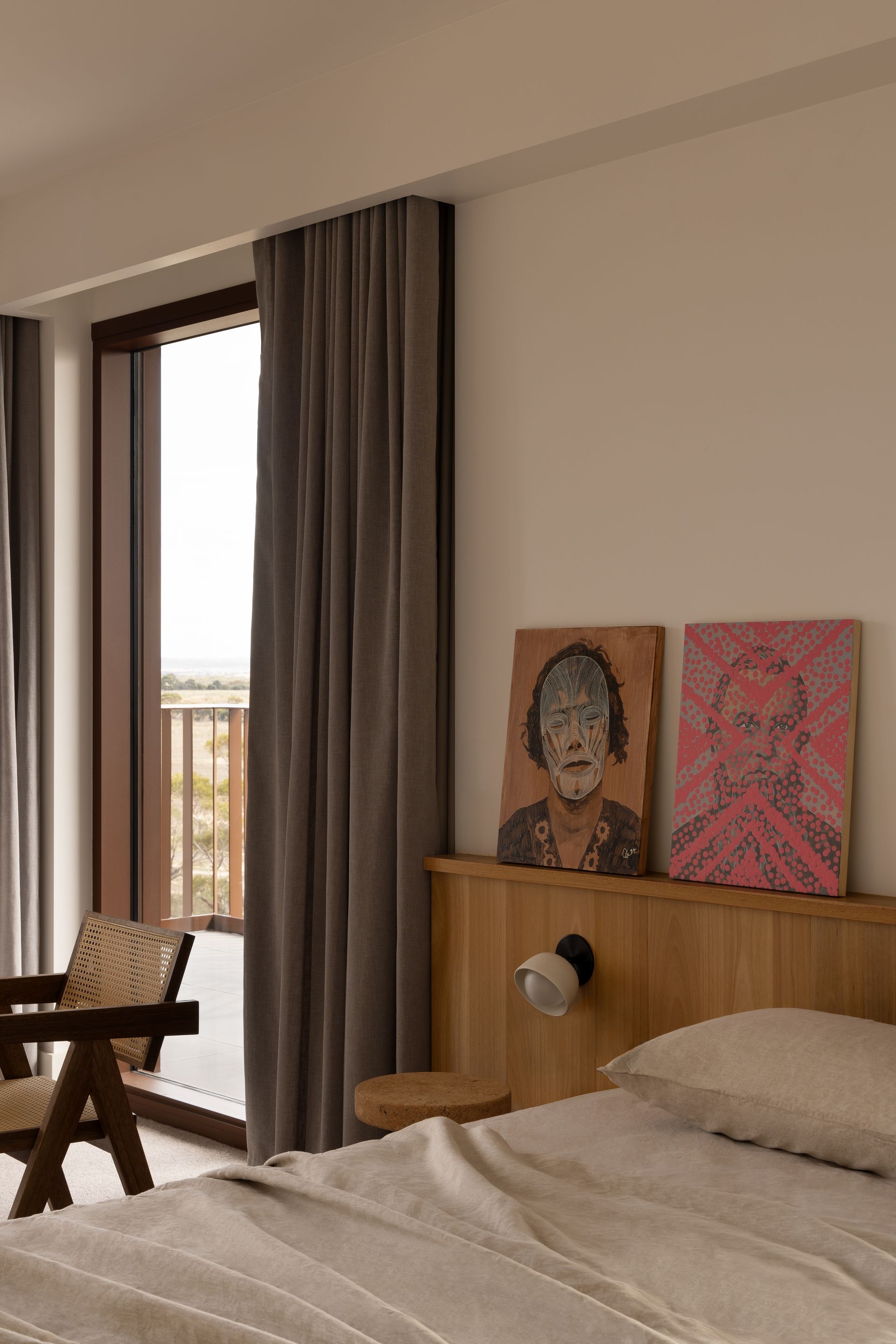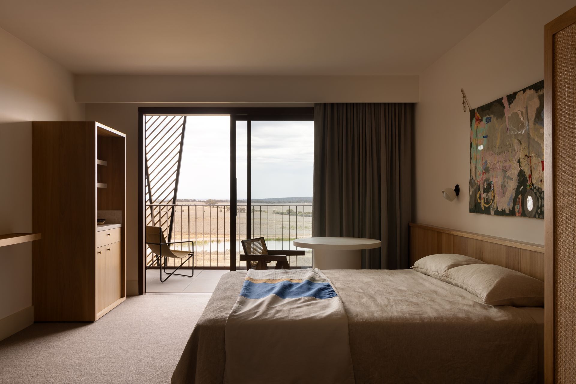 The interior design avoids pastiche, weaving African influences into the rugged Australian terrain in an authentic, respectful way. Inspired by the patterns, crafts, and colours of both continents, the design celebrates cultural richness while maintaining a deep connection to place. This modern aesthetic feels thoroughly of its time and rooted in the Australian mallee. Artwork and furniture from South Australian makers embed the project in local culture, highlighting both emerging and established creatives.