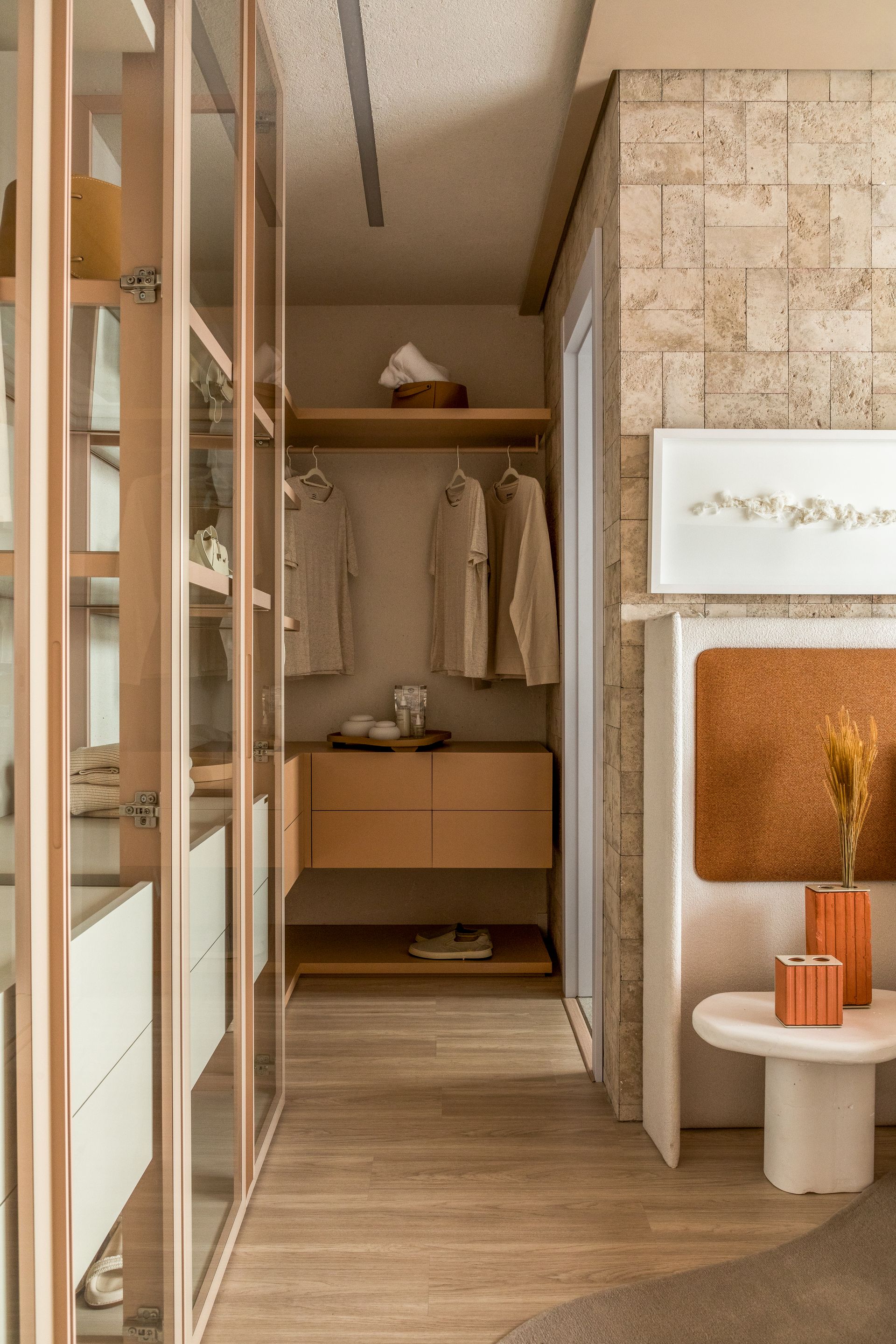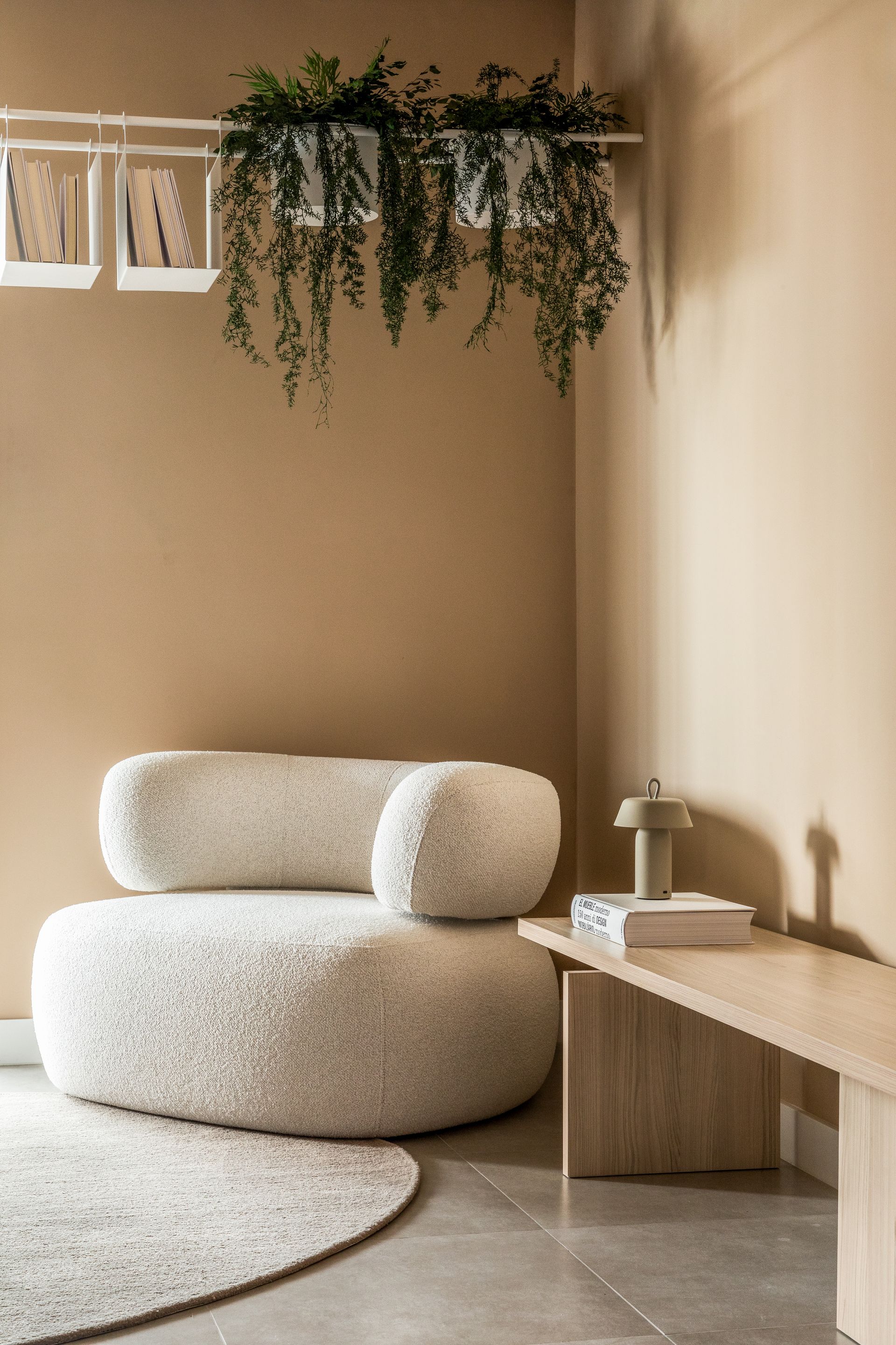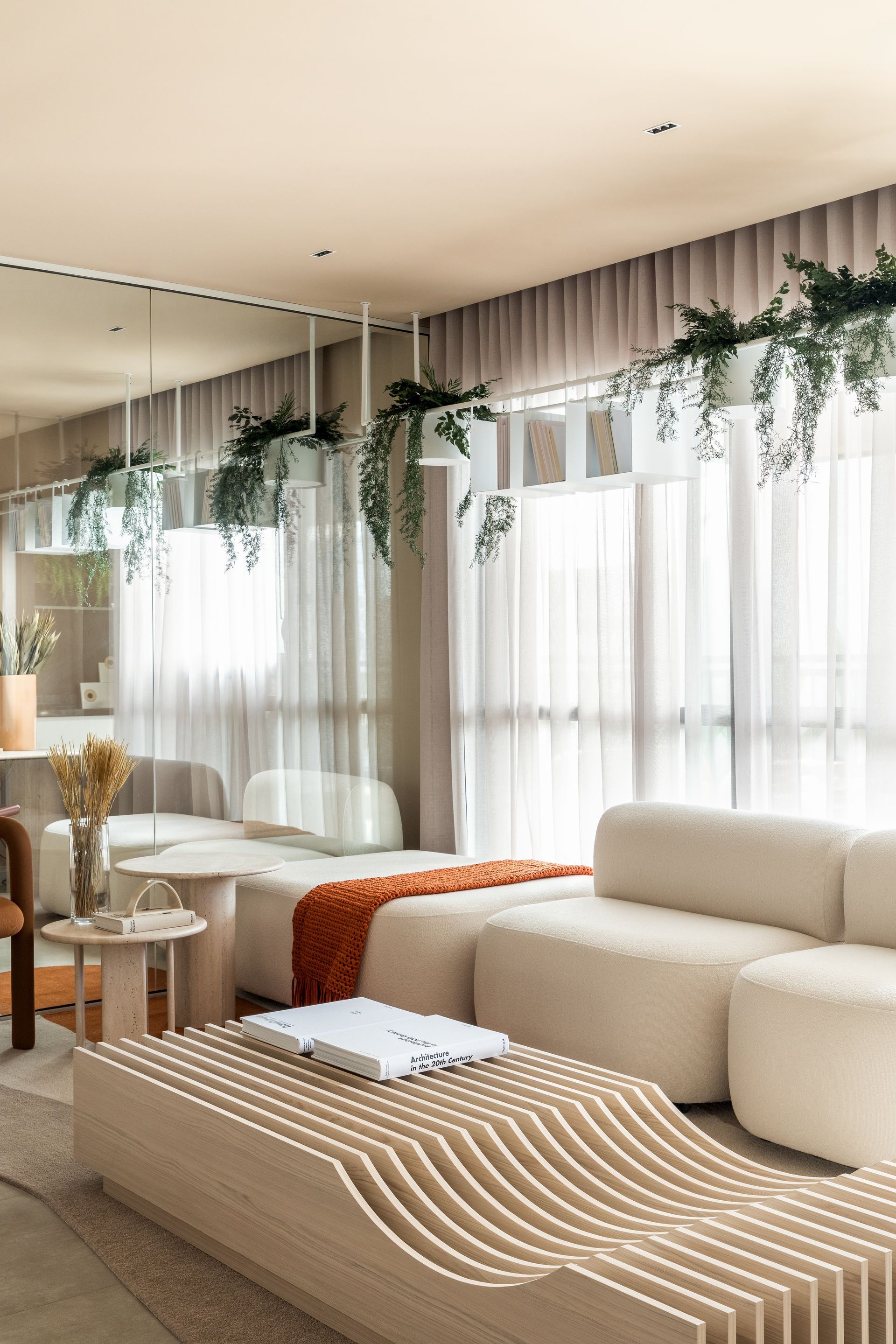 Suspended plants complement the interior design, refreshing touch that balances earthy tones and more austere architectural elements. The plants were strategically placed to bring life to the apartment without overwhelming the visual harmony. With a focus on functionality and an aesthetic that values comfort and visual lightness, the result is a contemporary, sophisticated, and timeless environment.