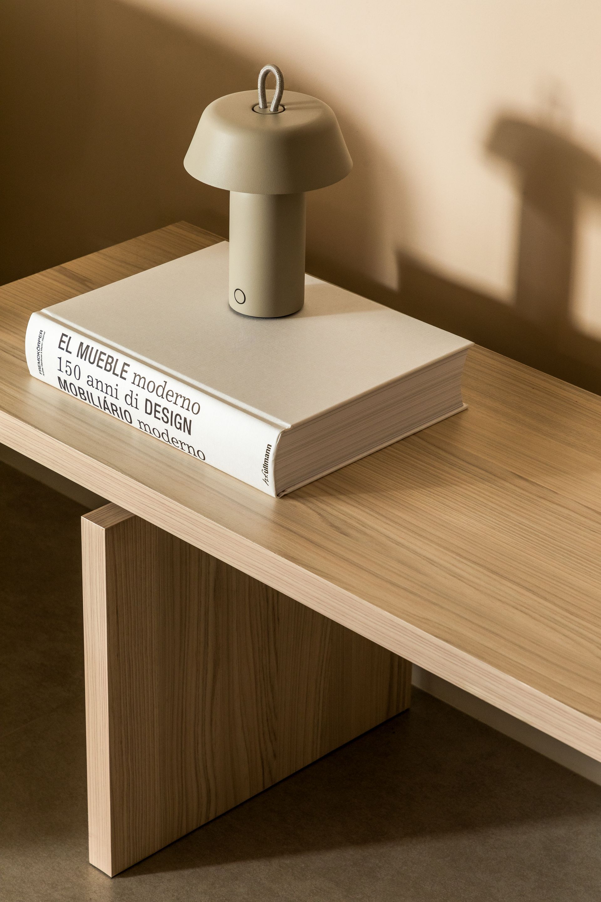 The choice of furniture reflects a pursuit of simple forms and natural materials. The chairs, with curved backs made of light wood and wicker seats, evoke Scandinavian design, while the slatted wooden coffee table contributes to a contemporary and artistic atmosphere. The use of renowned design pieces, such as architecture books and Bauhaus-inspired elements, reinforce the project’s intellectual and modern personality.