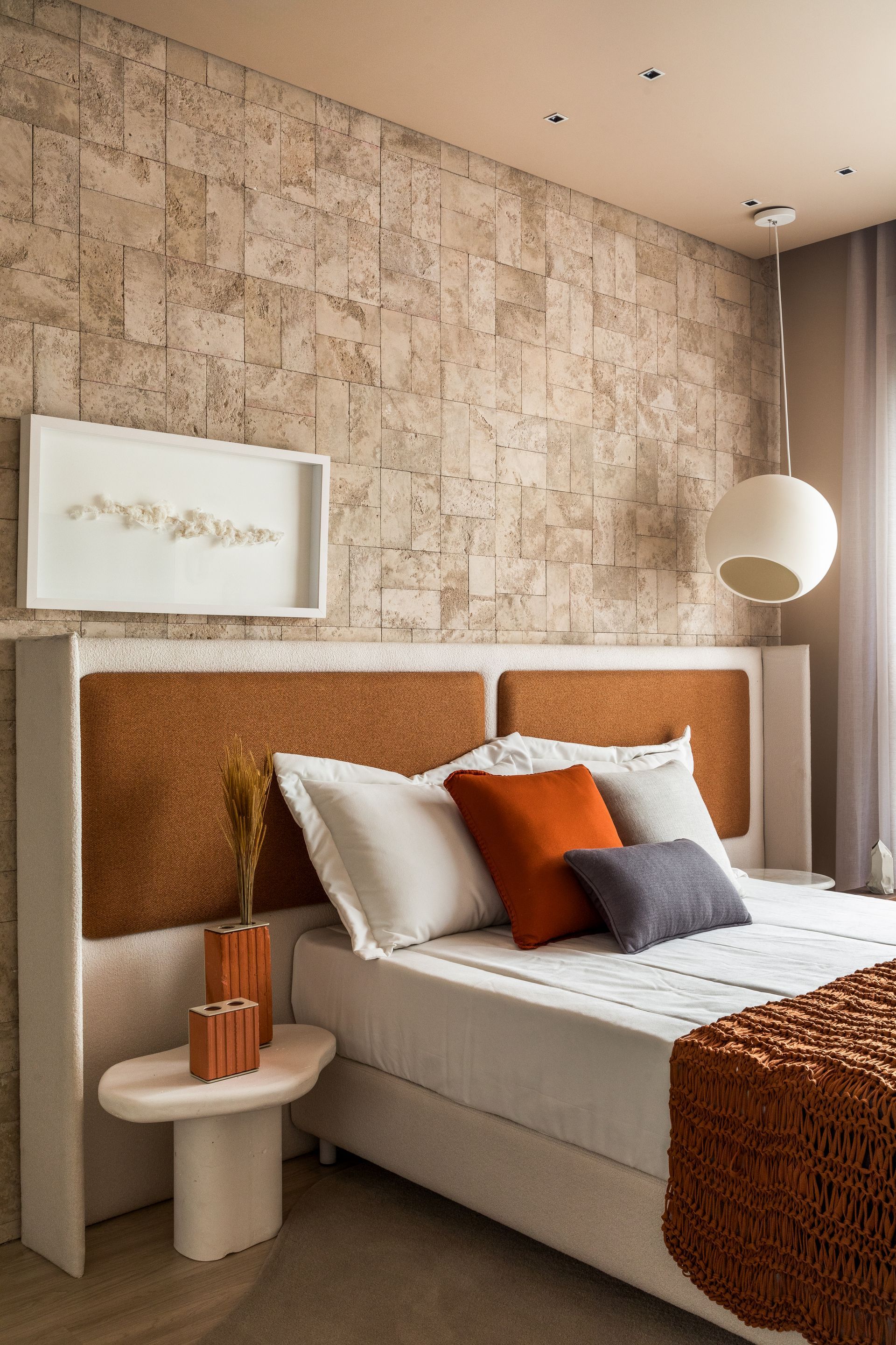 Spanning 103 square meters, the carefully coordinated color palette is dominated by neutral tones like beige and off-white, creating a calm and sophisticated atmosphere. Bohrer Arquitetos designed an open-plan layout that seamlessly connects the living room and kitchen, enhancing both visual fluidity and functionality. A natural stone accent wall, paired with earthy tones and soft surfaces, creates a tactile interplay of materials that adds depth and invites warmth. Curved-line furniture, like the armchairs and sofa, softens the rigidity of hard materials, enhancing the sense of comfort. Natural light is maximised through large windows, complemented by contemporary light fixtures that offer an artistic and functional touch.