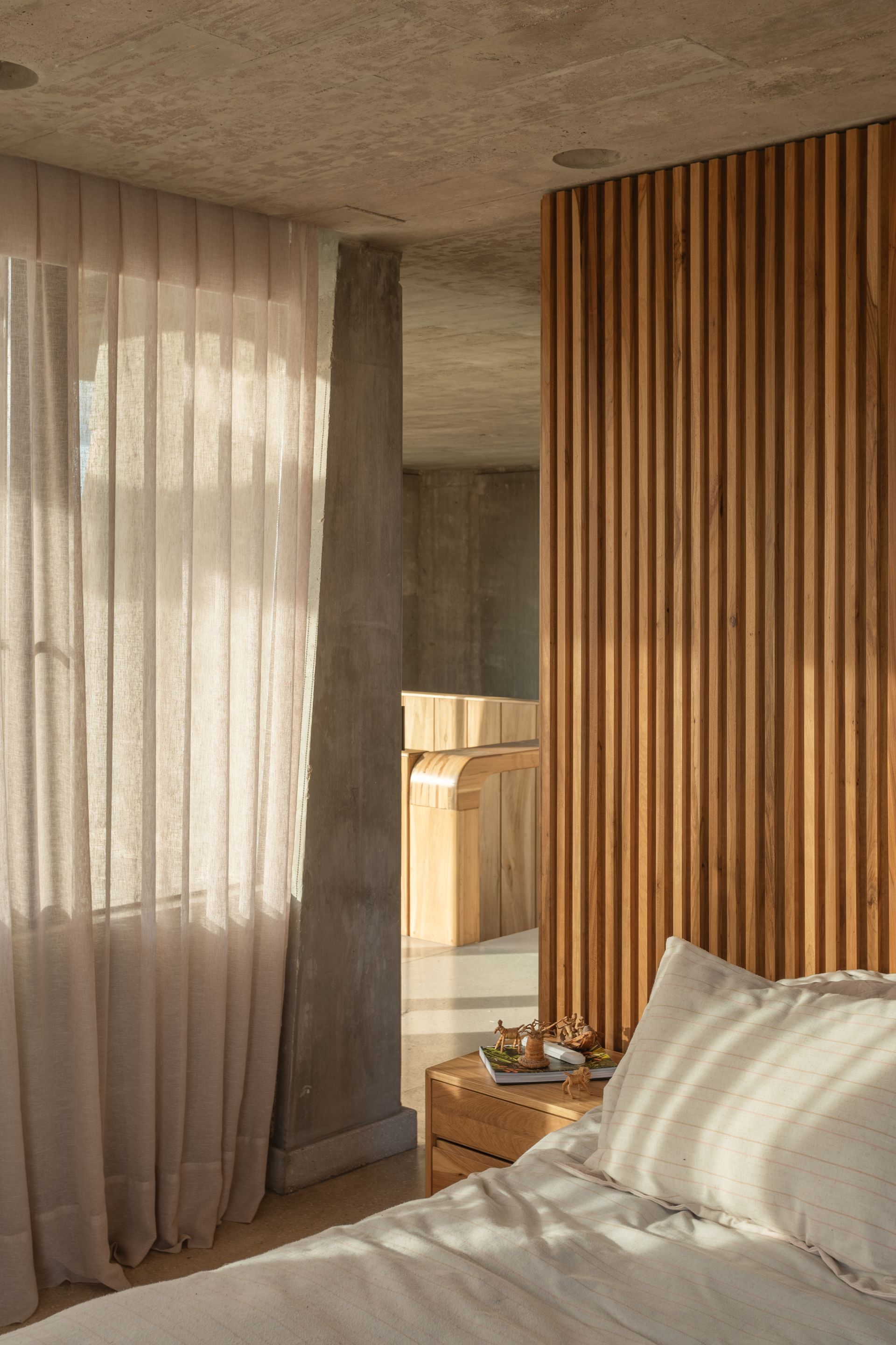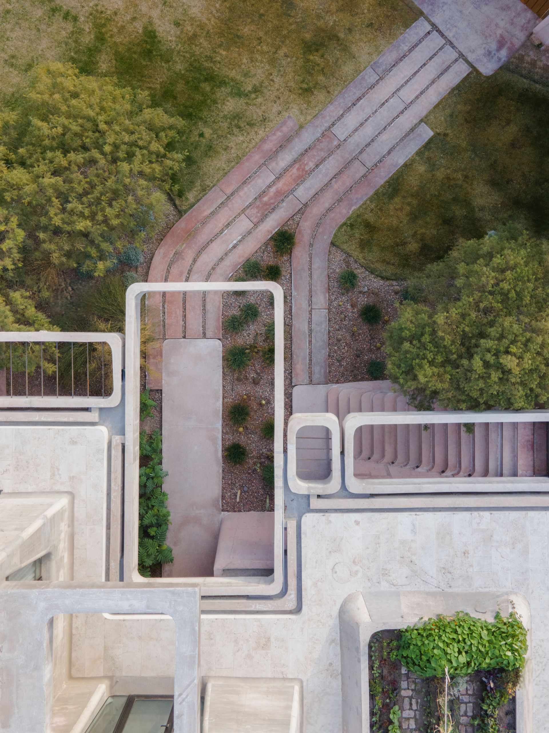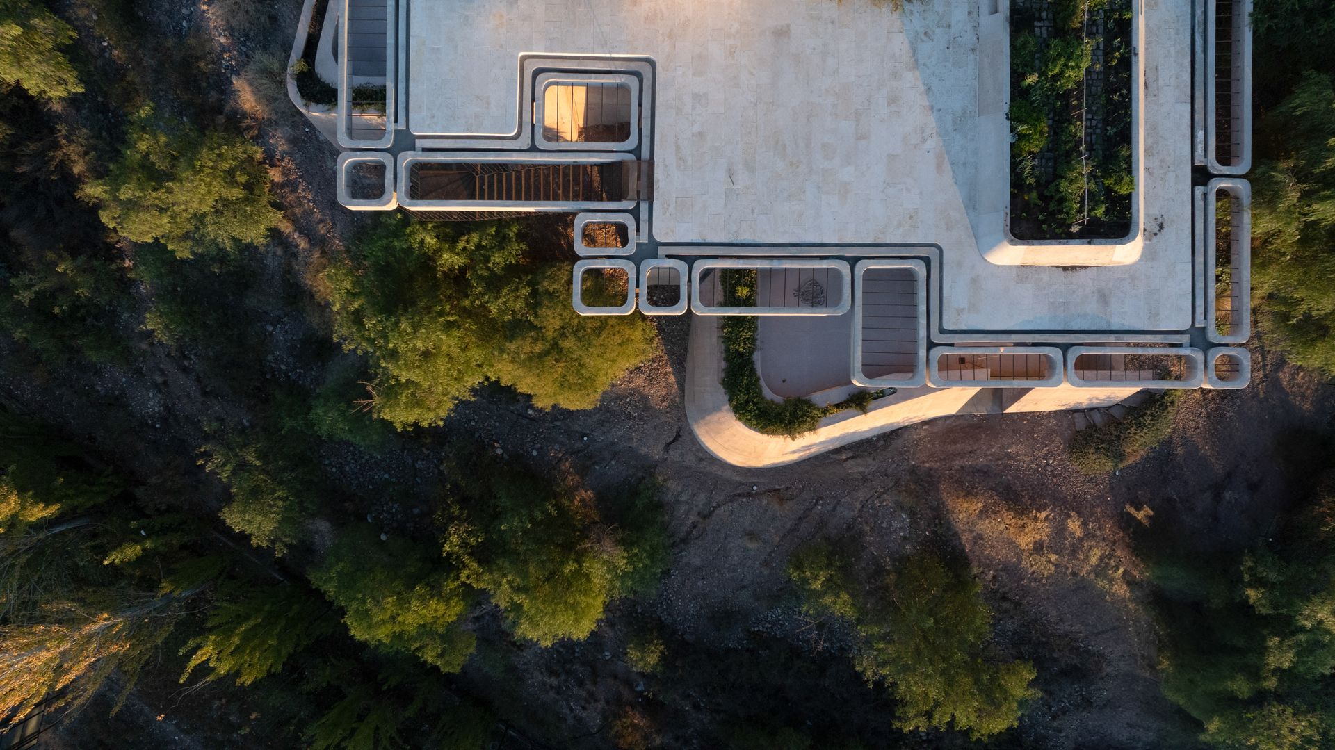 On the canyon-facing elevation, earth-toned concrete walls define the house’s massing and shield it from southern exposure. The structure seems to emerge from the hill, yet asserts a new identity — what the design team refers to as “OF. Abstract Nature”. Exposed concrete, chosen for its resonance with local materials and crafted in close collaboration with regional builders, was fine-tuned through on-site testing to match the earth’s hues. This attention to materiality anchors the house in place, both visually and symbolically.