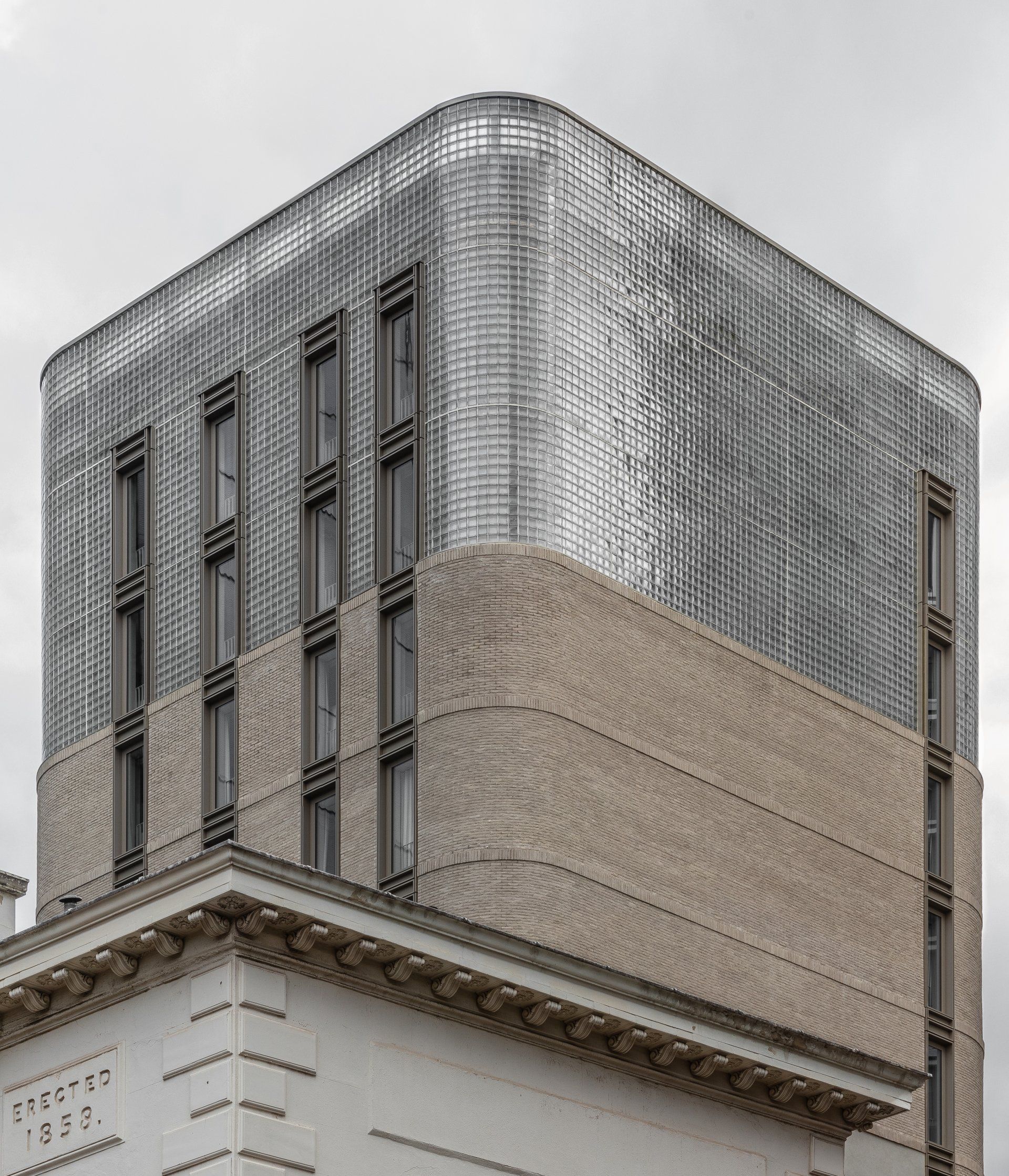 Above this pediment the architects used a warm grey hand-laid waterstruck brick with projected soldier courses at the spandrels and a projected cornice below the material shift at the base of the crown. The brick spandrels and other transitional detailing imbue the already richly textured skin with even more depth.