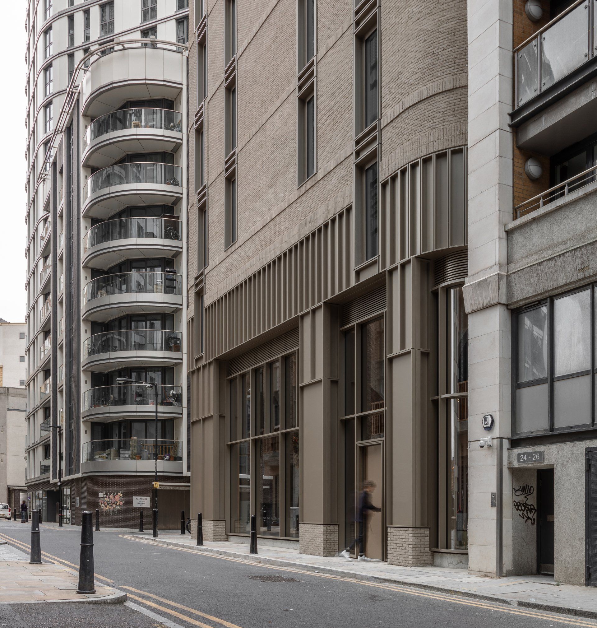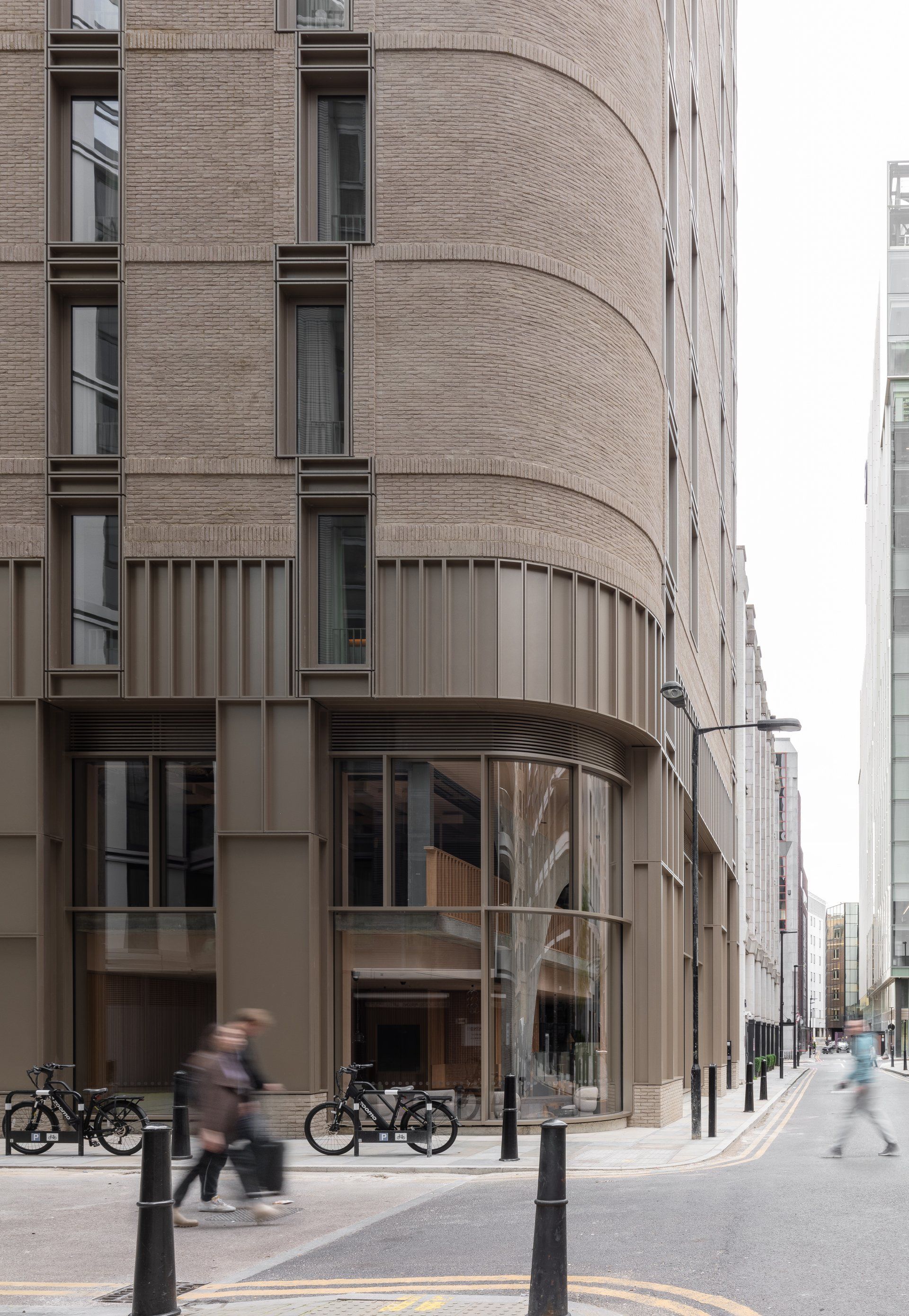 The architects employed radiused corners and transferred much of the scheme’s structural load to an expressionistic double-height parabolic arch at grade to make the building sit softly within its block all the while drawing inspiration from the round headed windows, arched cornices and rounded quoins of the heritage buildings on the neighboring streets.