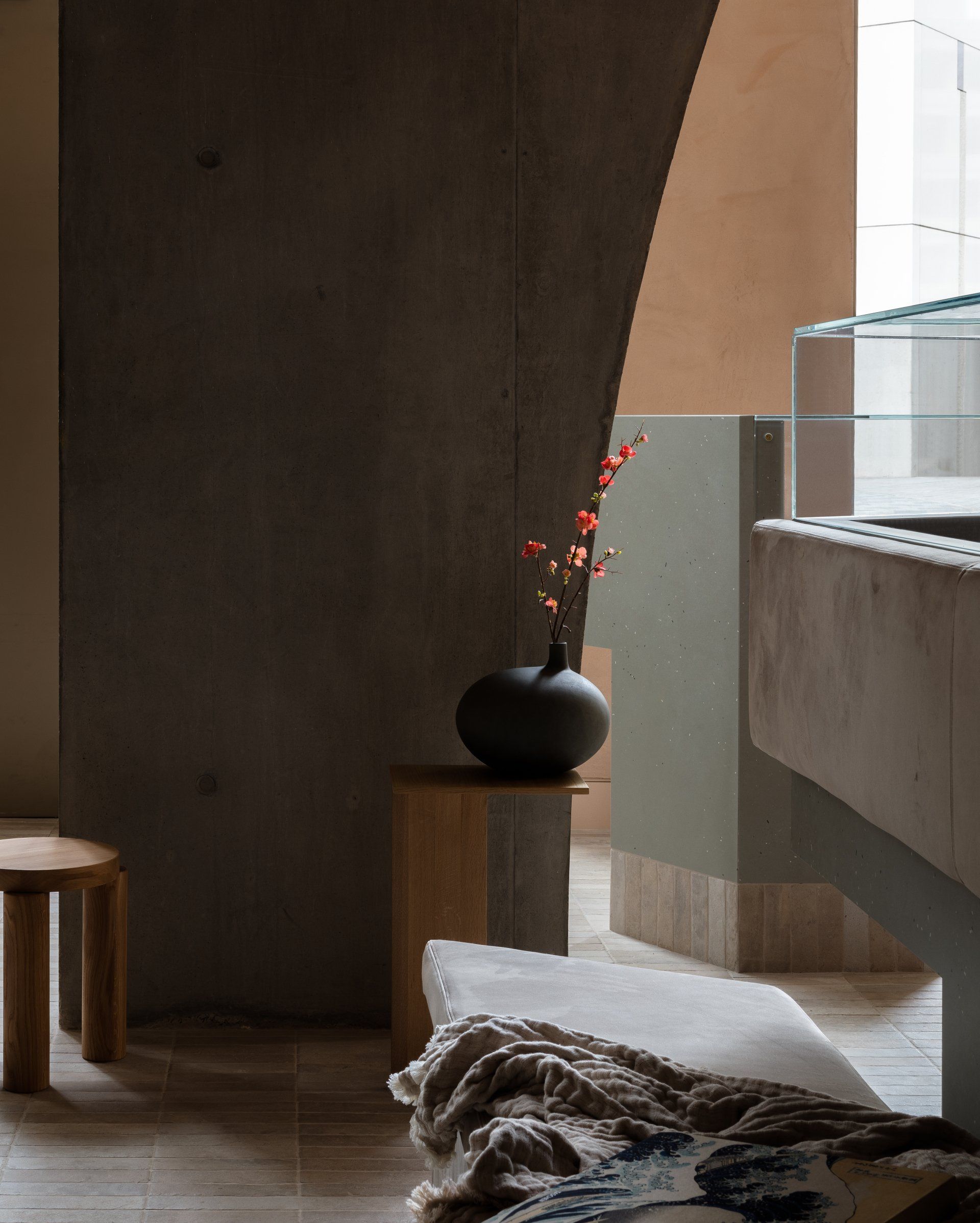 "By linking sumptuous custom sofas to beds and designing compact tiered tables, shallow linear shelves and hanging timber trays, the imperative to efficiently facilitate functionality yielded a comprehensive aesthetic that manages to feel luxurious. The palette: blush tinted clay, sage, timber, jute, creamy stone and velvety neutrals, further contribute to the plush serenity of the studios."