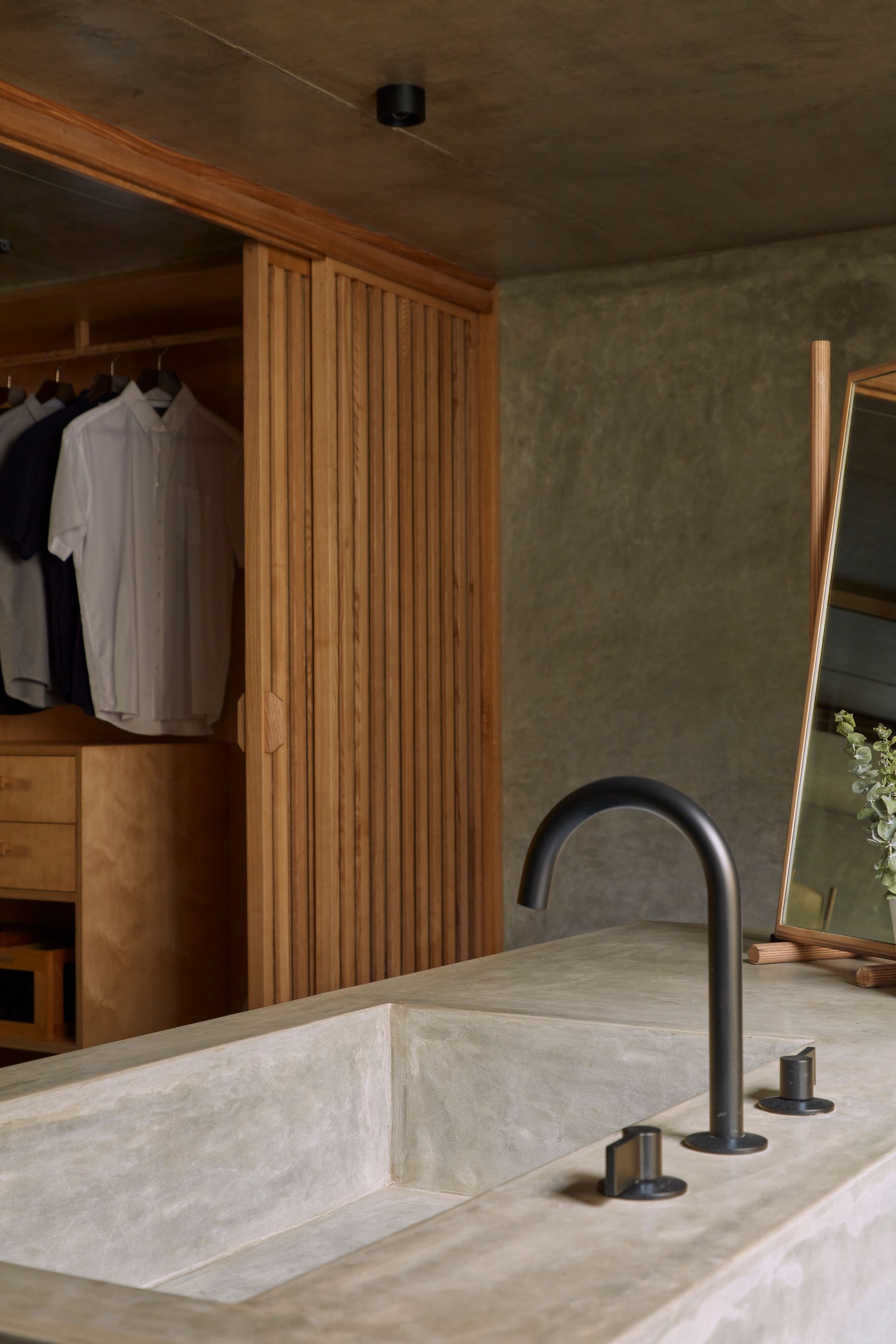 The architecture of The Cabin House draws inspiration from simple forms and native bearings. The interior of the rectangular volume is broken effortlessly into a double-height living, dining and kitchen with a mezzanine floor on one end to accommodate the master bedroom. Earthy tones throughout the dwelling evoke the setting sun, whilst the starkness of the cement and warm tones of the furniture offer the required depth. Below the mezzanine is the washroom that features a cast in-situ island-concrete basin overlooking the landscape and a full-sized walk-in closet.
