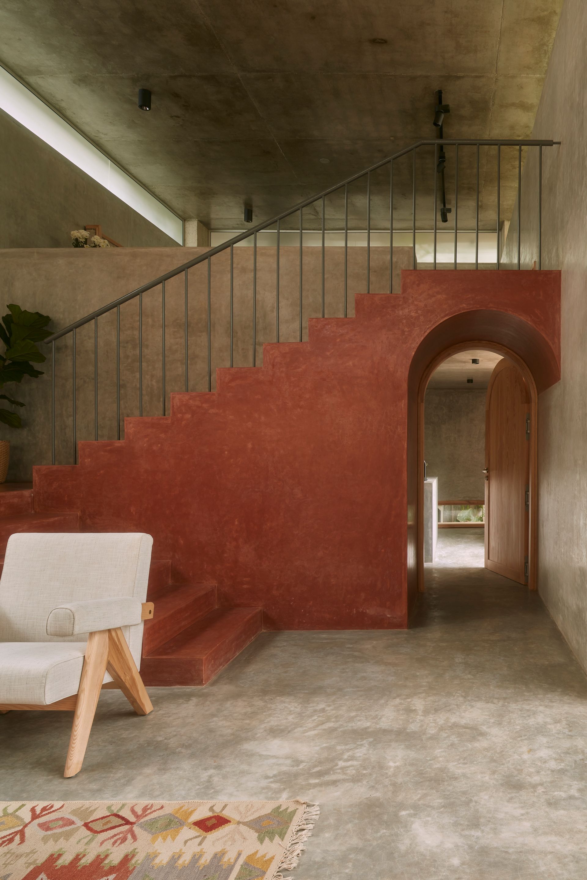 The landscape around is sculpted to imbibe nature into the dwelling; it also features a large gazebo that keeps in mind the client’s requirement to conduct small gatherings. The remarkable combination of neutrals breaks even with lustrous-terracotta that weaves throughout the entire dwelling. The cynosure of the design – highlighted in terracotta red color – is the archway that melds into the main staircase and further extends out to a seater.
