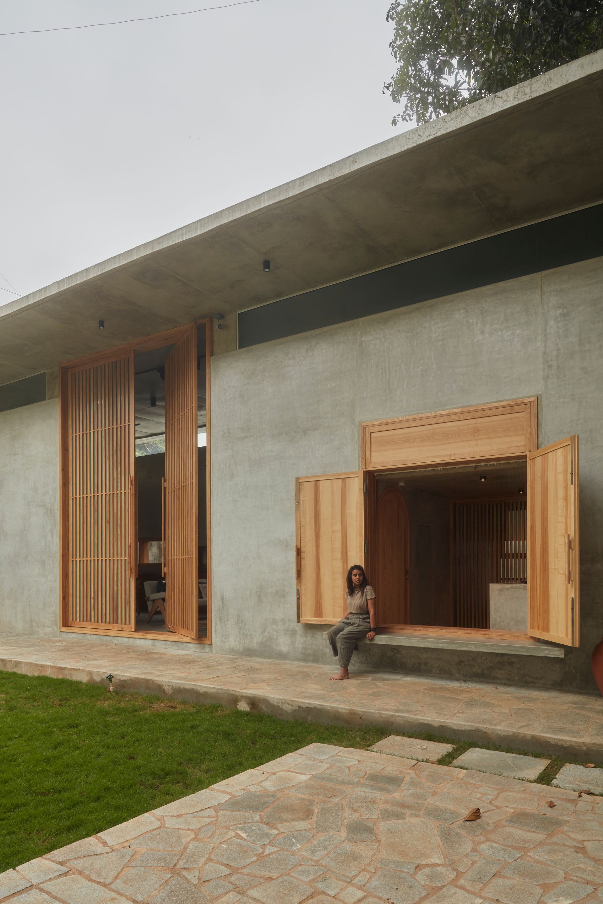 Solidness of the large concrete roof is rendered lightweight through the introduction of wooden louvres and glass panes, allowing natural light to filter into the interiors. Inferring the katte design, the window sill on the exterior is lowered to invite people to sit by the window and enjoy the view of the large garden in front. While the exteriors exude boldness in form and function, the overall structure is perceived to be grounded in nature, with very little distinction between the boundaries of the two.