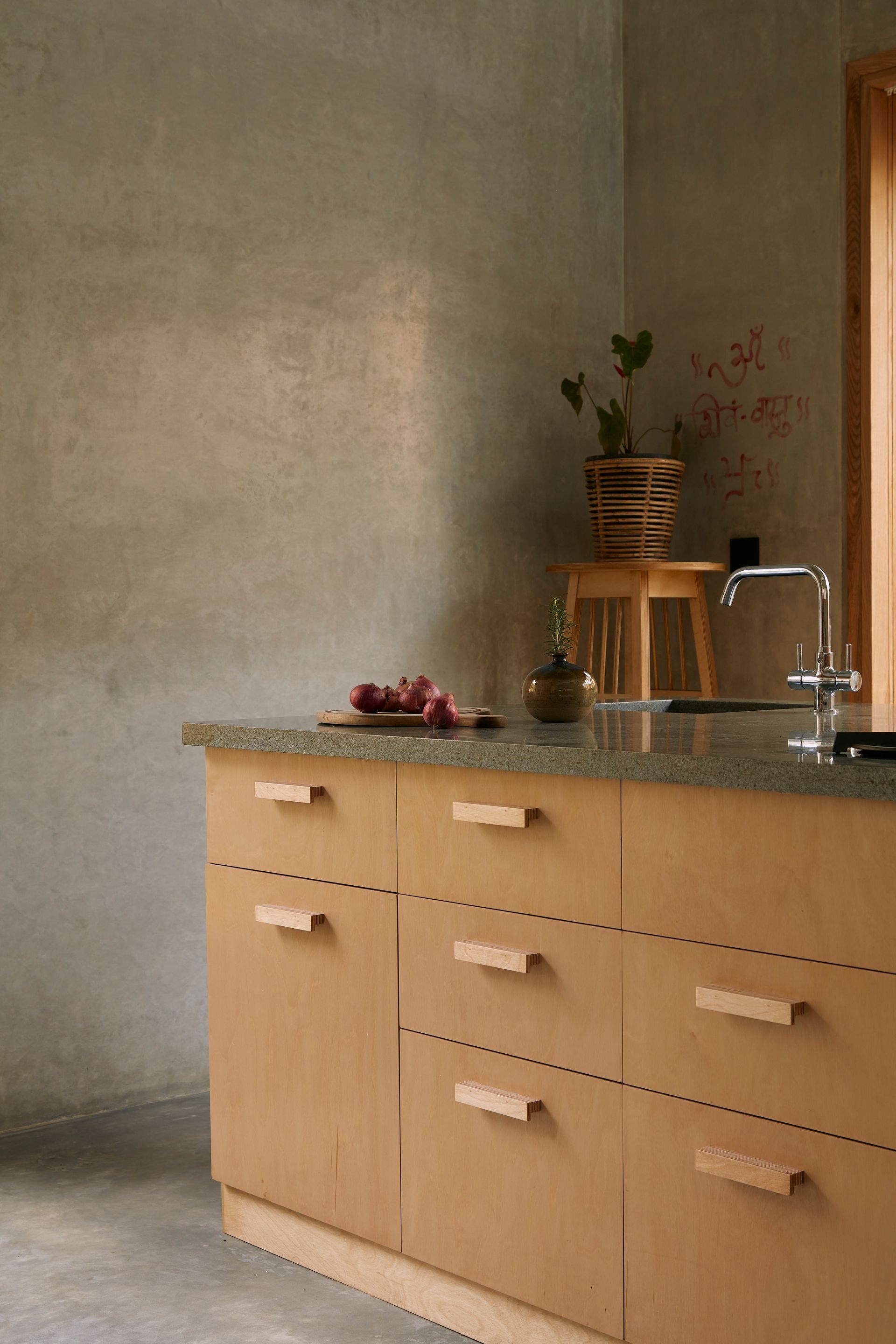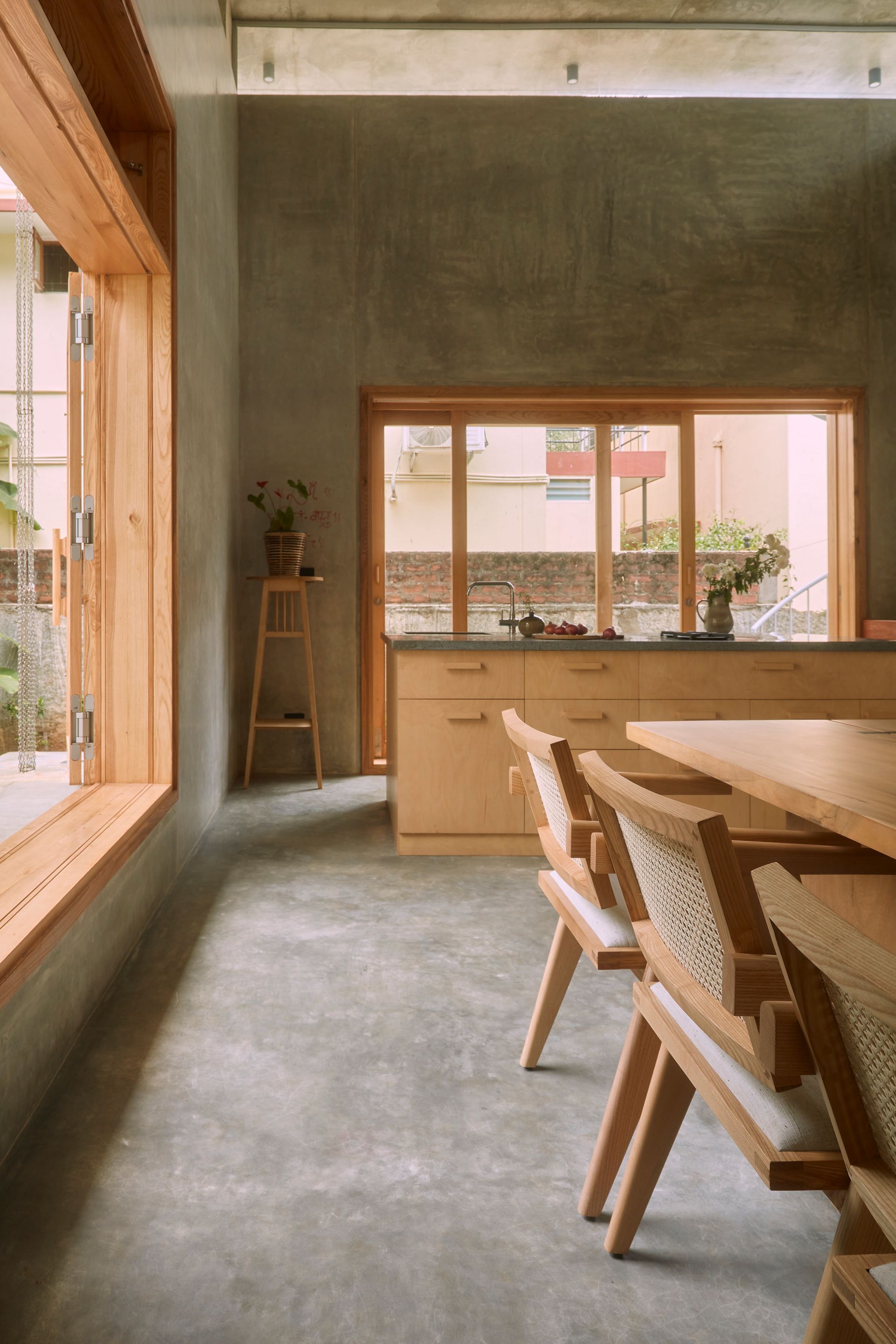 Nestled in the lush greenery of South Bangalore, resides the one-bedroom weekend home for a family of three. One is immediately greeted by the large foliage of the jackfruit and mango trees, where the rectangular dwelling sits along the East-West axis. The ground floor punctuates the rigid walls on the longer side to encompass 5m (18ft) pivoted doors on either side to blur the boundaries between the landscape and the residence.