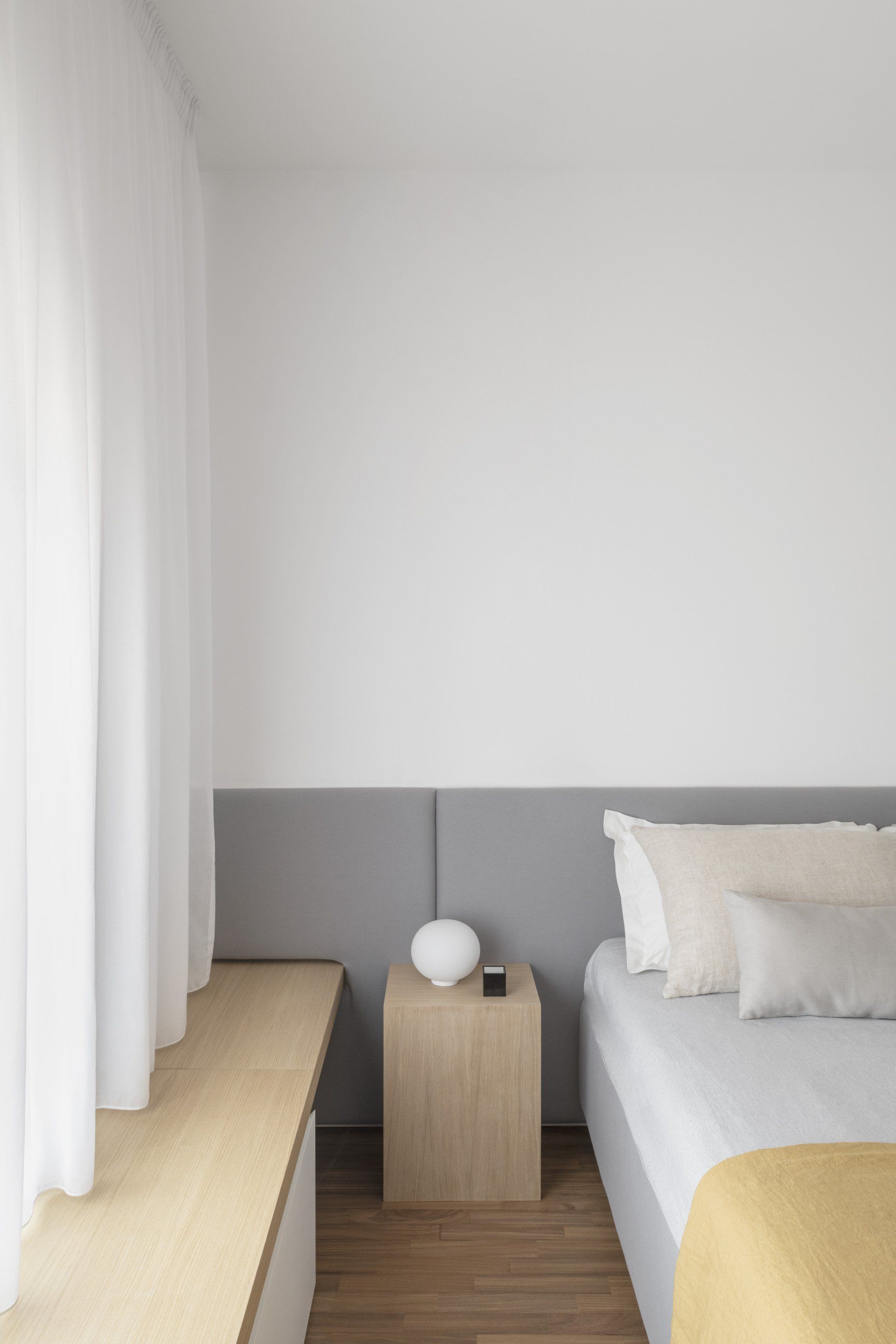The bedroom was designed entirely to measure: the wardrobe forms a system with a long bench that extends under the window until it meets a fabric headboard that defines the entire wall.