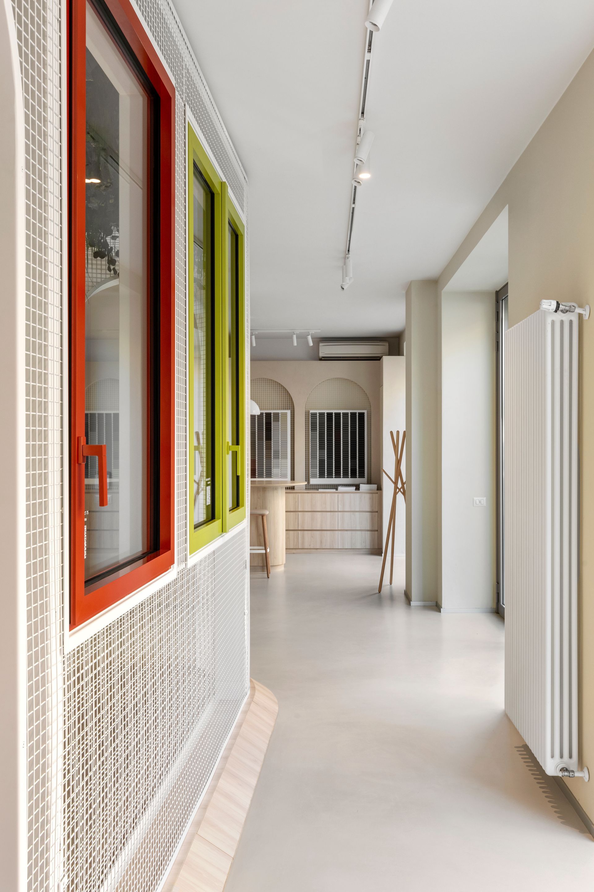 On entering, visitors are greeted by an almost 14 metre long exhibition tunnel running parallel to Viale Biancamaria. This monochrome architectural structure, made up of a white metallic mesh, highlights Domal products such as sashes and sliding windows with minimal and colourful profiles.