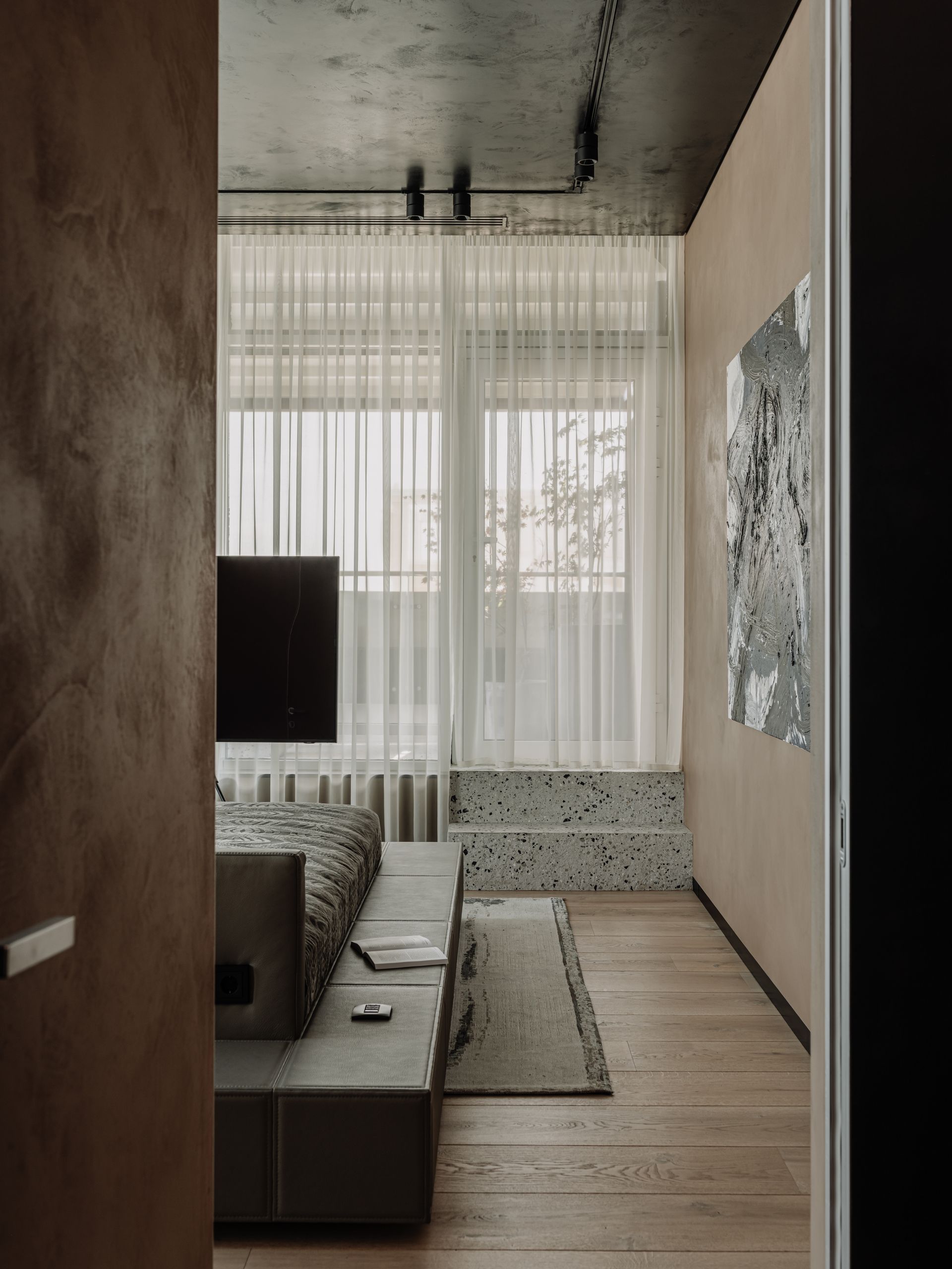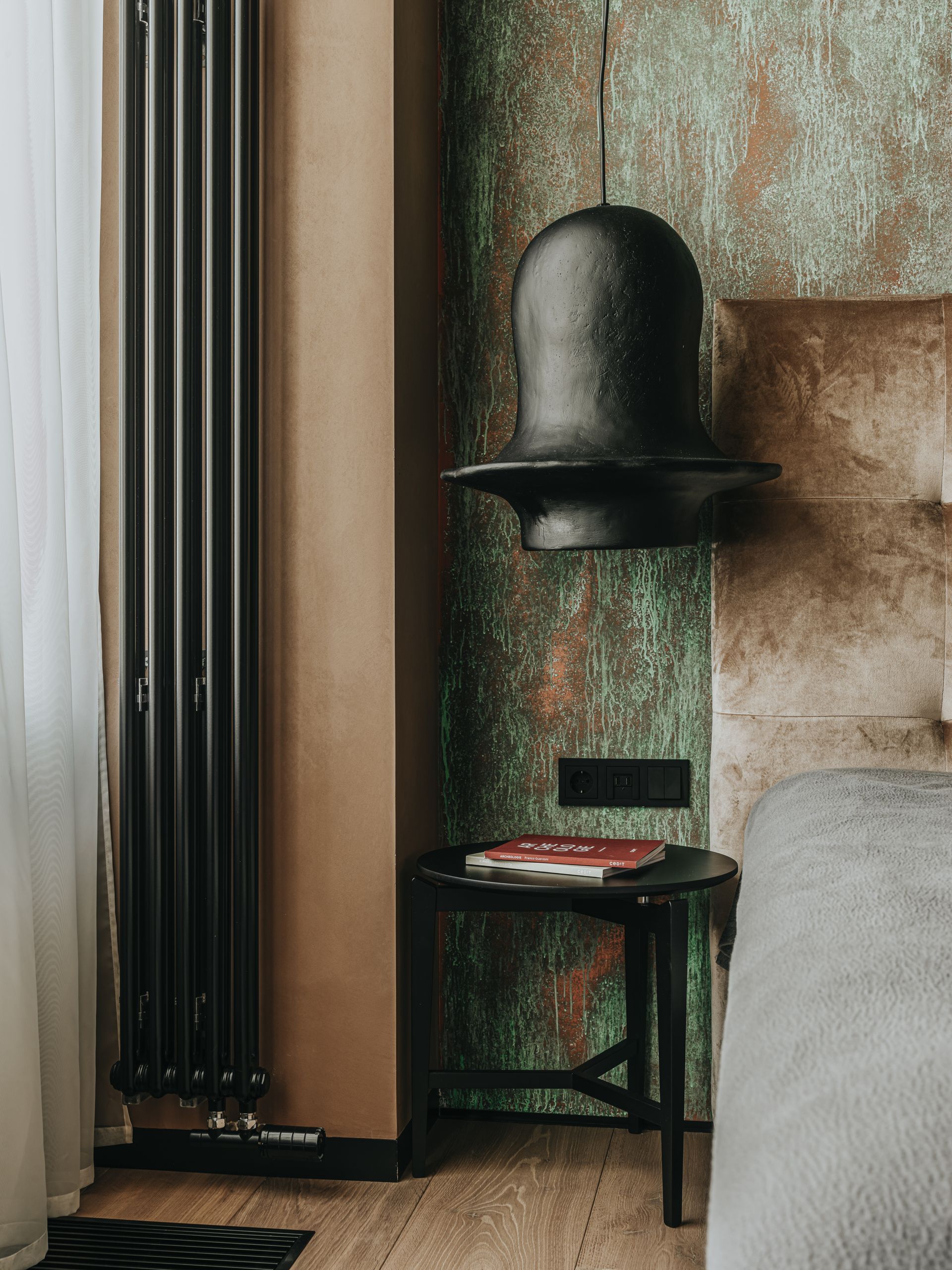 The guest bedroom combines art elements: artistic copper plaster on the front wall, paintings on the other walls, and handcrafted VOLCANO ceramic lights. All together, they create a unique atmosphere in the room, exciting the guests' imagination.