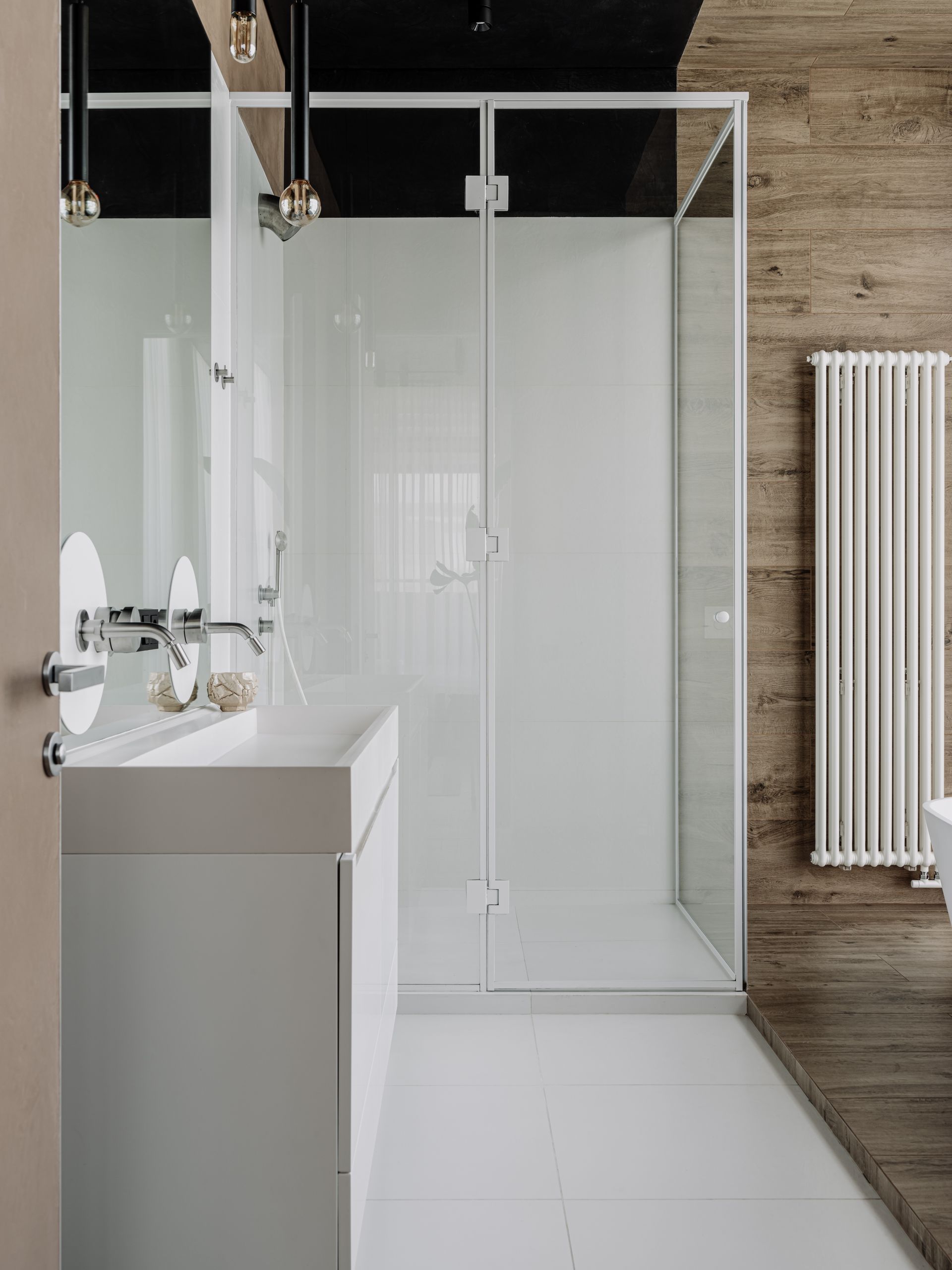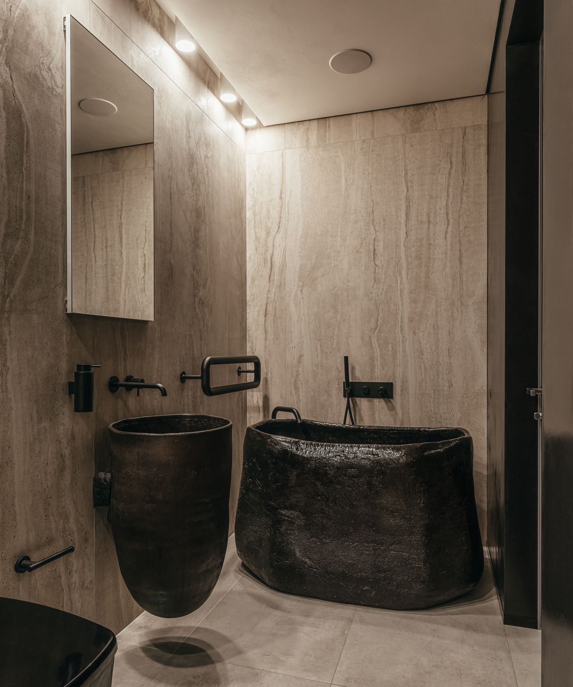 The highlight of the minimalist guest bathroom is the black handmade ceramic sinks, adding uniqueness and style to the interior. One-piece multi-liter clay tanks with natural curves are a successful experiment of our ceramists.