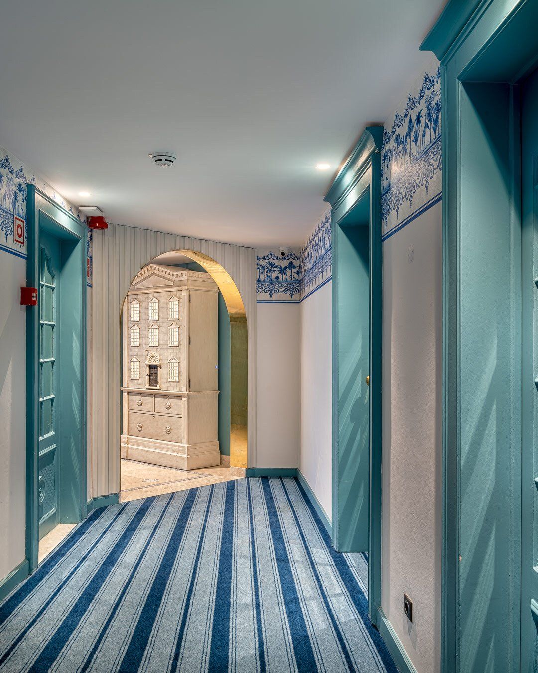 The hotel’s corridor walls lined with hand-drawn murals depicting palm trees as a symbol of the area were commissioned to Portuguese graffiti artist SMILE, who is better known for his work on exteriors but was up for a challenge. The concept of all other decorative paintings was developed by the in- house decorative painting team of Viterbo Interior Design. The large large tapestry on the stairways is by macramé artist Diana Cunha.