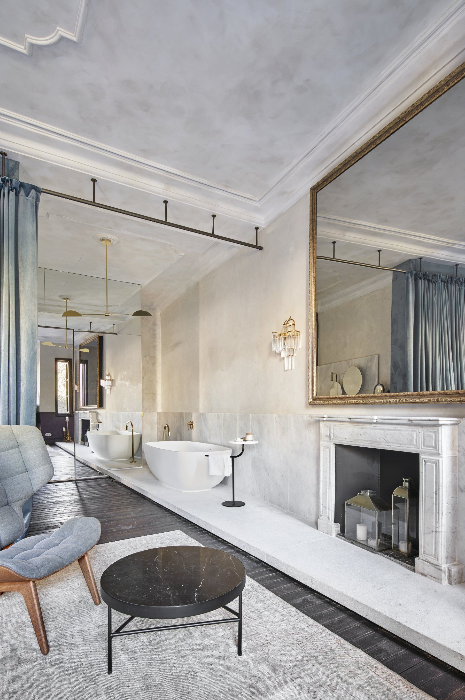 A series of large velvet curtains disguise the new bathrooms in the rooms creating a scenography where the bathroom happens to be the new set; instead of hiding this new element, its use is celebrated. Furthermore, mirror walls sometimes hide sanitary elements such as toilets and showers, reflecting the space these elements have stolen and, at the same time, emphasizing the contemporaneity of these new uses. These are some of the strategies that make possible the new use of the house and the dialogue with the building’s history, but it is necessary to visit the building to discover them and the connections established between them.