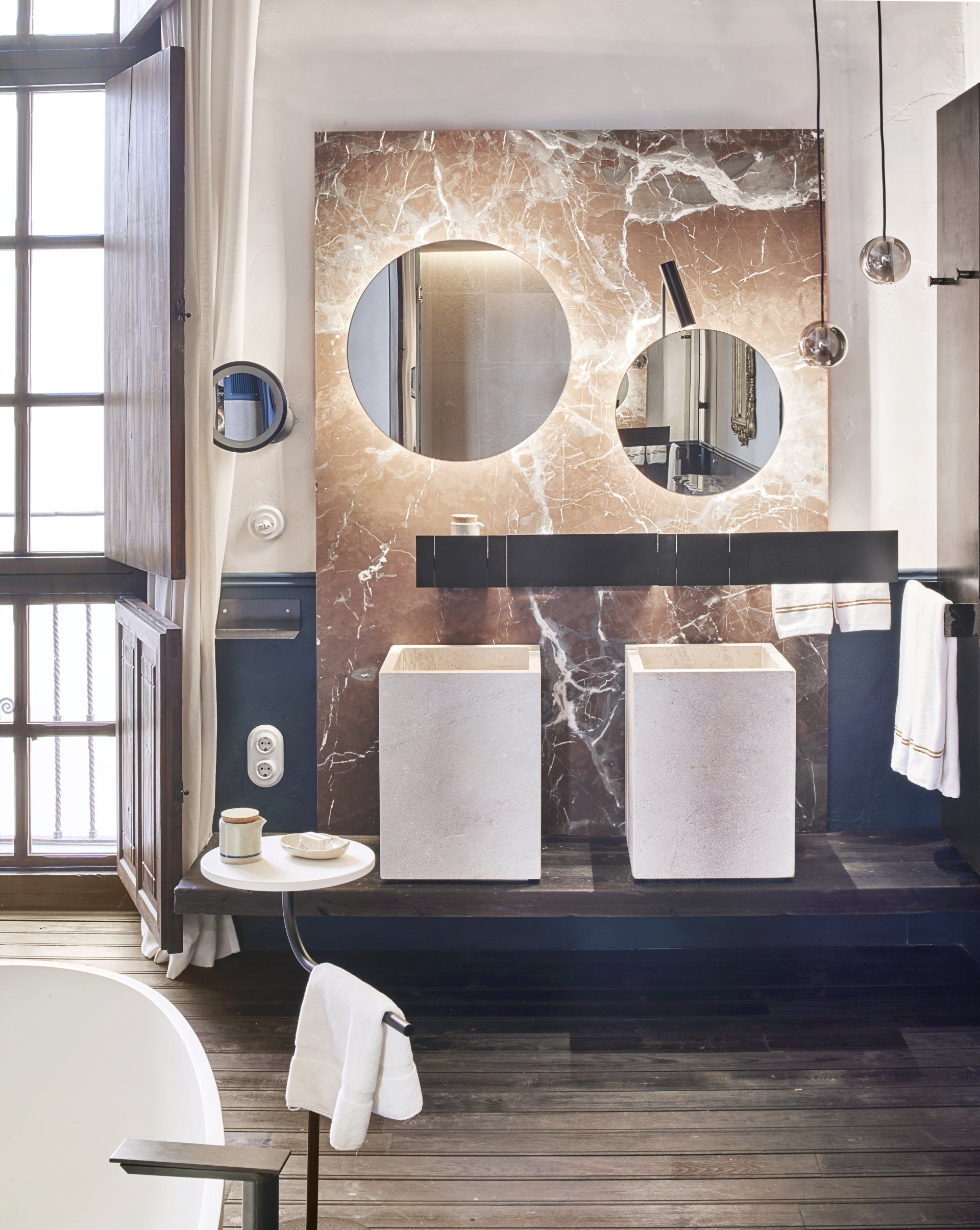 The furniture is a very important part of the project. The eclecticism of the architecture is reflected in the selection of furniture with pieces from very different eras and origins. In Can Bordoy we can find old pieces that OHLAB together with the owner Mikael Hall have been compiling for this project during more than two years. European antiques from Paris, Copenhagen, Stockholm, Istanbul, are combined with pieces from different antique shops in Mallorca, handcrafted pieces of the island such as the Gordiola lamps, elements found in the existing house, as well as some pieces of the new owner’s private collection. These antiques coexist with contemporary furniture from the likes of Baxter, Moroso, Artemide, Norr, Santa & Cole, and Flos, carefully selected and with bespoke furniture designed by OHLAB specifically for Can Bordoy. Among the bespoke furniture designed by OHLAB, a collection of beds and bars for all rooms stand out. The bed, with its bedside tables and headboards finished in walnut and velvet and equipped with bespoke aged brass lamps and brass pushbuttons, form a delicate and intimate space that contrasts with the rough and unfinished texture of the existing walls and ceilings. The bar, present in all rooms in different models, is another delicate element of comfort that integrates a minibar, fridge, storage for snacks, extendable desk, lighting and a built-in Audio Pro sound system with a very easy to use custom-designed aged brass button station.