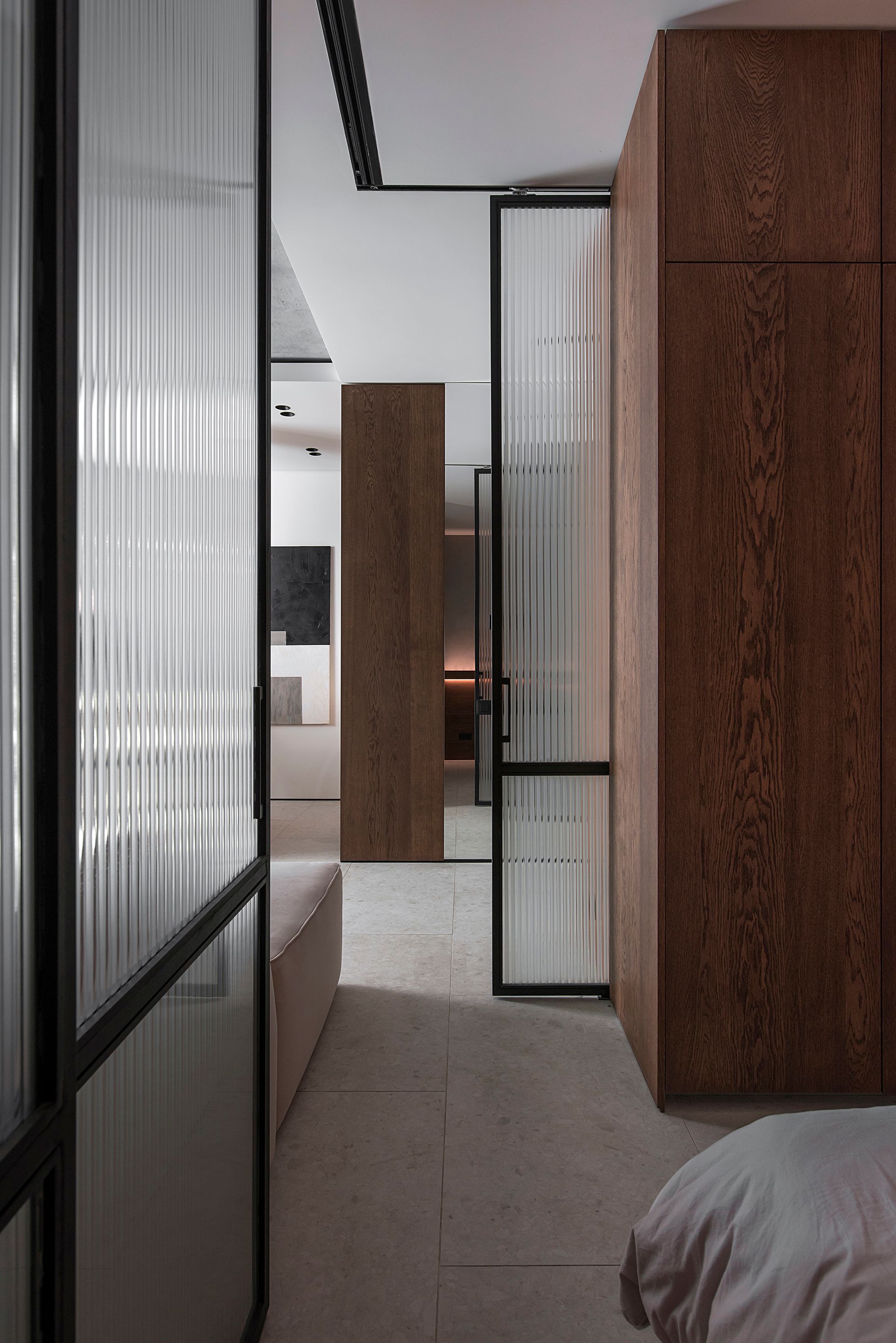 The bedroom is separated by a system of glass partitions, which allows the owner to stay alone. The architects tried not to overload the space with unnecessary details, so the apartment is filled with things that will really be used.