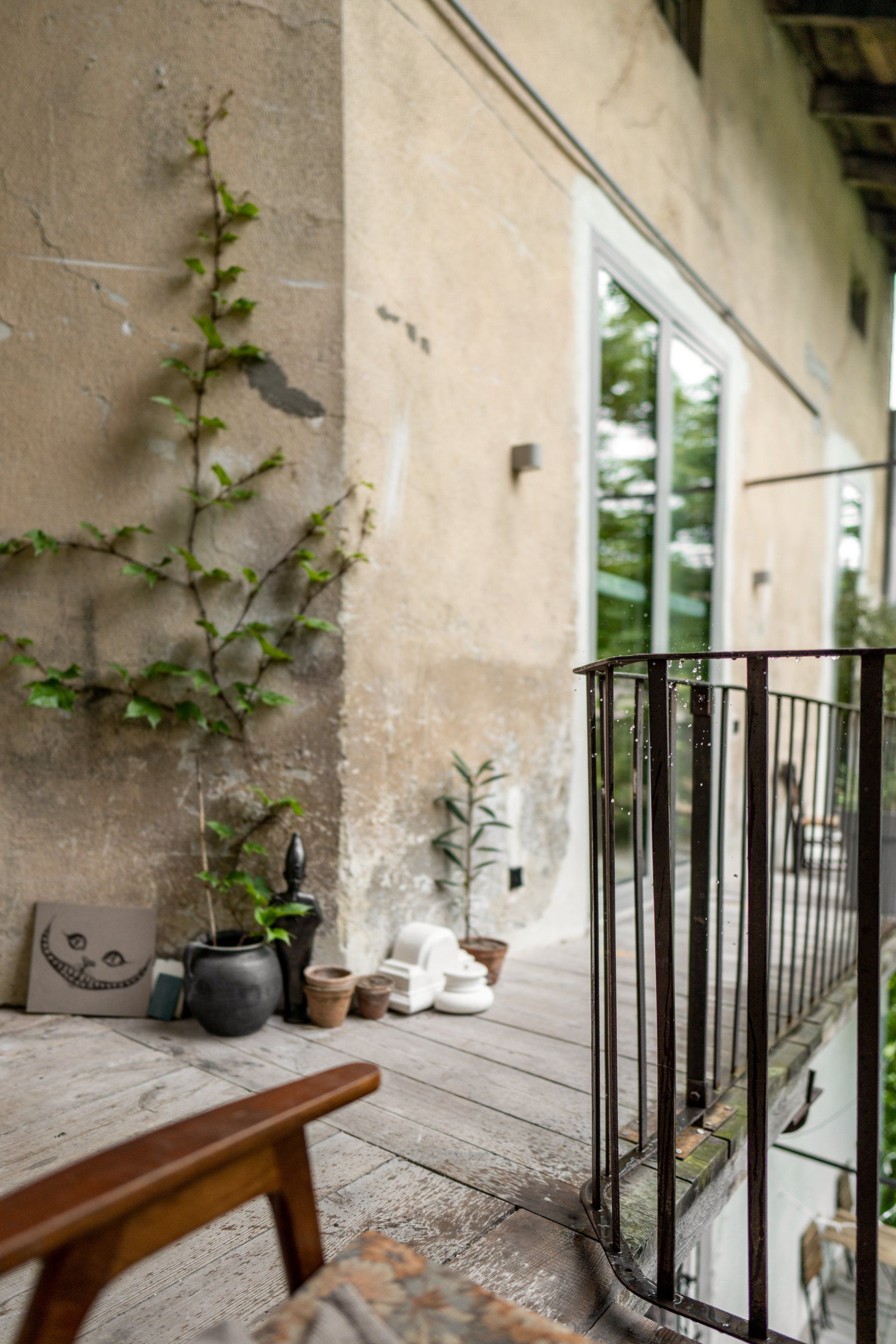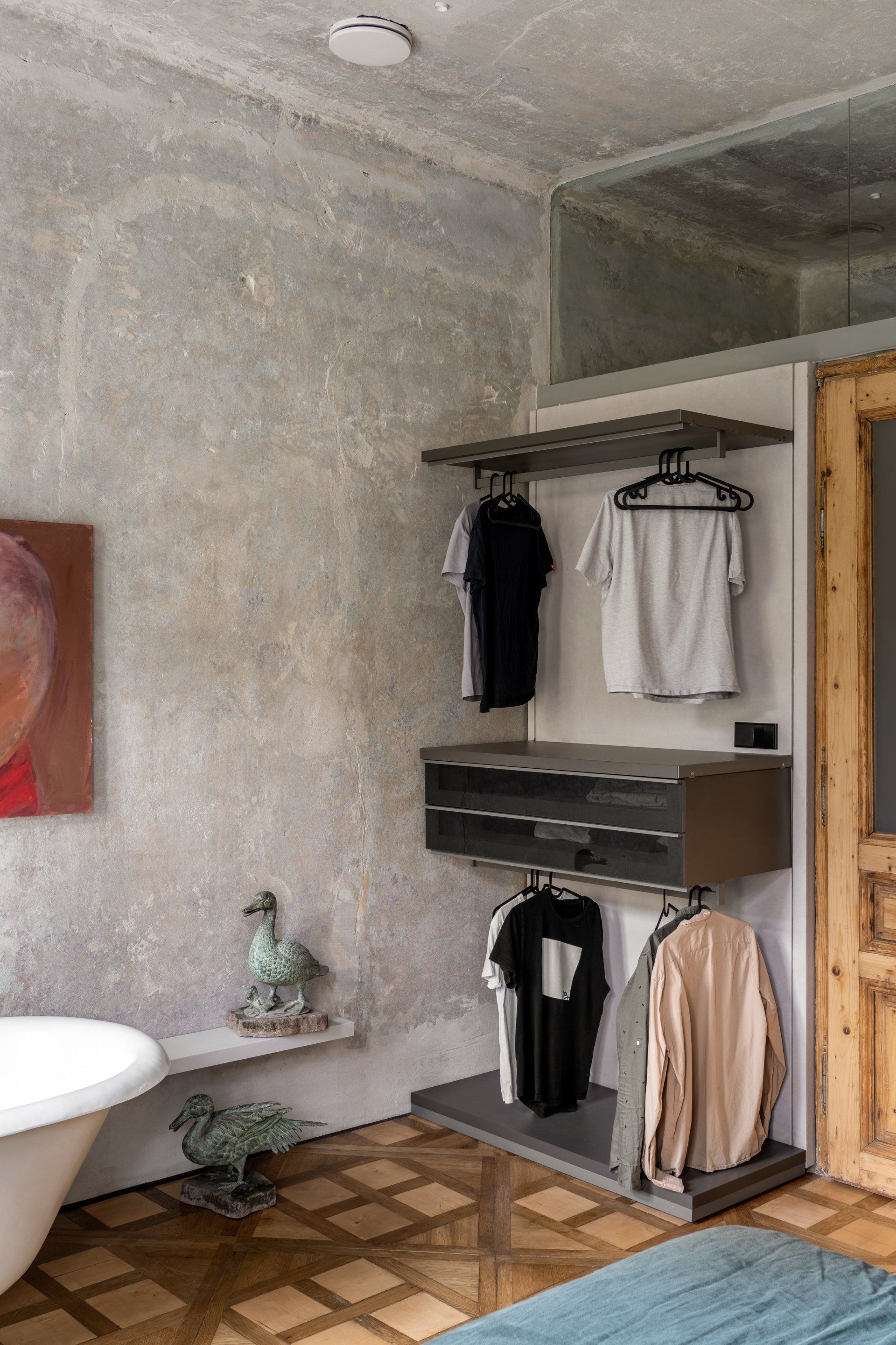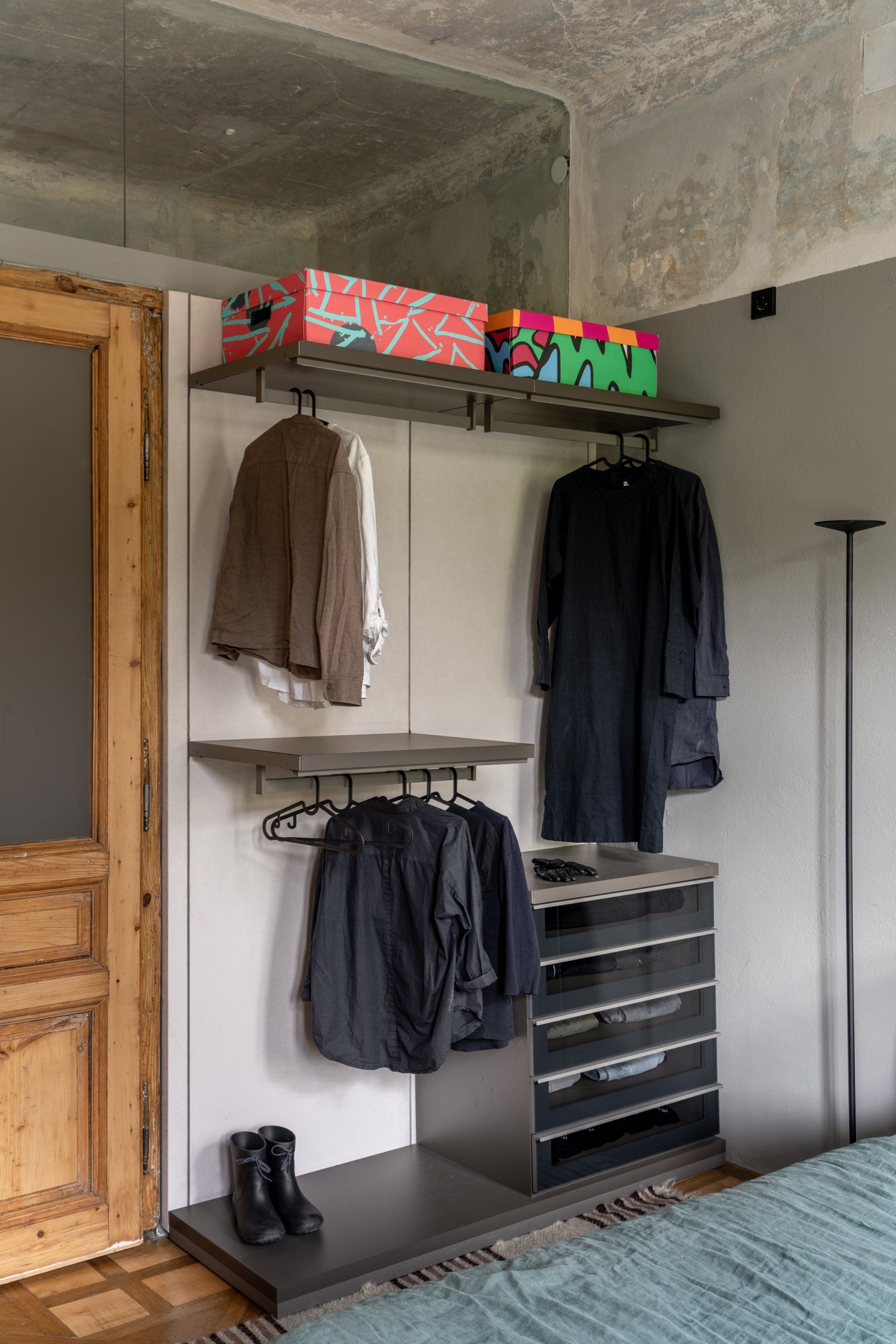 Another element to have been saved and repaired was a vintage mid-19th century wardrobe. It turned black over the years, because of multiple layers of varnish. The designers decided not to touch the surface but just realign it, and made minor fixes and left it as it was.