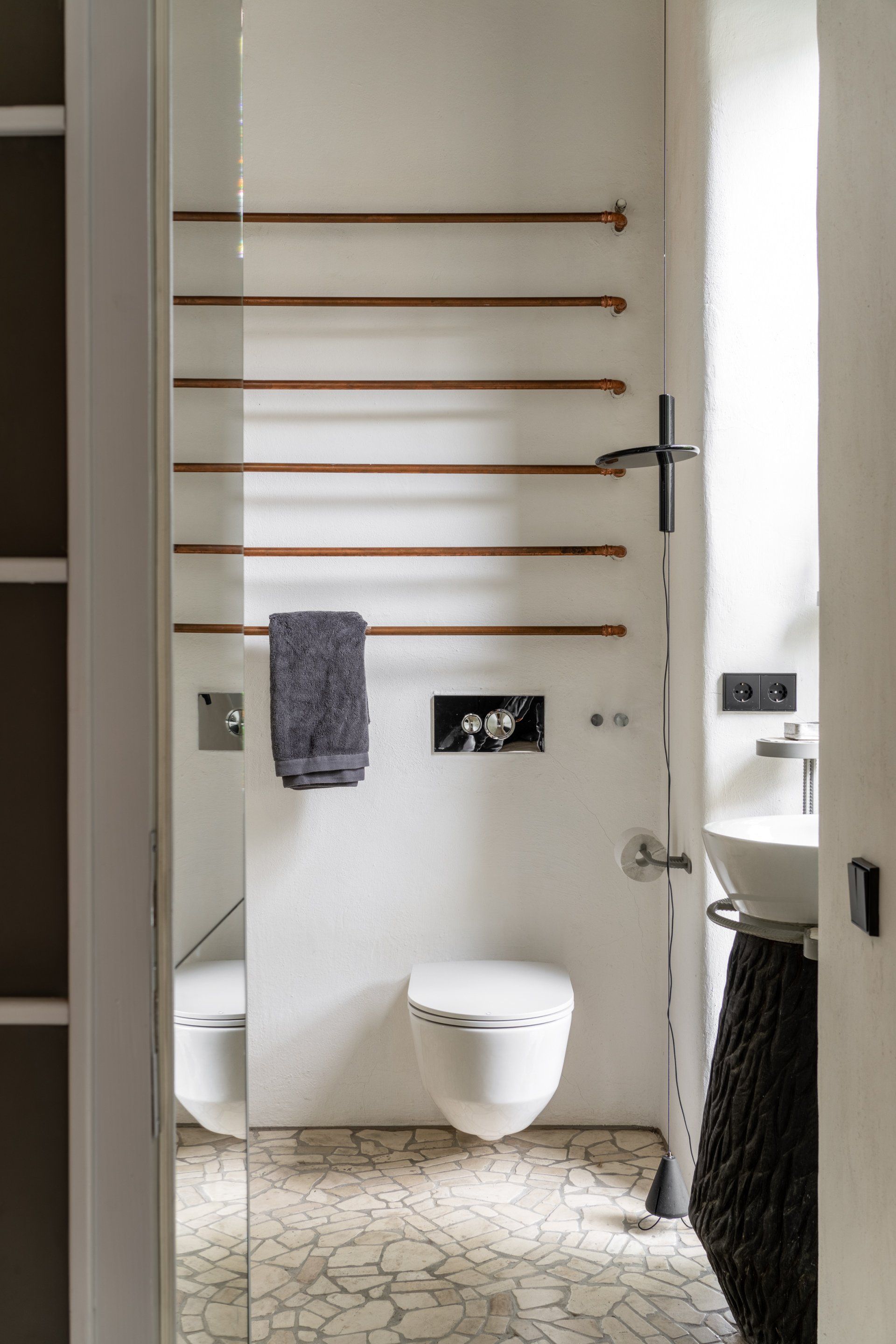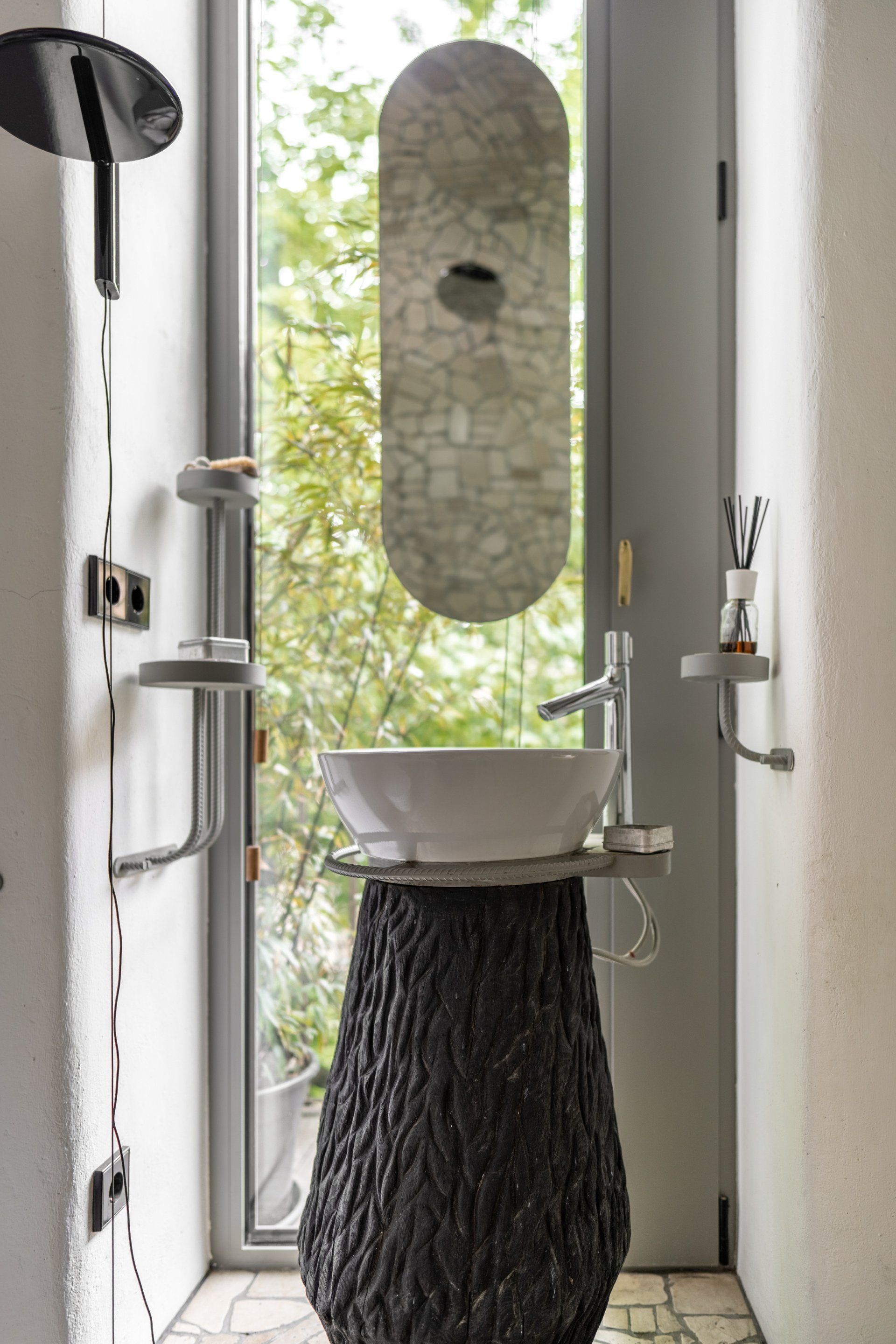 Since the bathroom is small, there is neither decor nor furniture in the bathroom, only the essentials. To have more daylight, an additional little round window was installed. The sink is supported by a burned log.
