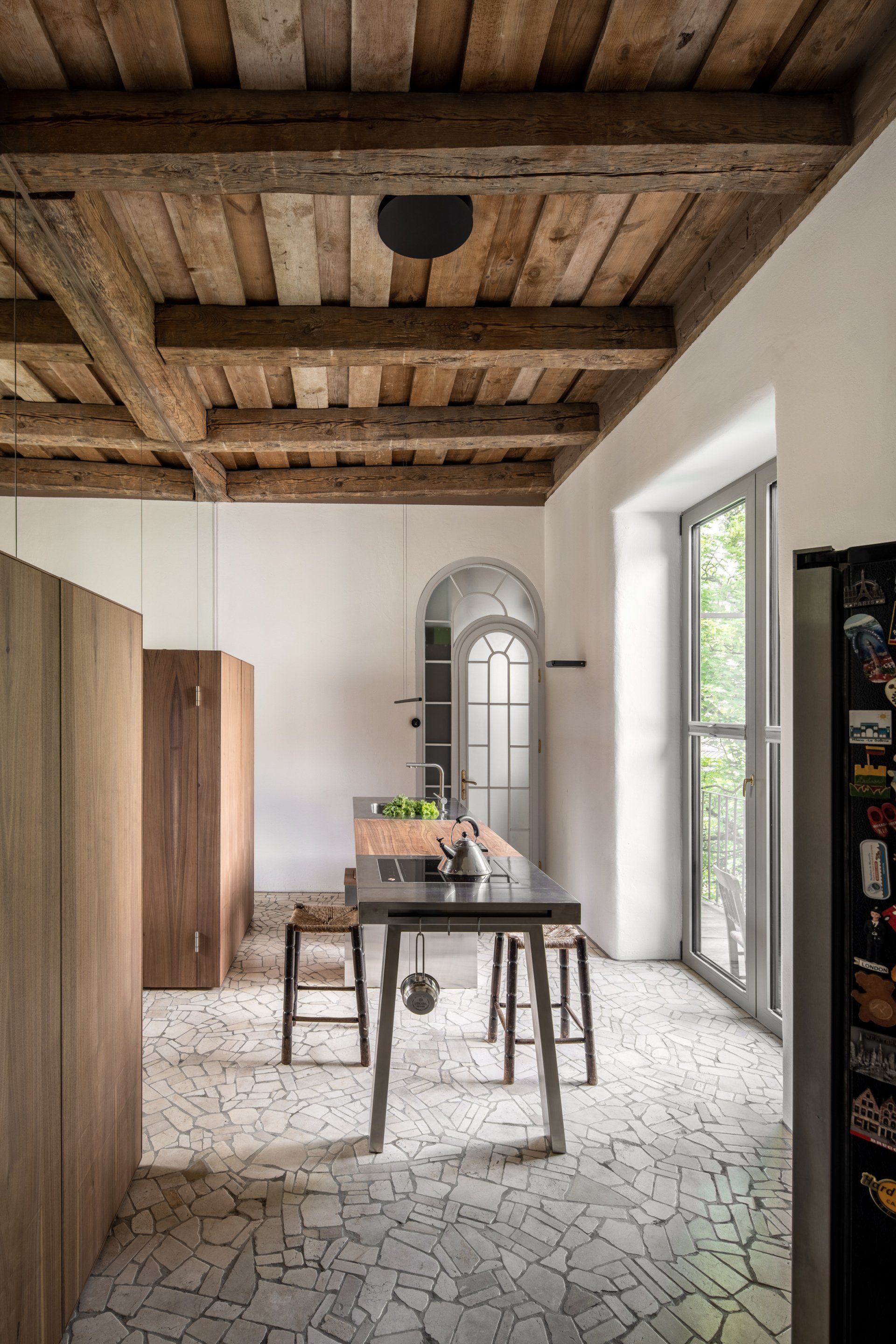 The apartment was in a sorry state, hence the cracked ceilings in the kitchen and in the living room had to be removed. Above those ceilings the old wooden beams were discovered; some of them have been kept while some were already rotten (as well as the kitchen floor), so the designers dismantled those parts and reinforced the structure. Having integrated underfloor heating, the designers covered the floor with natural marble tiles.
