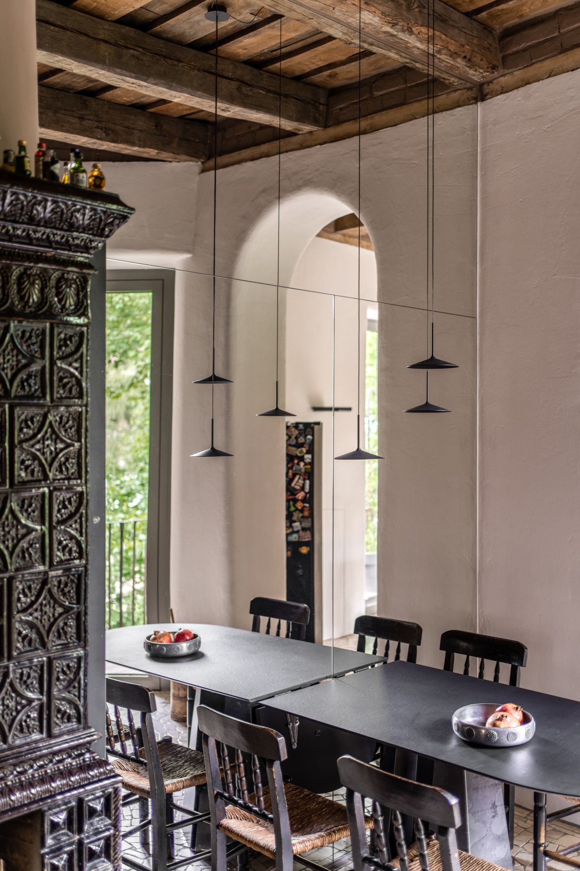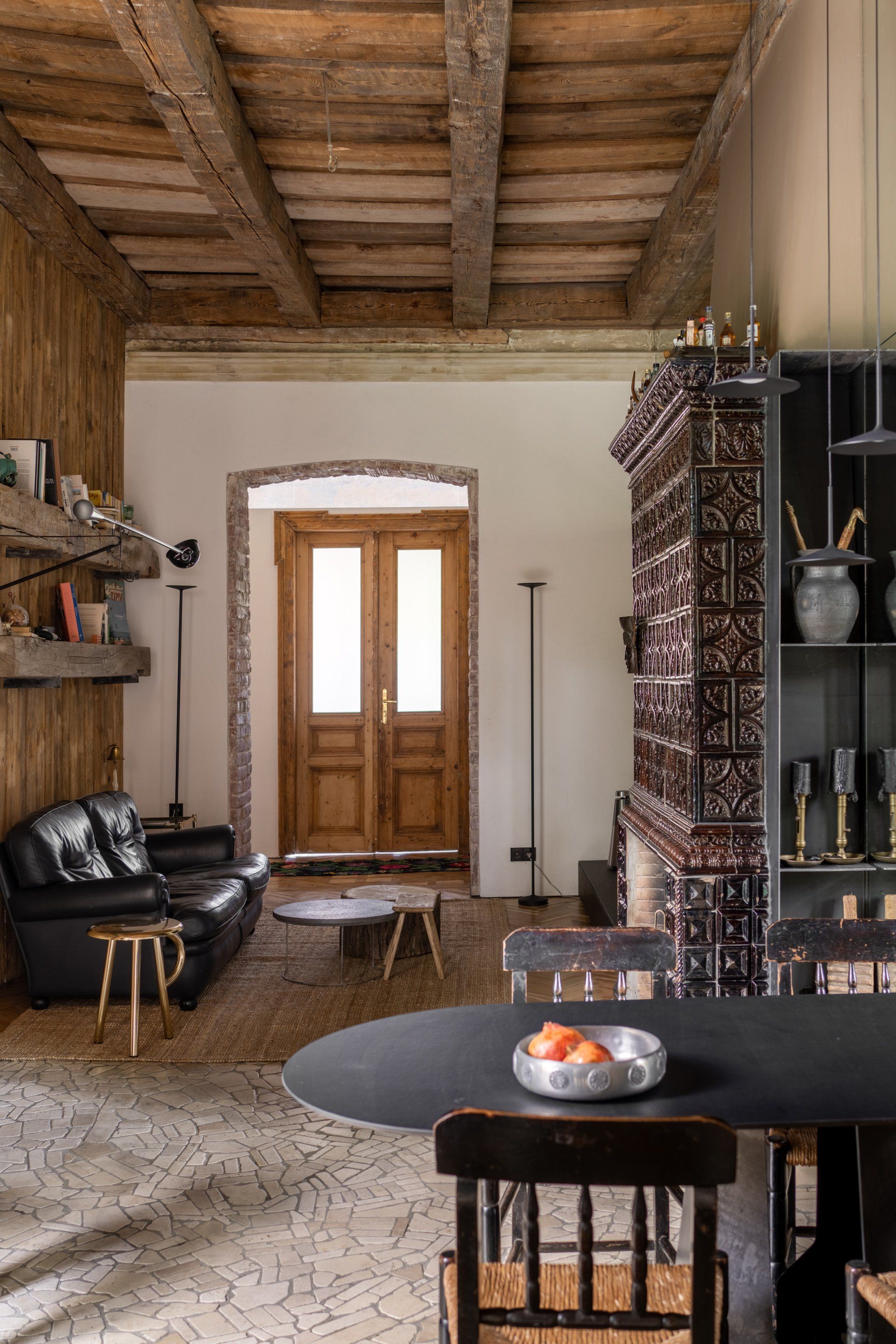 A historical stove from Levynskyi factory was reincarnated in a big open fireplace. It was done following a classic technology by Count Rumford, a British inventor, where a fire-place is not deep and its angled sides reflect heat into the room. It is not a common technol-ogy either in Ukraine, or in the neighbouring countries.