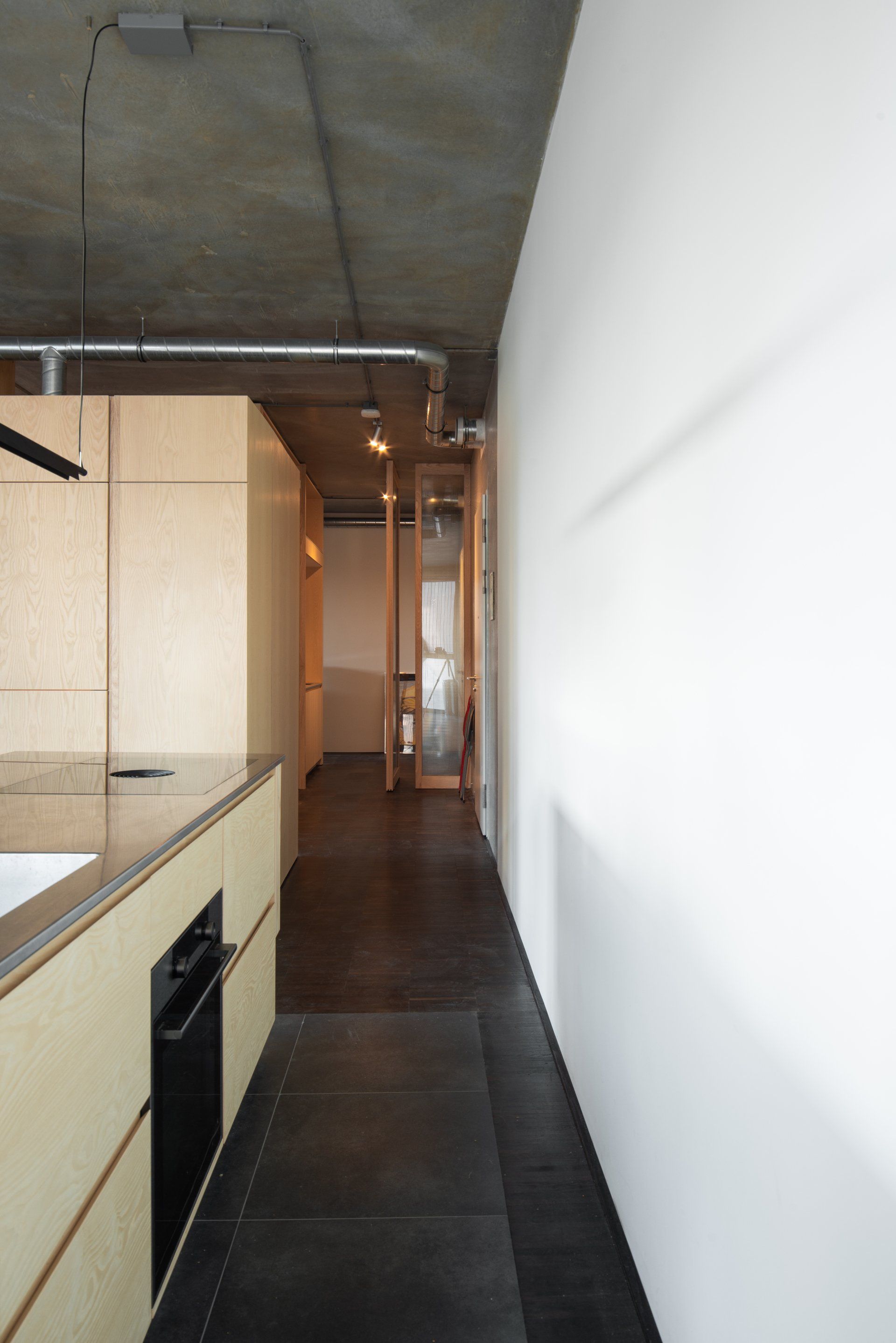 Responding to the simplicity of the casco, the boxes are carefully crafted. The scaled-up furnitures are covered with a refined ash finish. Contrasting with this delicate appearance, the concrete ceiling is left rough, as delivered, with ventilation and electricity services visible, displaying their technical ballet.