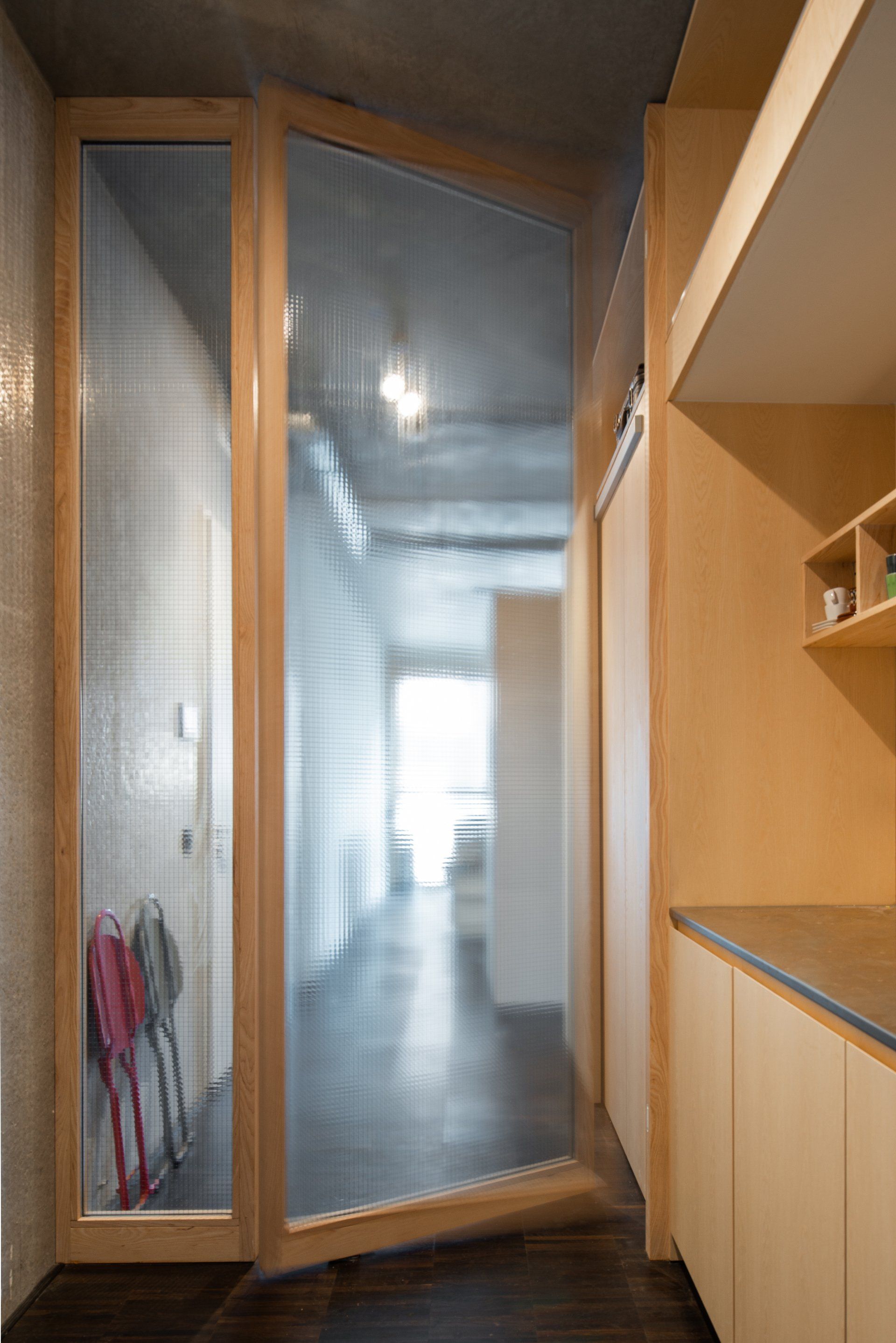 The third box defines the workspace and houses a closet, a storage room, a visitor’s toilet as well as a pantry and open shelves. Also designed to function as a fully autonomous guest room with shower and kitchenette, this space is marked by a wall, slicing the third box in its middle and topped with waffle-glass to remove visual barriers. A full height pivoting door connects the living and work functions.
