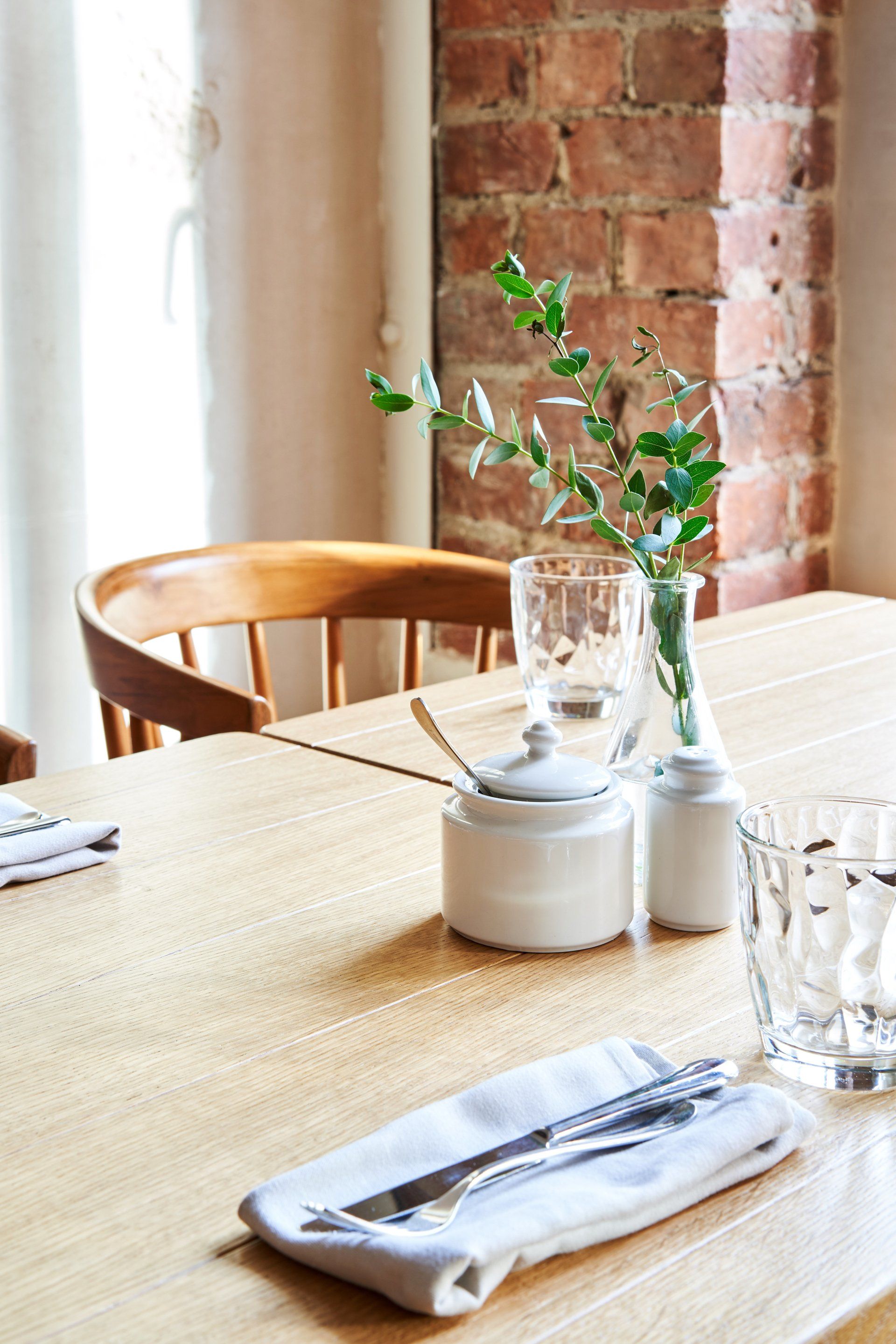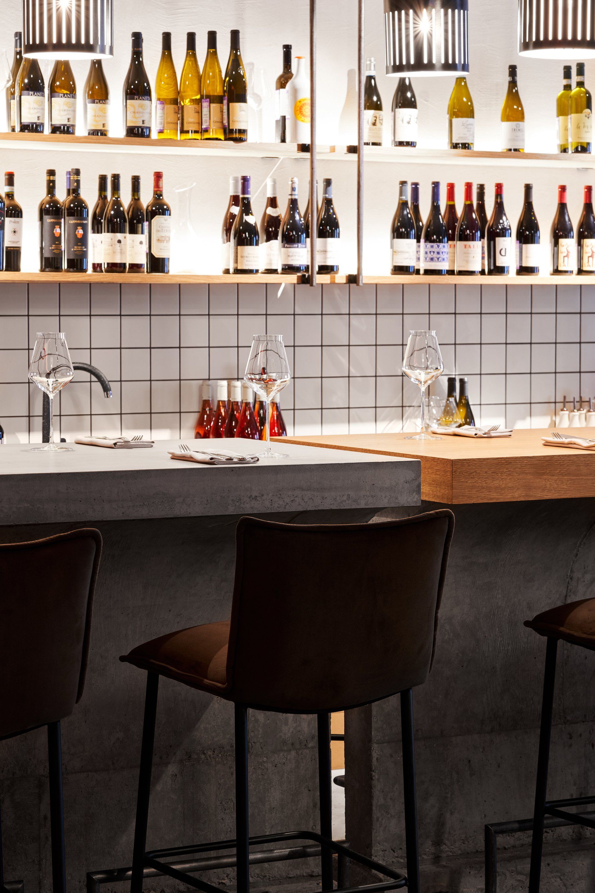 The restaurant has a farthest "wine room", which features is a common cast concrete table that can accommodate up to sixteen people. Nearby is a service desk, which allows for master classes, and conceptual sofa seating in front of it makes the room even more universal.