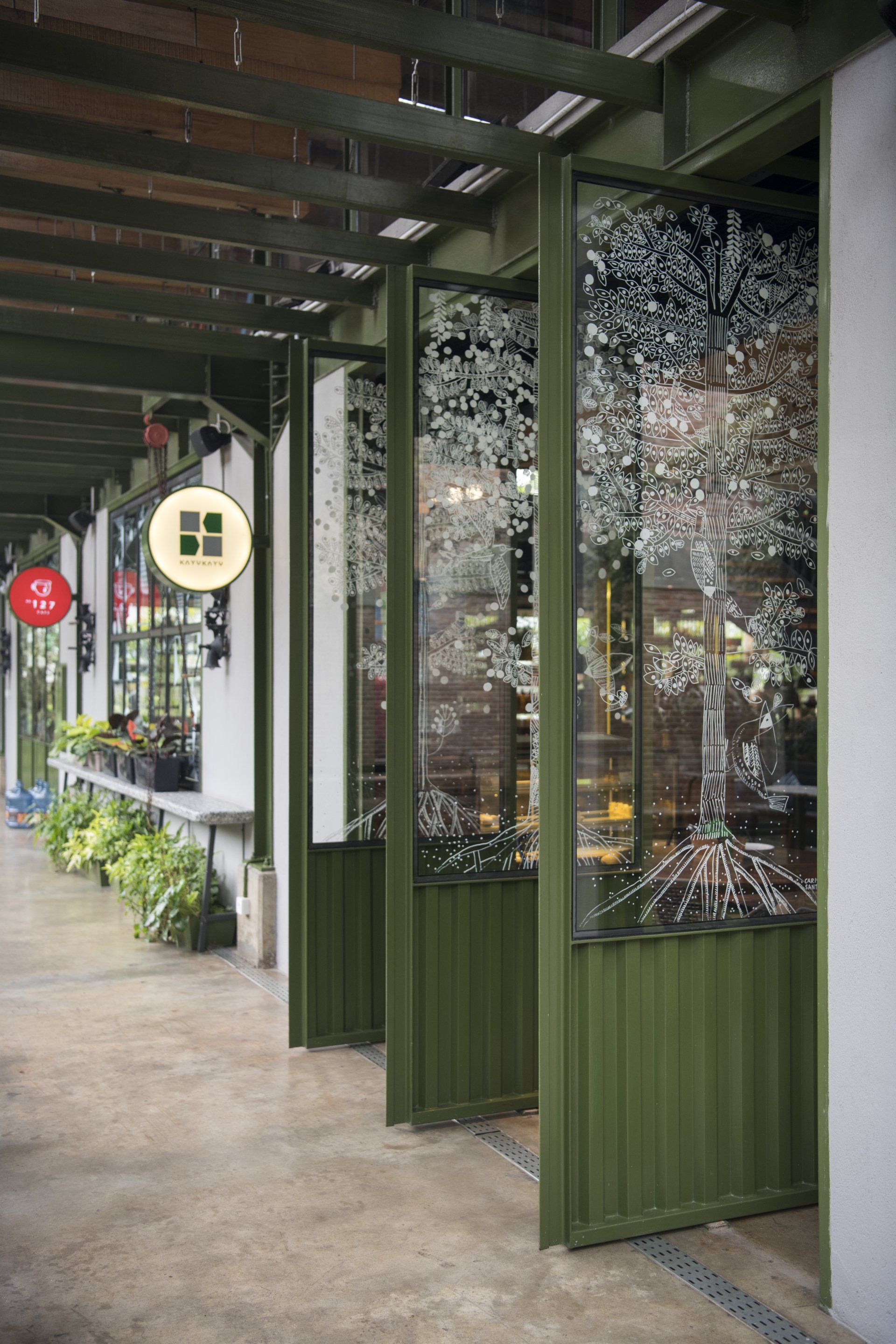 The facade is inspired by the variety of wood logs from the clients warehouse. These heavy logs are being displayed 4 meters above ground, hanging from a steel rod to give a lightness effect as customers walk underneath them as they enter the building. They also function as shading device for the west-facing facade and symbol for Kayu Kayu Restaurant.