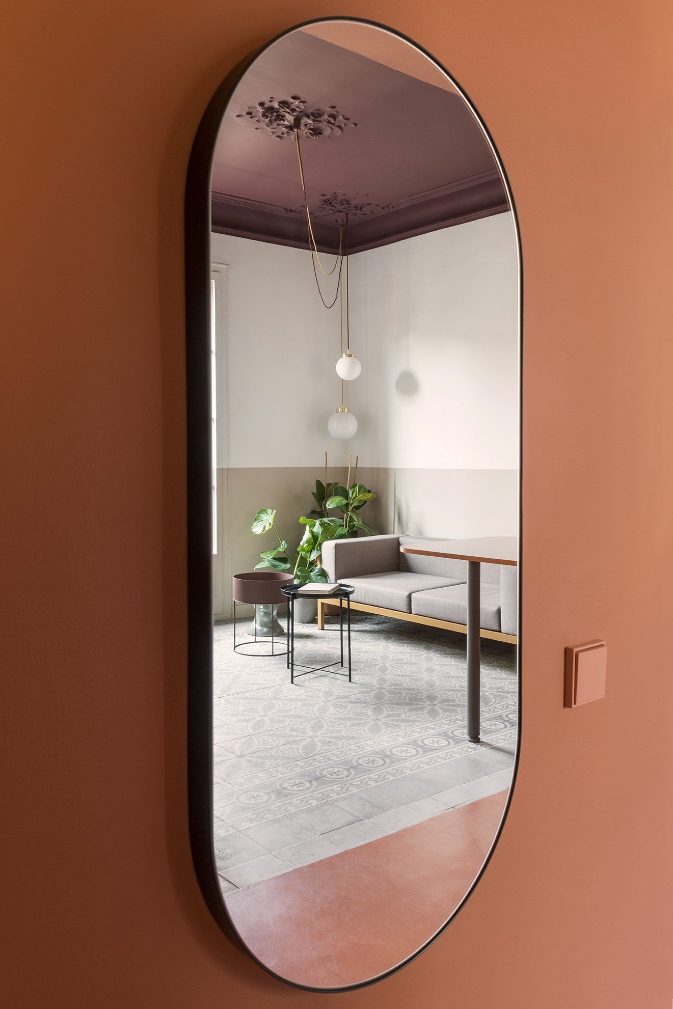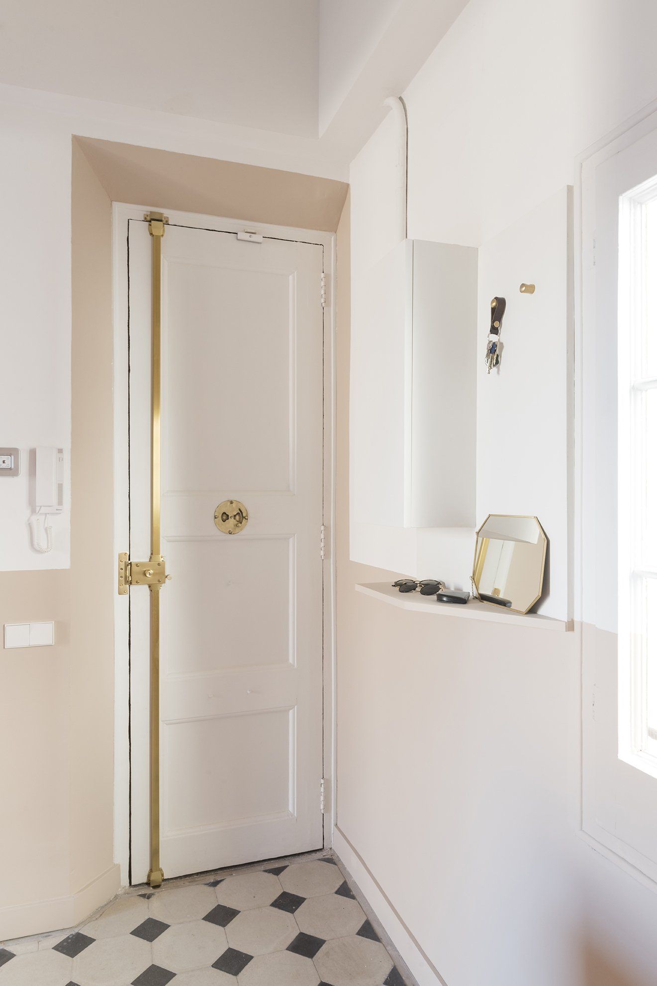 A holiday apartment allows for more daring colour choices. Architects picked a soft palette for the property. Outside of the brick-coloured core, walls are white to maximize light. Even so, a valance runs around walls, doors and windows, giving an artificial horizon, visually widening spaces, in an otherwise vertically proportioned property. This fringe has been chosen based on the spaces and in relation to the colourful, original hidráulico floors: a more neutral sand brings warmth through entrance and living (unifying the spaces on both sides around the the kitchen block), making the burgundy and greys shades of the living floor stand out.