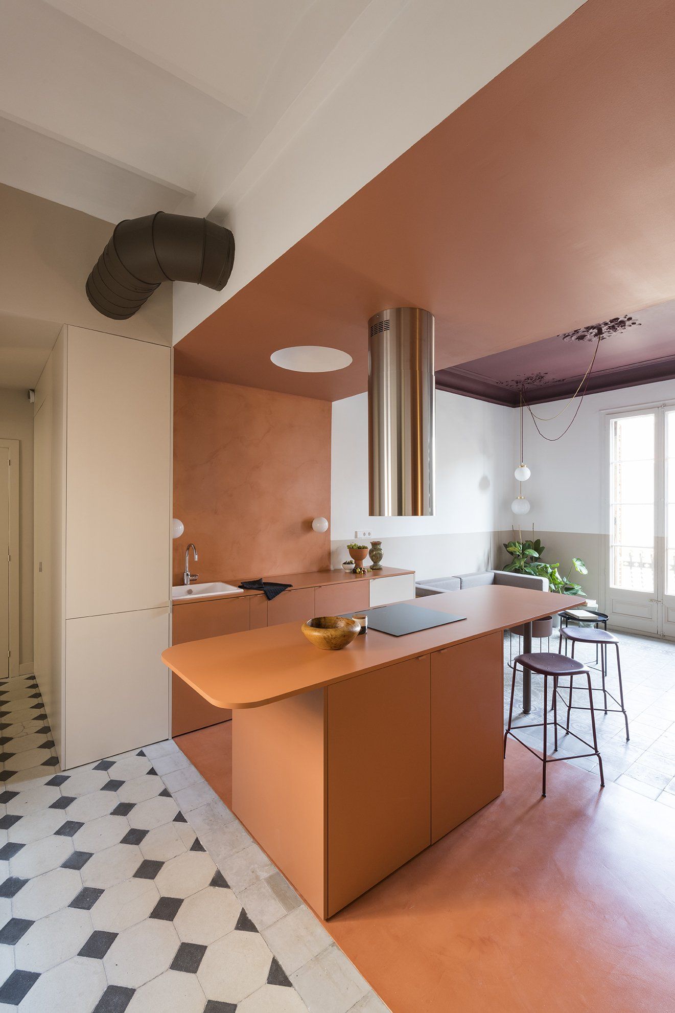 Micro-cement floor of the same hue cover three different types of tiles (the least interesting ones), unifying the block and highlighting the adjoining floors, of greater value, of entrance and living room. The same earthy tone is used for the micro cement backsplash wall, the ceiling, the kitchen cabinets including the long, roundedged central island, as well as for the studio area, desk and shelves. The result is a colour-block area that makes a distinctive statement at the core of the apartment. A long kitchen island doubles as dining table, in axes with the windows and the lane it faces onto. Shiny, steel, kitchen fan cylinder overhauls above the hobs. A bespoke, white plaster dome above the work area disguises a spotlight, replacing a celling lamp. Small globe appliques are placed on the backsplash.