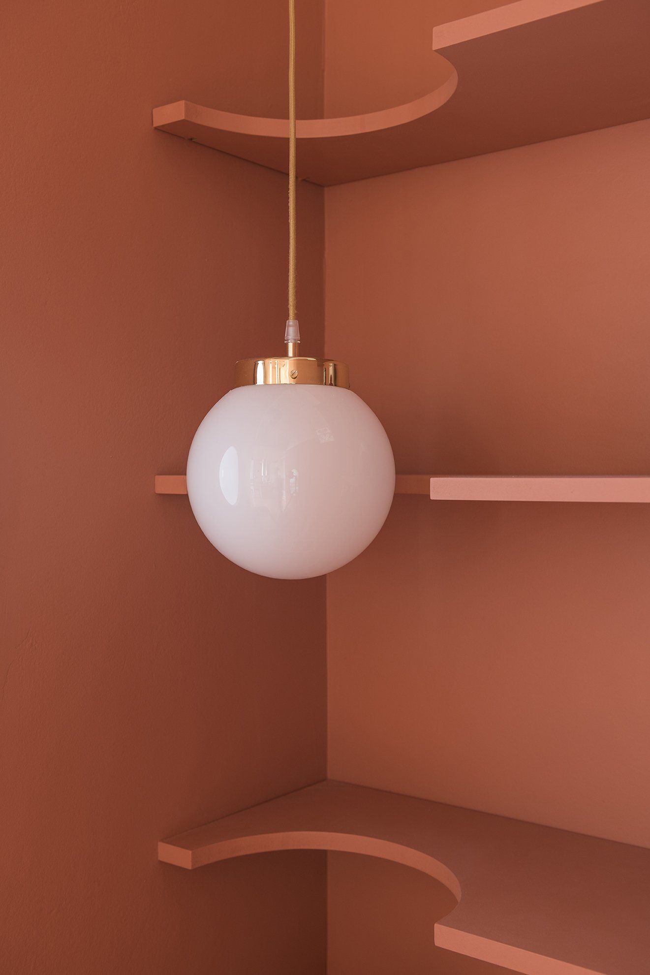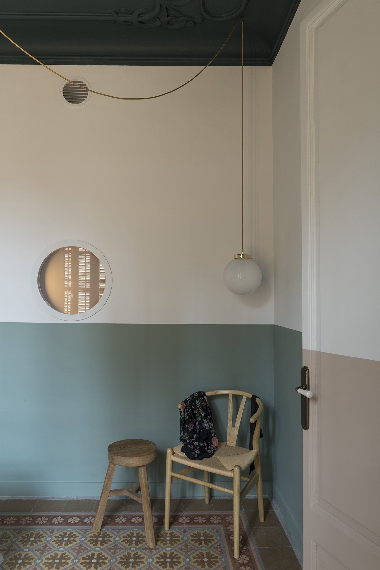 The studio area is nested in a recessed space opposite to the kitchen, with bespoke desk and shelves cut with a circular shape to allow a small globe pendant lamp to hang on them, all in the same colour. A porthole window punctures a wall, bringing a dash of natural light into the space.