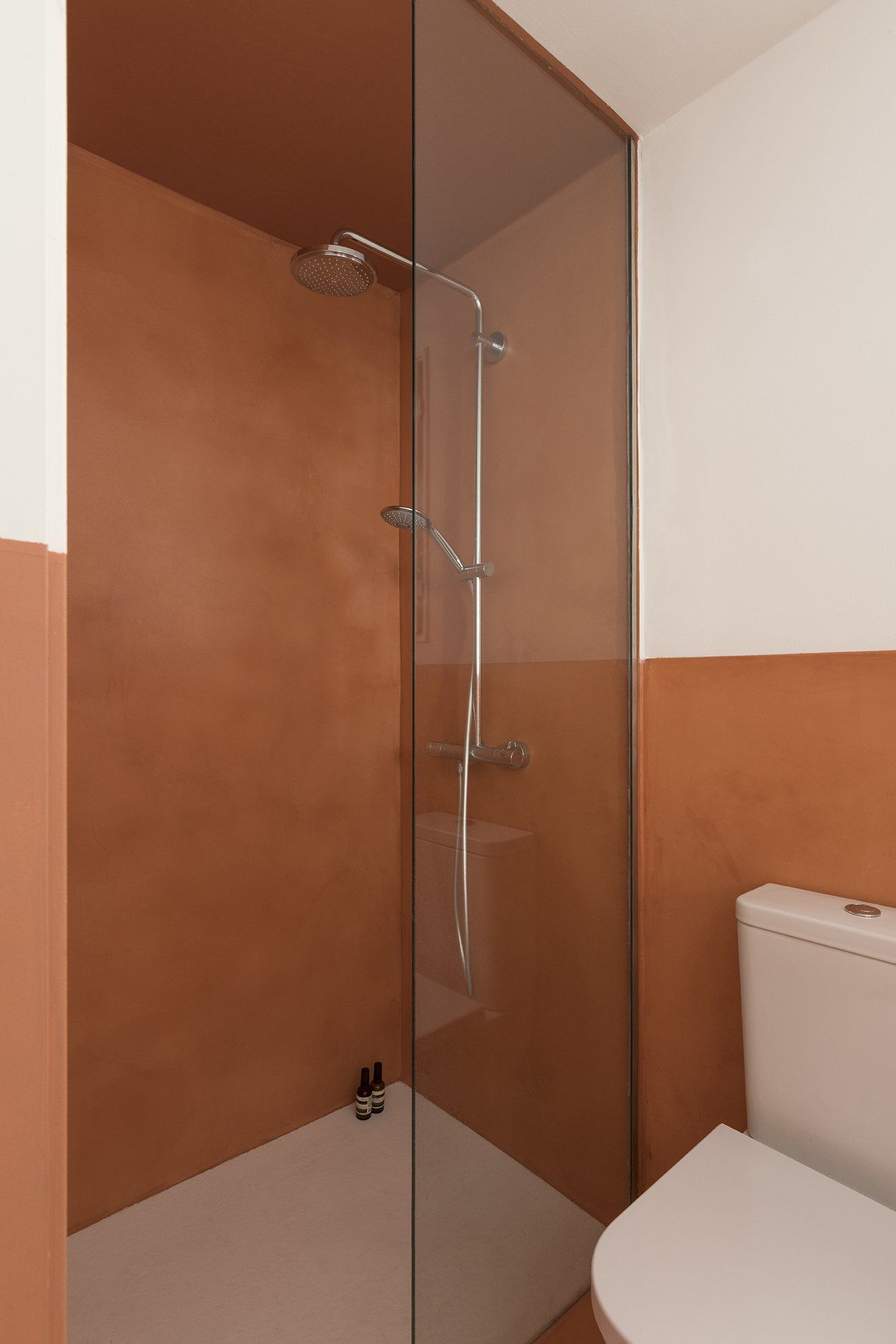 The bathroom is also treated with the brick-red micro-cement, again the valance and invading the shower space.