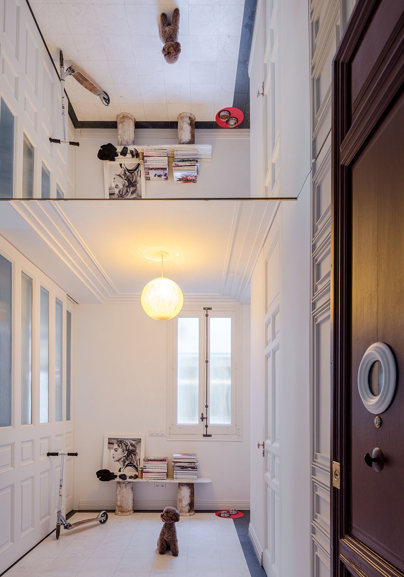 The second strategy seeks to carry out spatial operations of great depth in accordance with contemporary lifestyles, such as establishing continuous and fluid connections between all the rooms of the house thanks to the demolition of partitions and the atomization of certain pieces. As, for example, the bathrooms where the toilet is separated from the shower and sink, blurring the boundaries between public and private, or the interior and exterior. Mirrors have also been introduced, strategically placed, which are intended to generate optical illusions that duplicate and expand the rooms.