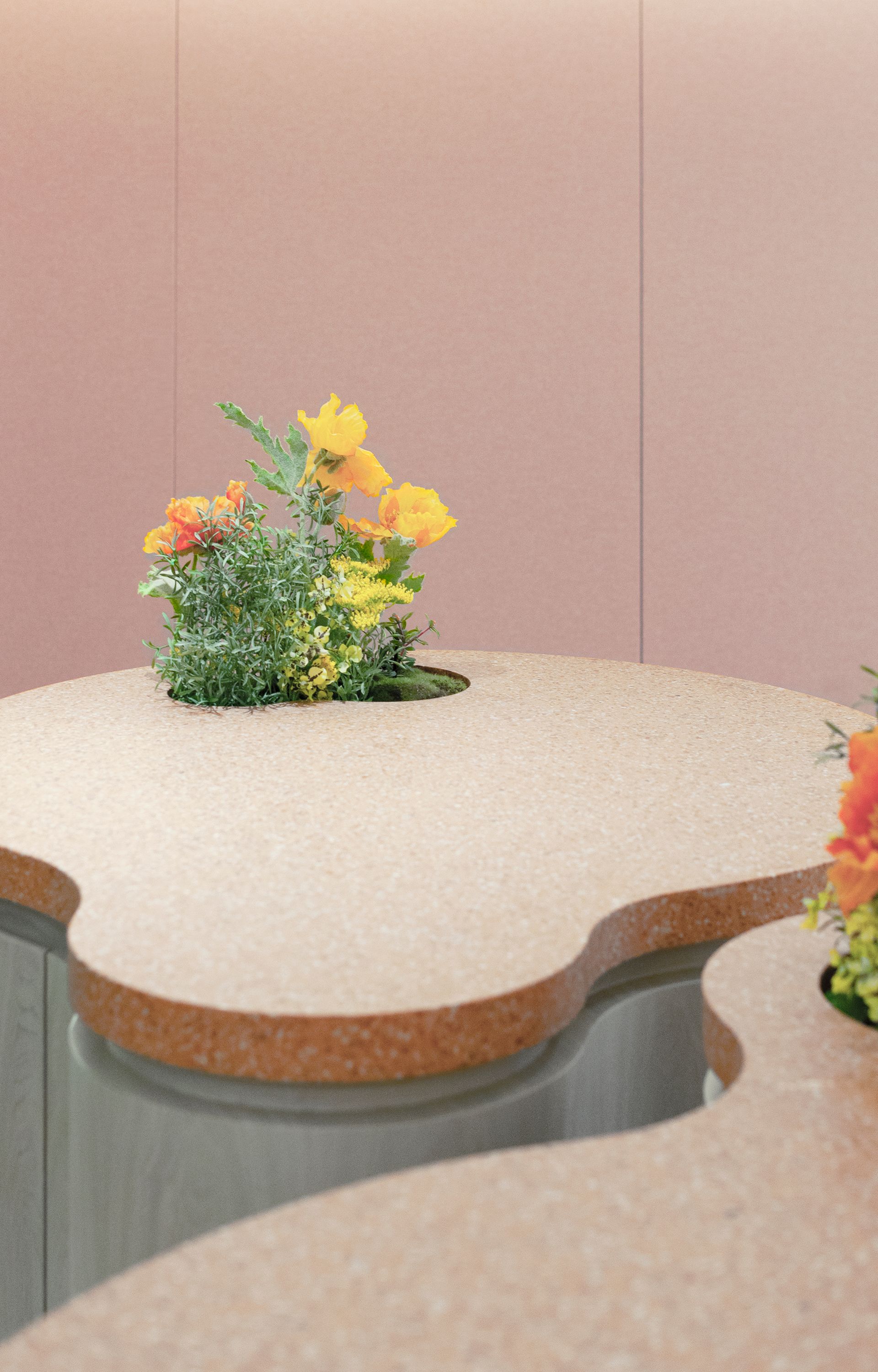 “Our signature curvy ‘bean’ tabletops have always been an organic ‘landscape’ for various functions – and now for a heightened sense of wellbeing and bodily experience for the users with floral arrangements integrated into the surface!”