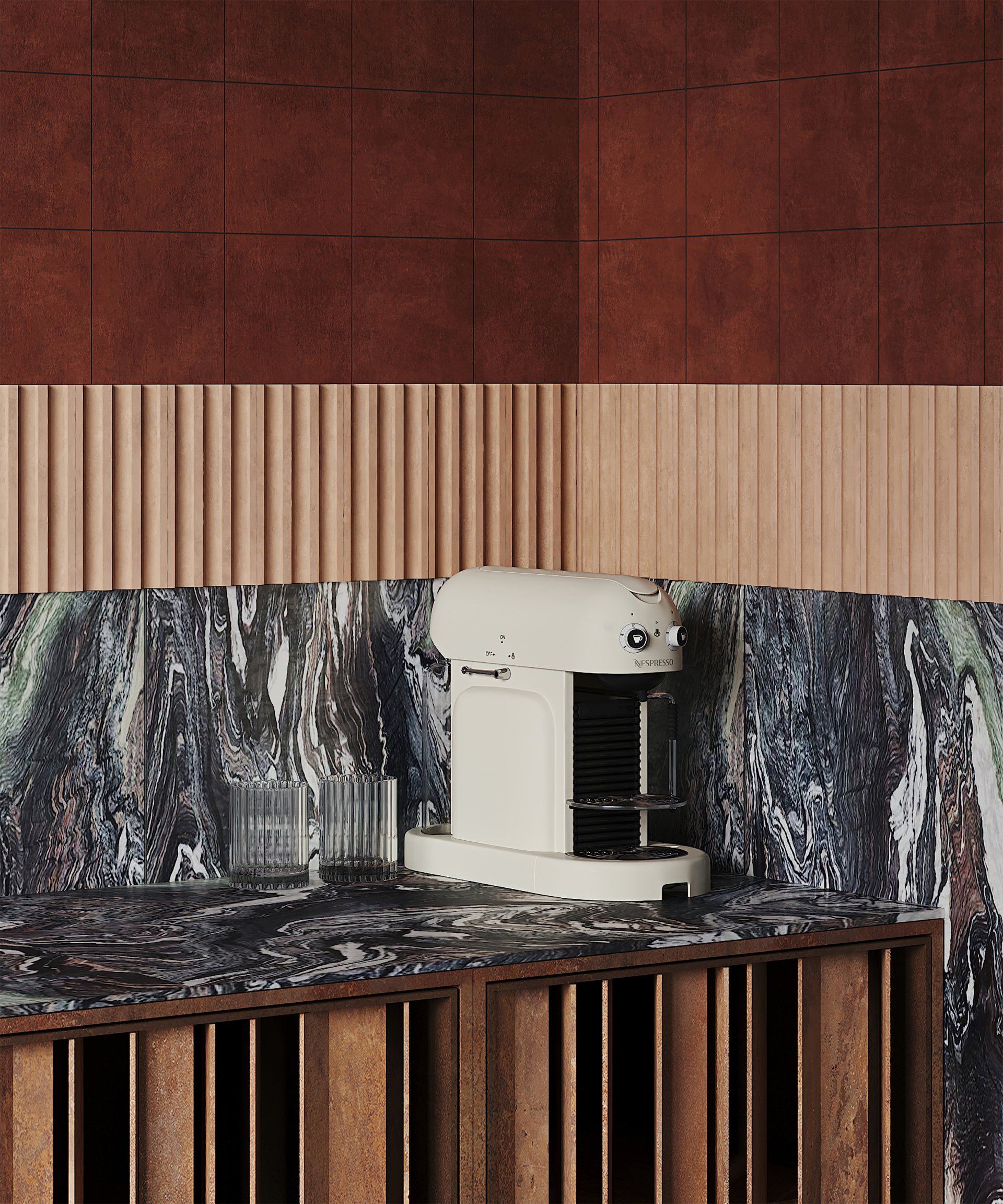 Flooring: QuickShip A01502 Monochrome by Interface / Tiles: Bio-concrete by Irene Roca Moracia x LVMH / Wijnant Refrigerator by Officine Gullo