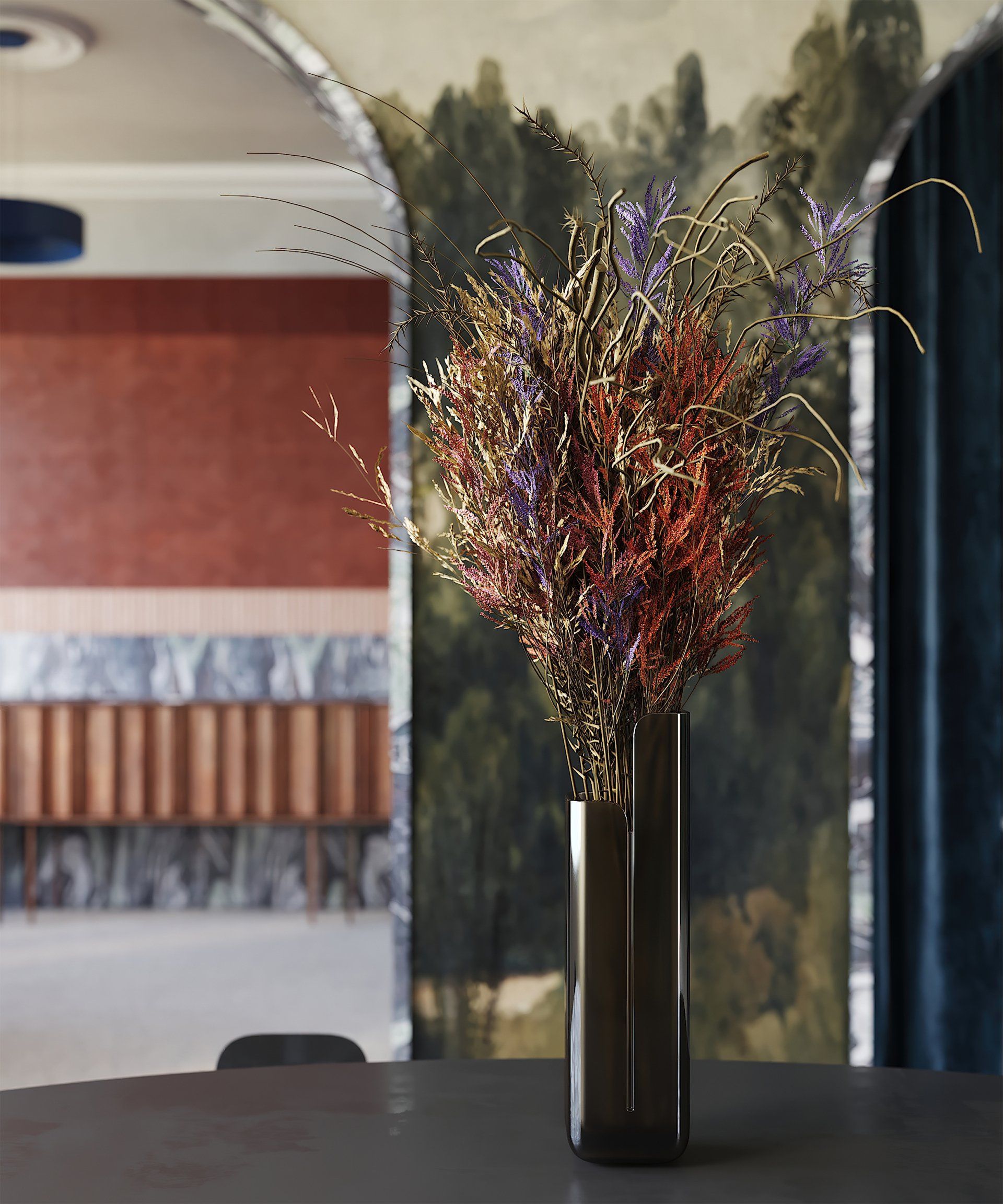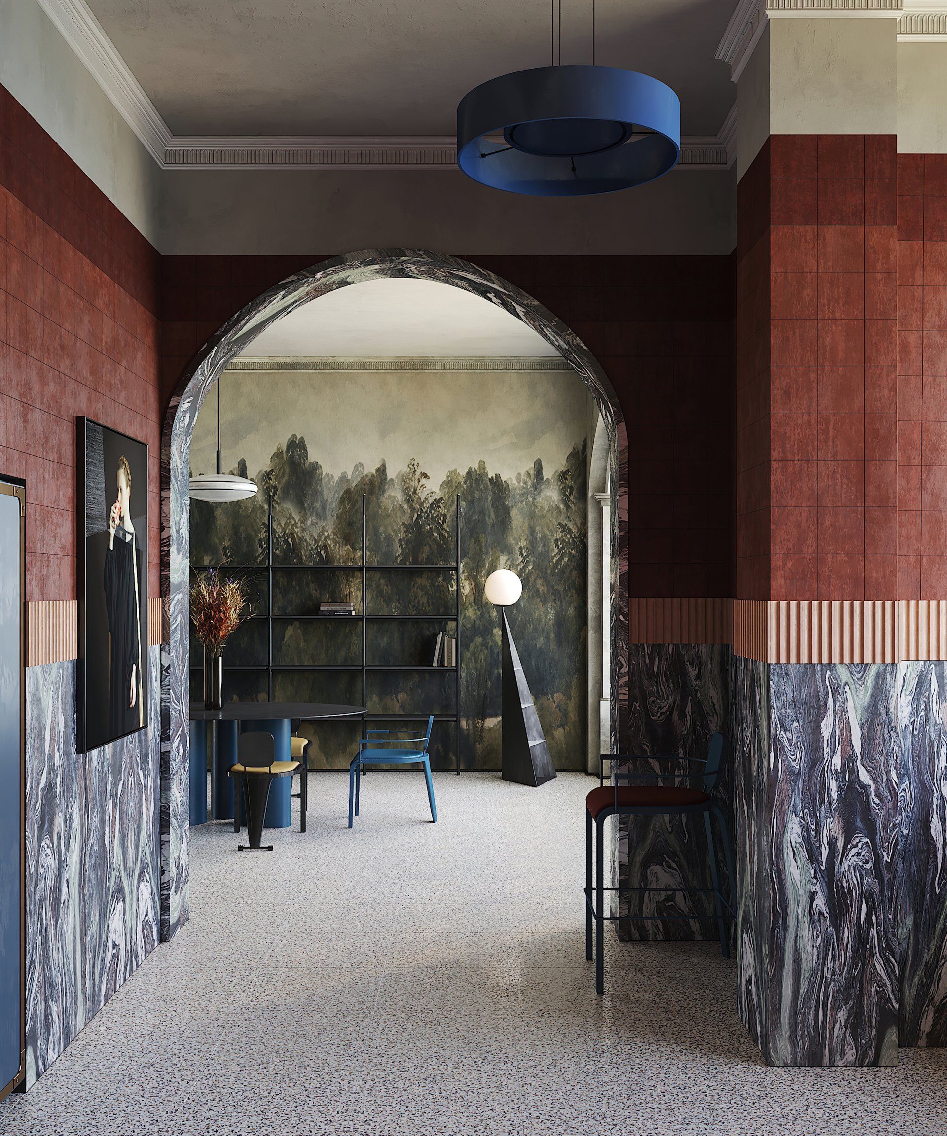 Characterized by an eclectic sequence of colors, stretching from the walls to the metal joinery and plaster cornices, the carpets and curtains, to a harmonious selection of furniture, inspired by the Art Deco and Pop Art movements of the Memphis Group, no only for its striking primary colors, synthetic materials such as laminate and terrazzo, and crazy geometry, also for its iconoclastic cheekiness.