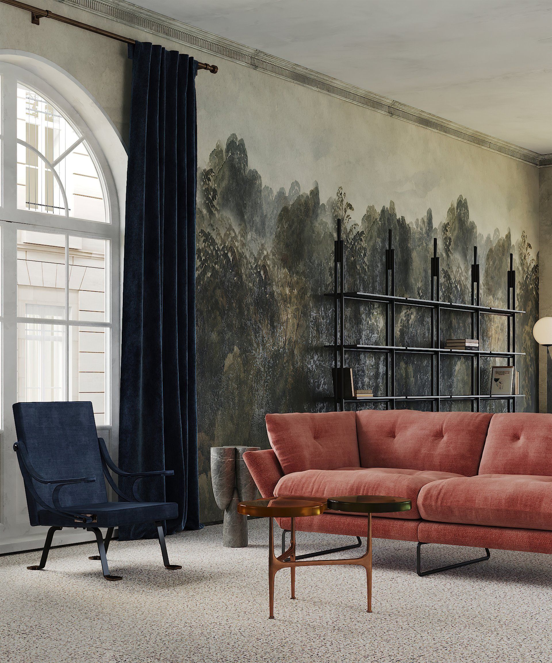 Flooring: QuickShip A01502 Monochrome by Interface / Wallpaper: Bellagio by Glamora / Lighting: Bonhomme fllor lamp by Atelier Areti; ØS1 Pendant by Shade Lights / Shelving: Jack by B&B Italia / Chairs: Rock by Da A Italia / Sofa: New York Suite by Saba Italia / Table: Tube by Da A Italia / Armchair: Digamma by Santa&Cole / Coffee table: Agatha 3 top by Draga&Aurel