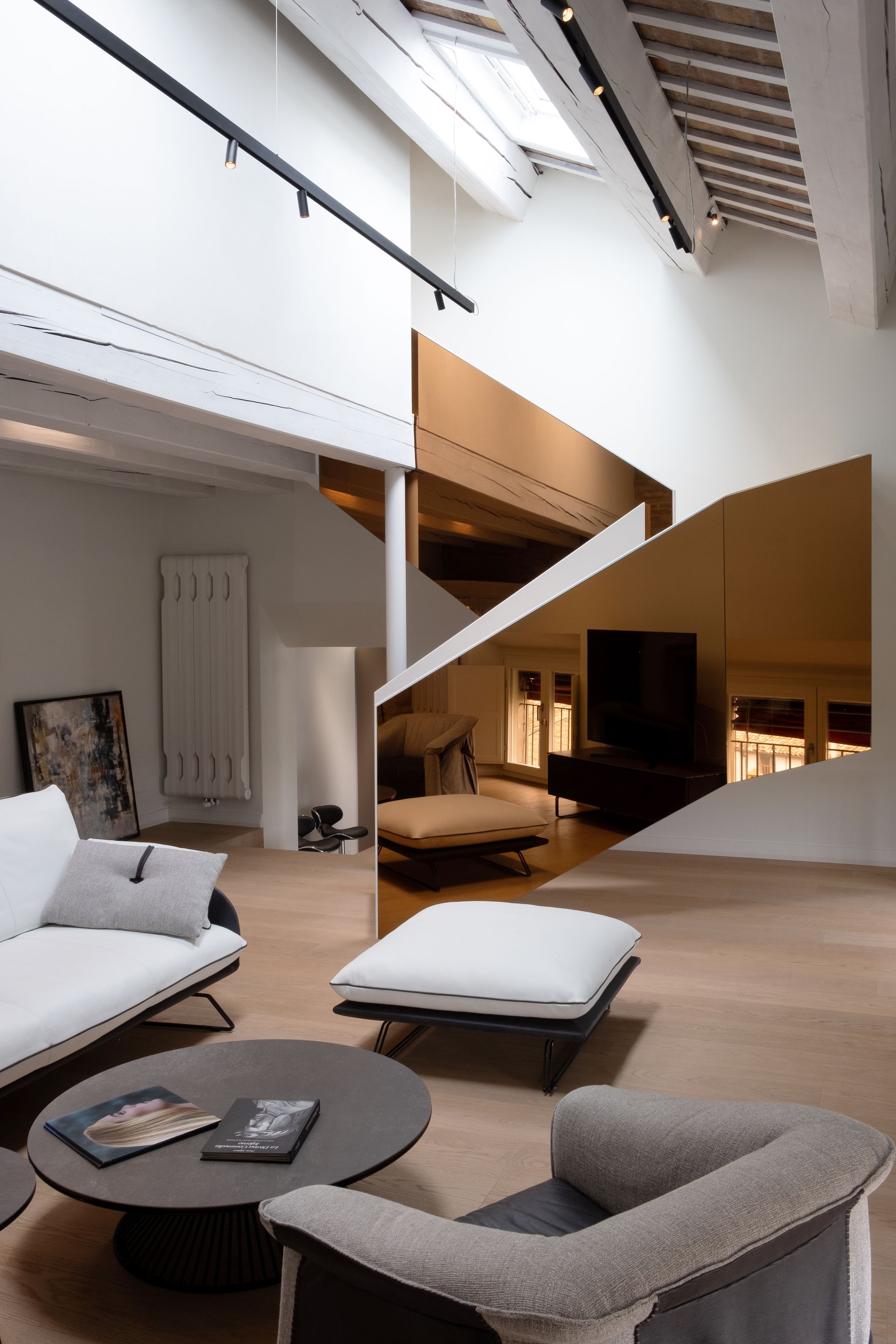 The protagonist of this captivating interior, the staircase is conceived as a sculpture, a succession of sharp surfaces in constant tension, the focal point of the progression of spaces. Its plasticity is emphasized by the surfaces of golden mirrors that cover the parapet, constantly capturing gazes and being perceived as a living being in constant motion thanks to the play of reflections and lights. The double height of the living room section, which constitutes its starting base, only serves to enhance the described characteristics, along with the fact that upon entering the apartment, it is the first guest to welcome us and give us a sense of the strong and defined character of all other rooms.