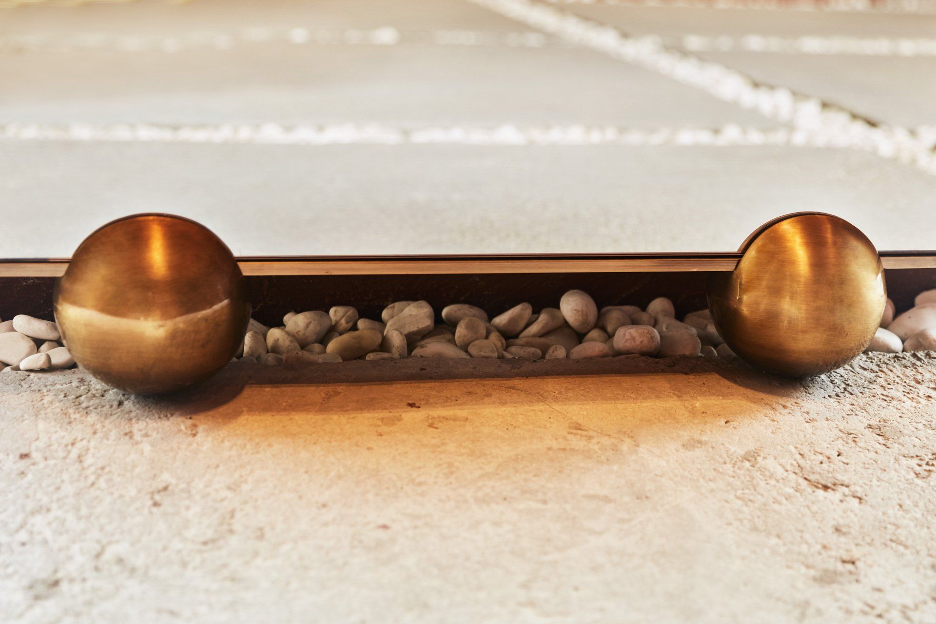 To bring the spectacular Bodrum exterior location in, the floor is divided into concrete squares with pebble borders. Floor-mounted brass clothes rails, accessories, hooks and oversized mirrors with rounded brass feet create an interesting contrast to the materials used in the design scheme, referencing the brand's luxurious style.