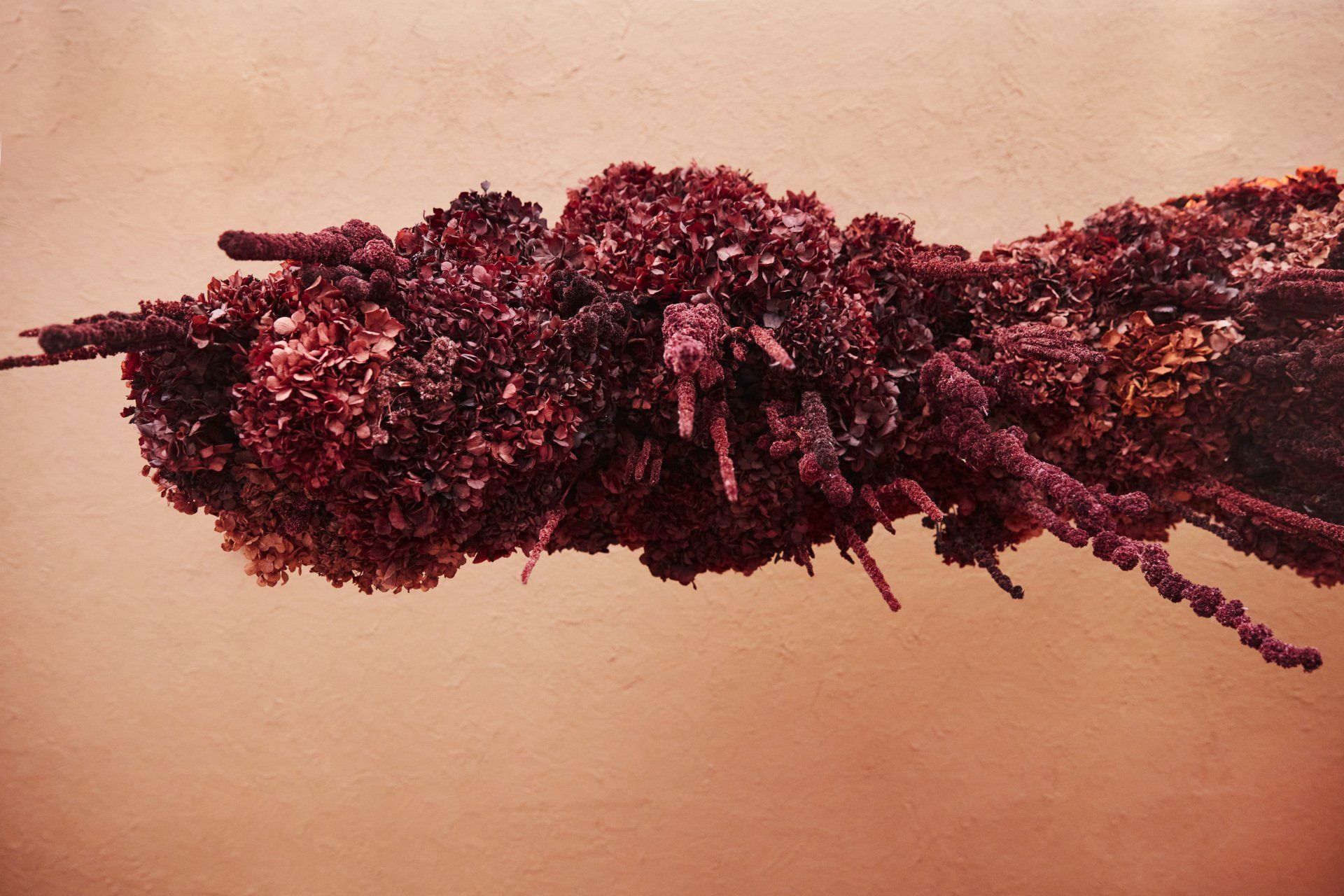 One of the focal points in the space is a is a botanical sculpture designed by Turkish flower artist Yunus Karma. Boasting a spectacular mix of hydrangea, amaranthus and bear grass, the art piece is suspended from the ceiling and its bright combination of burgundy, pink and yellow tones perfectly offset the terracotta colour scheme and complements the brands sumptuous clothing and accessories.