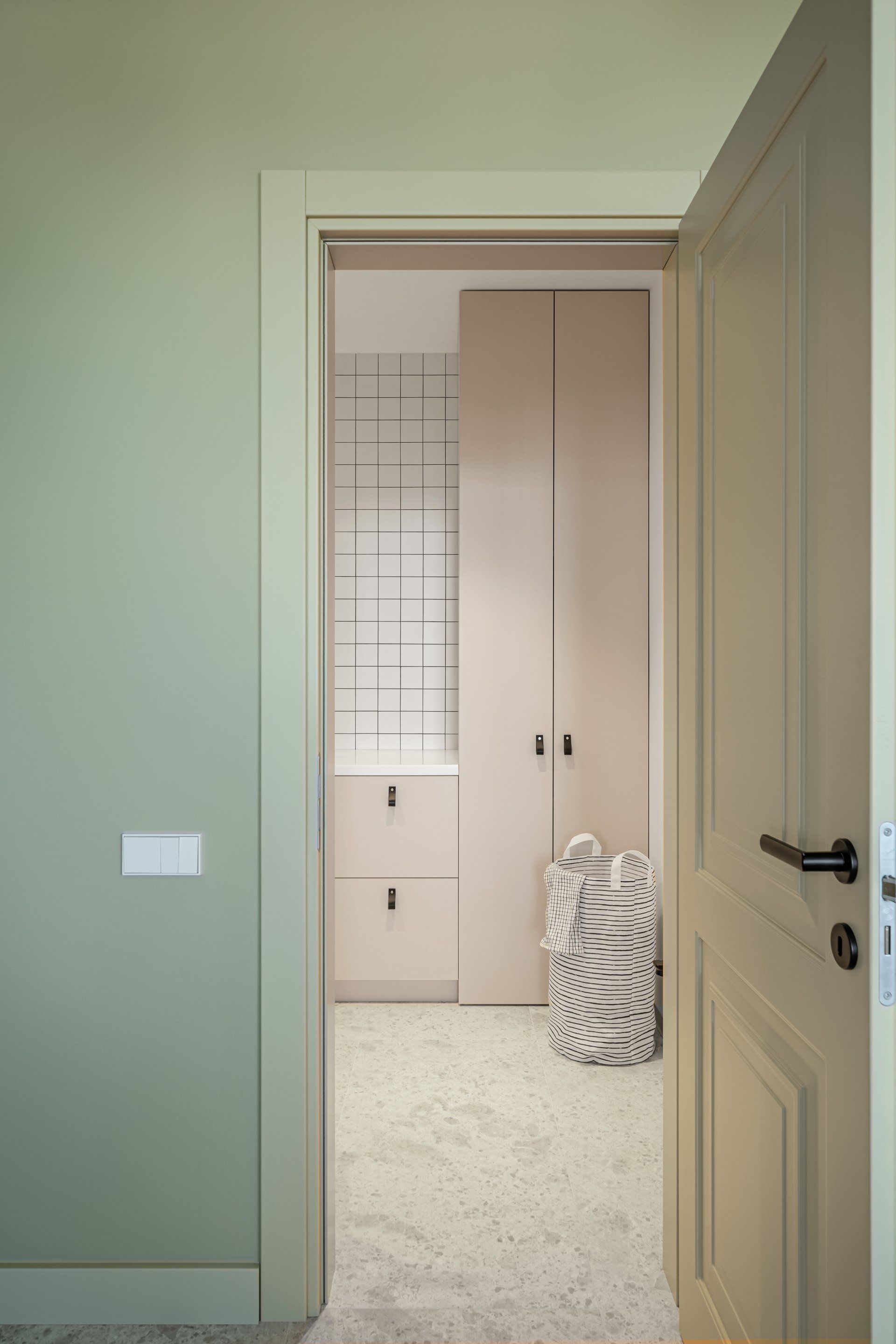 The master zone located in the far part of the apartment and combines the main bathroom, closet and a spacious bedroom with a living room. The warm sandy palette of the bedroom gives the room extra coziness, and a bright dresser from TREKU became its accent.