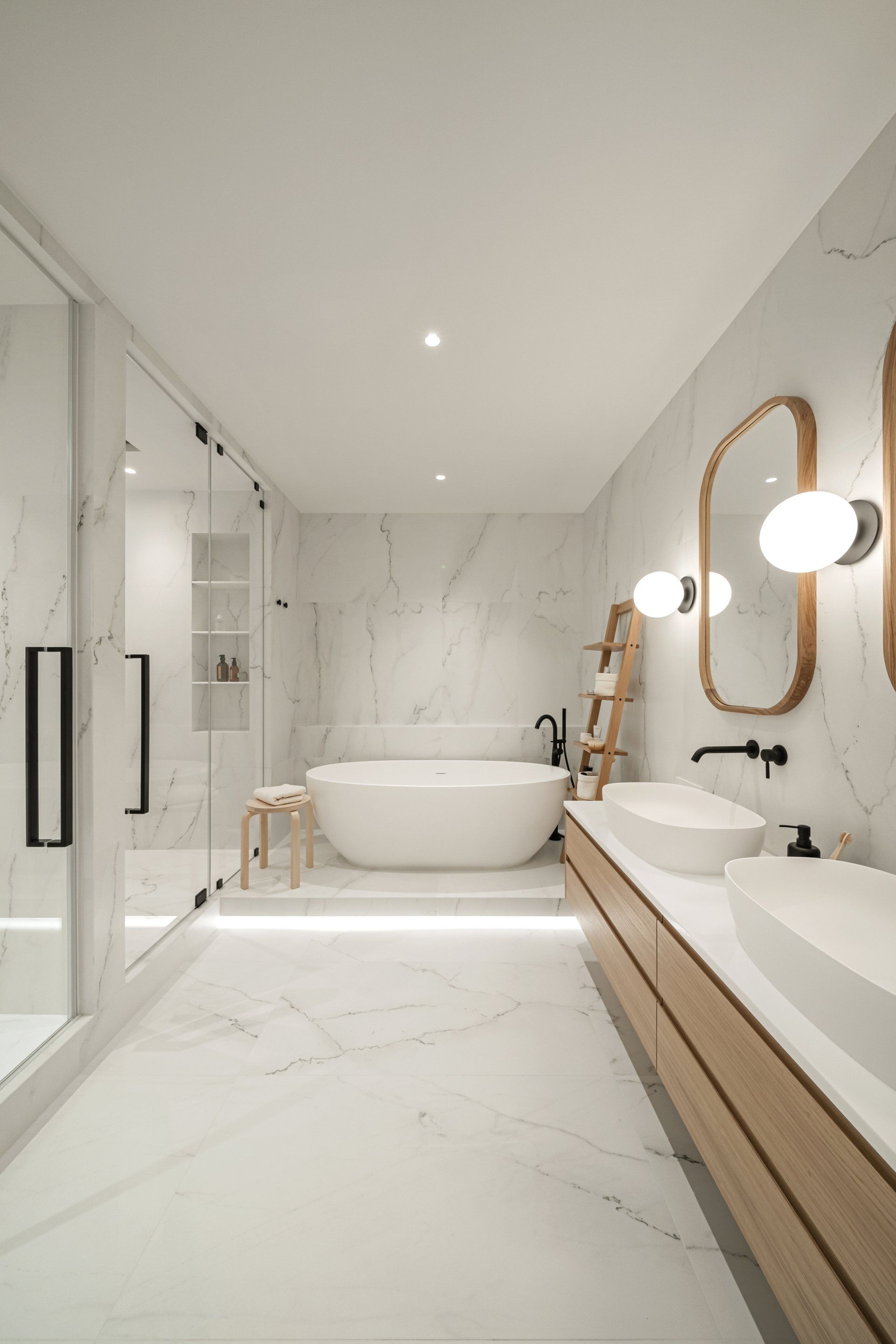 The main bathroom decorated in the general style of the apartment in light colors with wooden furniture elements and black sanitary fixtures.