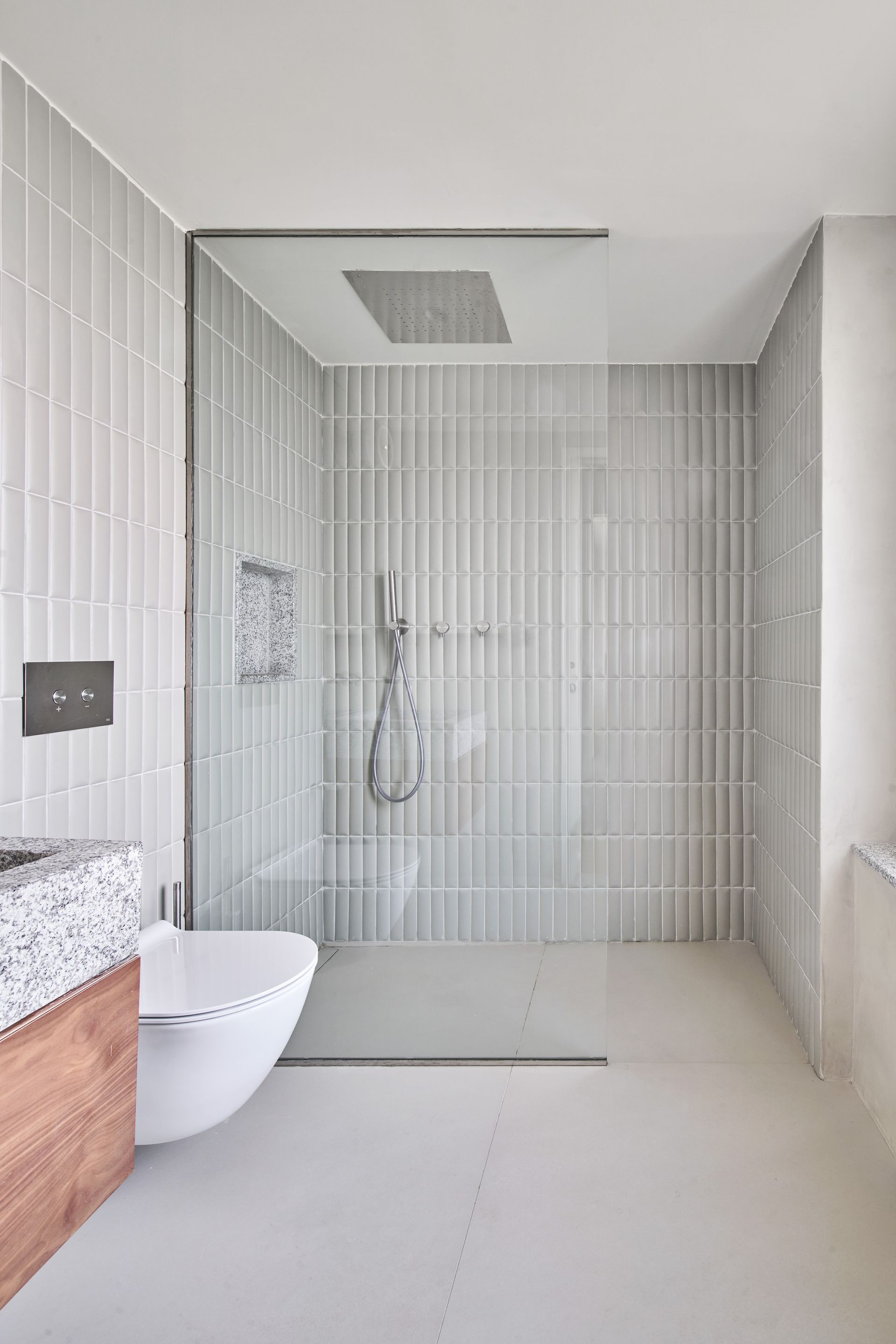 Wooden window frames were held to be worth saving, otherwise substituting all finishings. Natural materials such as oak and teak pavements, marble and granite countertops or ceramic coverings were used throughout the flat. Private rooms, all of them en-suite, were grouped along the perimeter, surrounding the completely open day area. All furniture such as closets, low tables, working desks and extra-large individual beds were custom designed and fitted along the walls conferring a strong feeling of spaciousness.