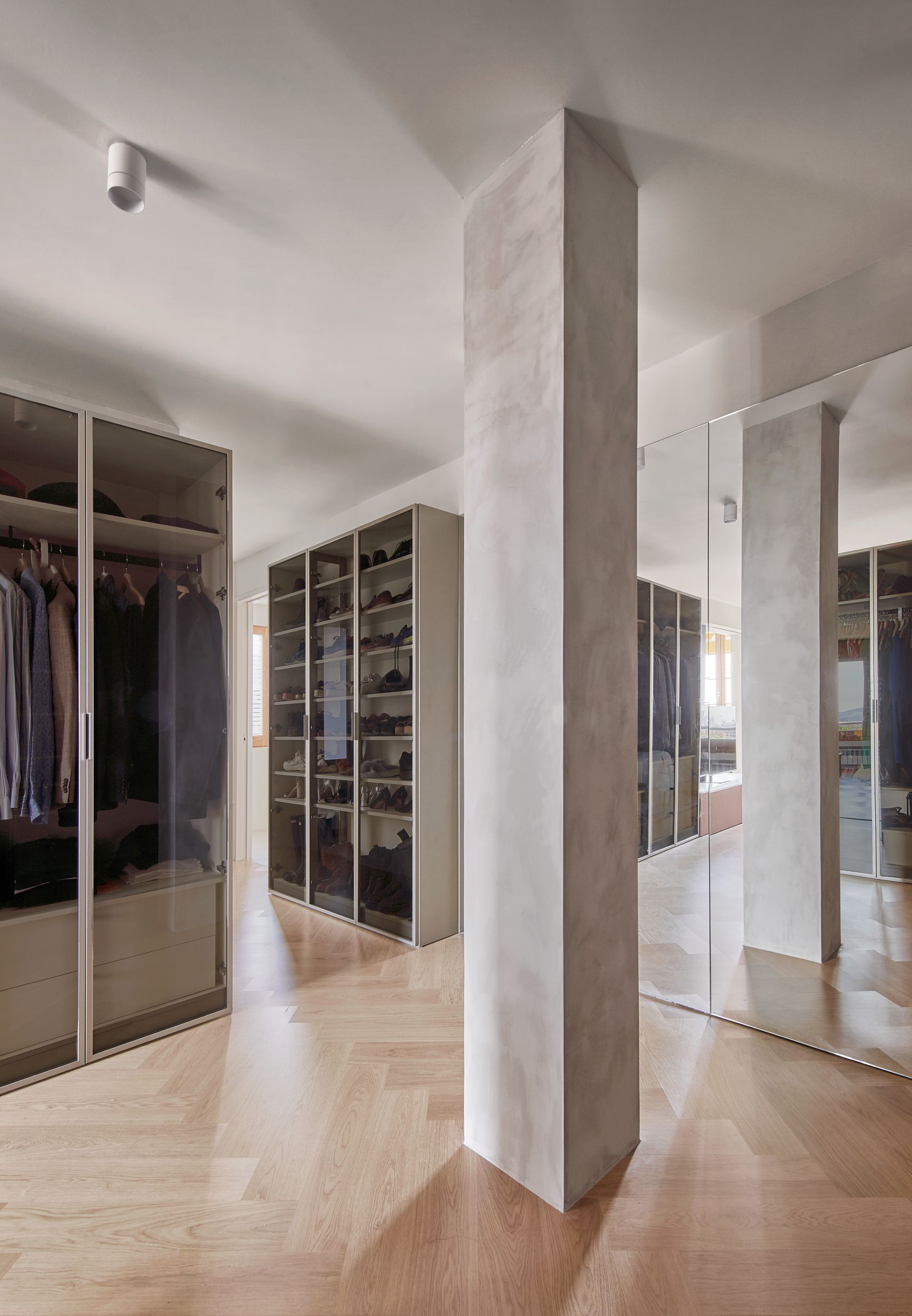 The principle of interlinked programs is also to be found within the master bedroom, where dressing room, bedroom and studio share an open plan, structured only by detached wardrobes and sliding partitions. Large floor to ceiling mirrors combined with reflective smoked glass doors create a geometric mirage in the walk-through closet.
